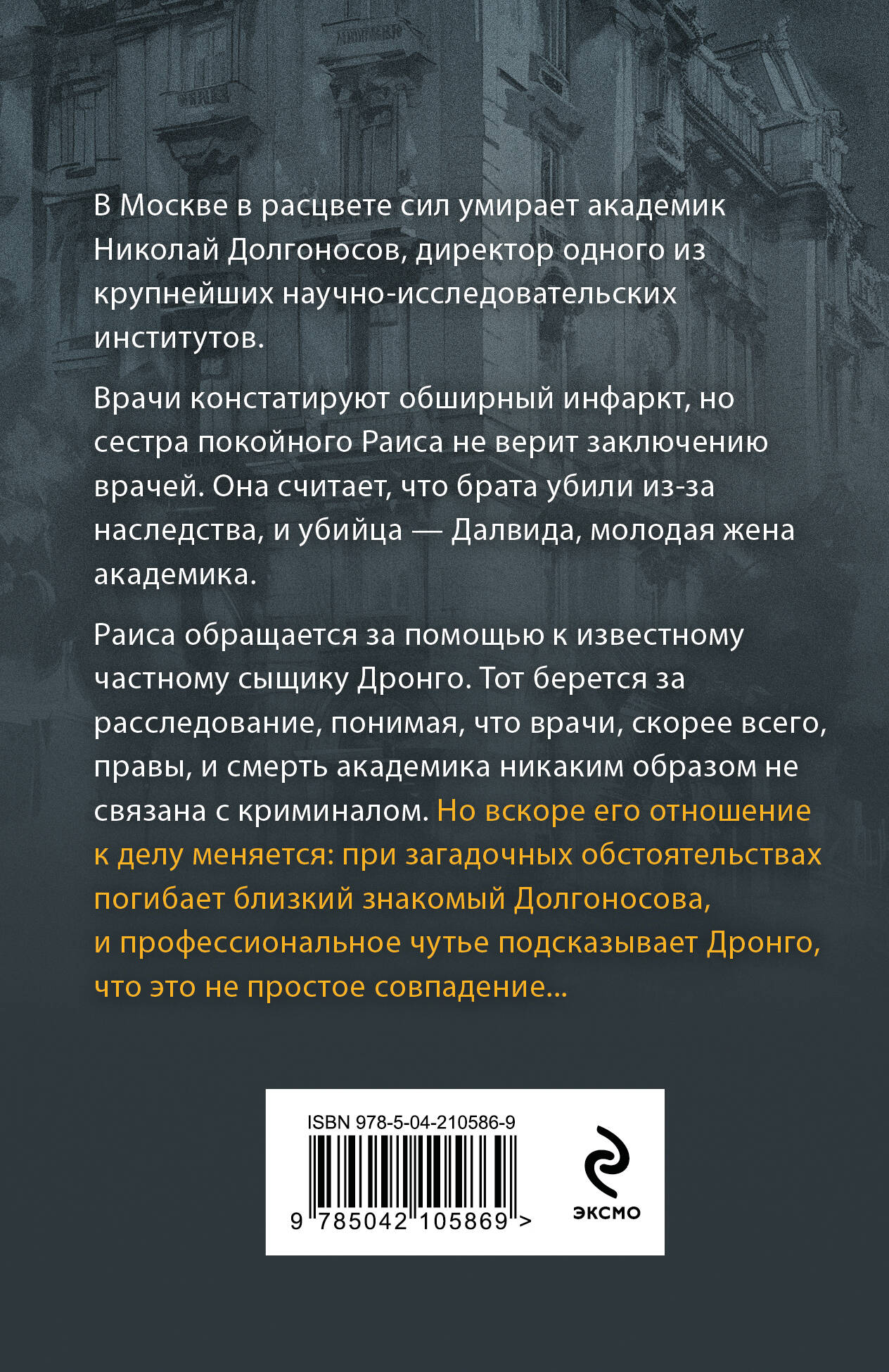 В Москве в расцвете сил умирает академик Николай Долгоносов, директор одного из крупнейших научно-исследовательских институтов. Врачи констатируют обширный инфаркт, но сестра покойного Раиса не верит заключению врачей. Она считает, что брата убили из-за наследства, и убийца - Далвида, молодая жена академика. Раиса обращается за помощью к известному частному сыщику Дронго. Тот берется за расследование, понимая, что врачи, скорее всего, правы и смерть академика никаким образом не связана с криминалом. Но вскоре его отношение к делу меняется: при загадочных обстоятельствах погибает близкий знакомый Долгоносова, и профессиональное чутье подсказывает Дронго, что это не простое совпадение...| Издательство | ООО "Издательство "Эксмо" |