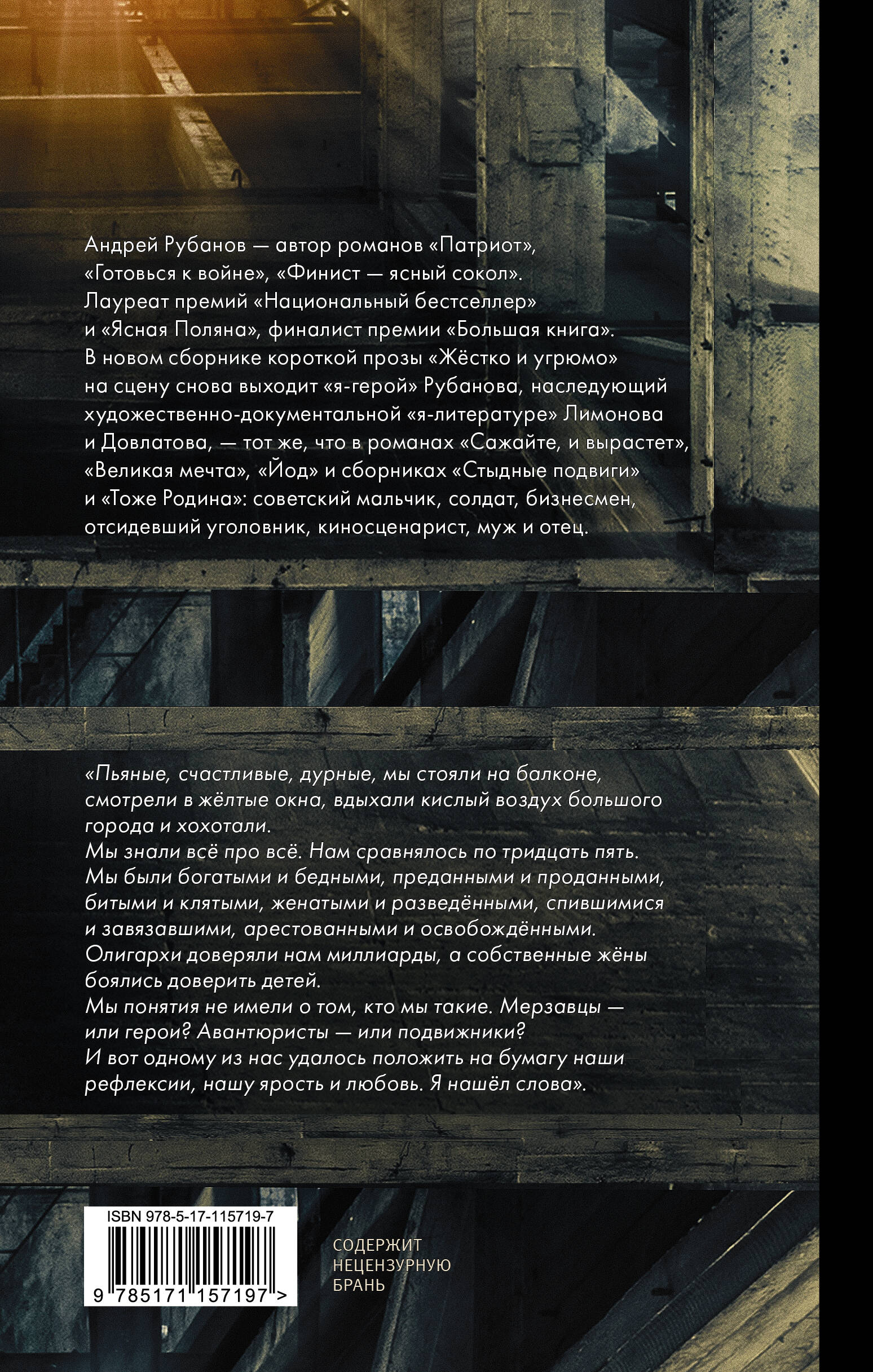 Андрей Рубанов - автор романов "Патриот", "Готовься к войне", "Финист - ясный сокол". Лауреат премий "Национальный бестселлер" и "Ясная Поляна", финалист премии "Большая книга". В новом сборнике короткой прозы "Жёстко и угрюмо" на сцену снова выходит "я-герой" Рубанова, наследующий художественно-документальной "я-литературе" Лимонова и Довлатова, - тот же, что в романах "Сажайте, и вырастет", "Великая мечта", "Йод" и сборниках "Стыдные подвиги" и "Тоже Родина": советский мальчик, солдат, бизнесмен, отсидевший уголовник, киносценарист, муж и отец. "Пьяные, счастливые, дурные, мы стояли на балконе, смотрели в жёлтые окна, вдыхали кислый воздух большого города и хохотали. Мы знали всё про всё. Нам сравнялось по тридцать пять. Мы были богатыми и бедными, преданными и проданными, битыми и клятыми, женатыми и разведёнными, спившимися и завязавшими, арестованными и освобождёнными. Олигархи доверяли нам миллиарды, а собственные жёны боялись доверить детей. Мы понятия не имели о том, кто мы такие. Мерзавцы - или герои? Авантюристы - или подвижники? И вот одному из нас удалось положить на бумагу наши рефлексии, нашу ярость и любовь. Я нашёл слова".| Издательство | ИЗДАТЕЛЬСТВО "АСТ" |