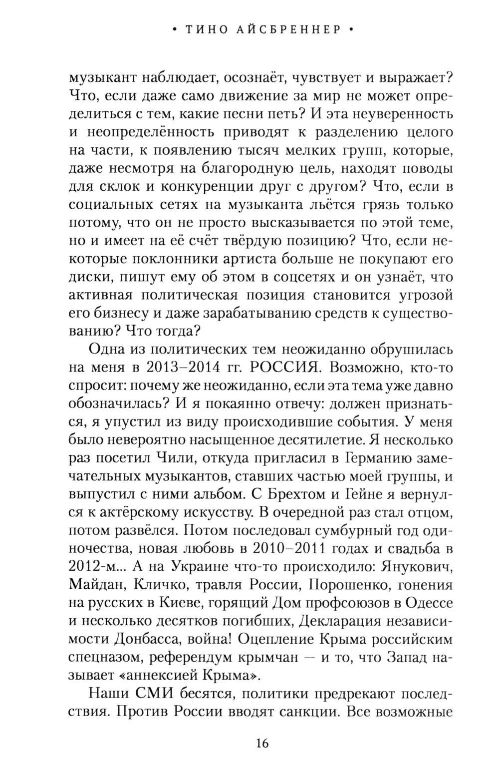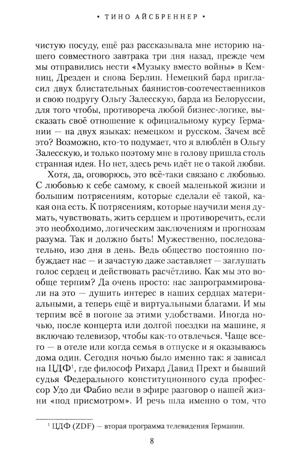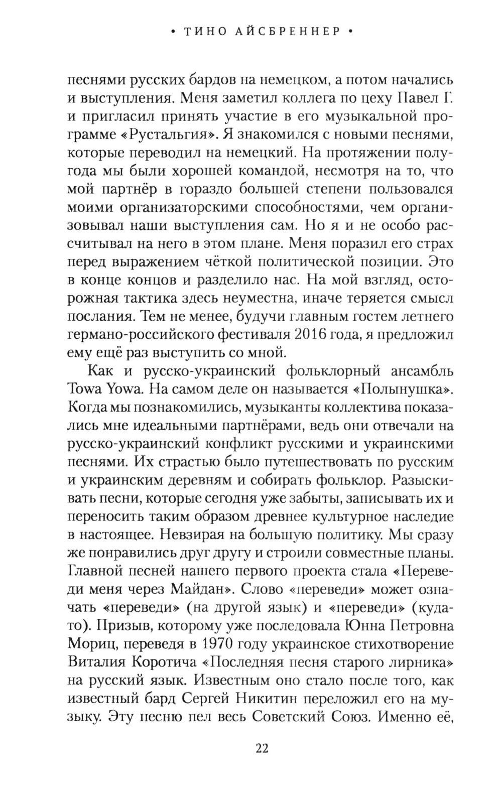 «Журавли. Немецкий поэт в гостях» - первая книга Тино Айсбреннера, опубликованная в России. В ней он описывает свои впечатления от туров «Музыка вместо войны», которые проходили в Германии, Австрии и Восточной Европе начиная с конца 2015 года; рассказывает о выдающихся людях, с которыми знакомился во время гастролей, анализирует их взгляды на жизнь, родину, историю - всё то, без чего невозможно взаимопонимание, немыслим откровенный диалог. Именно о необходимости диалога через возобновление культурных связей между Россией и Германией говорит немецкий поэт Тино Айсбреннер. И это не только очень смело, но и невероятно важно именно сегодня, в переломный для мира час.| Издательство | ИПО "У Никитских ворот" |