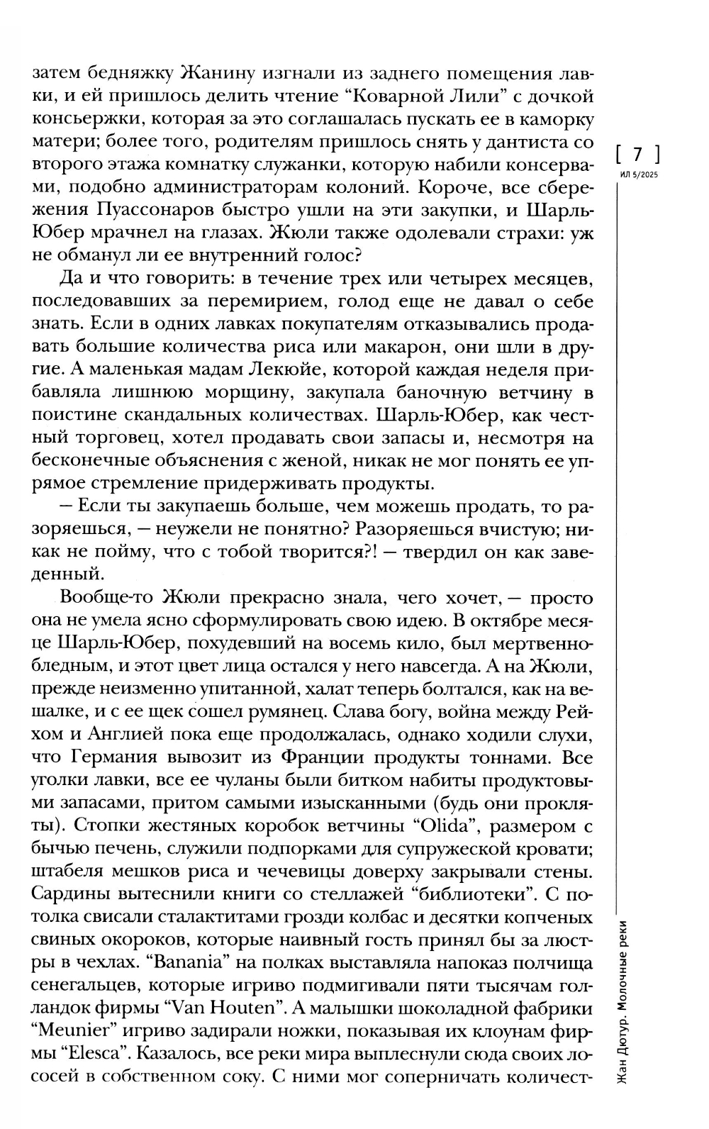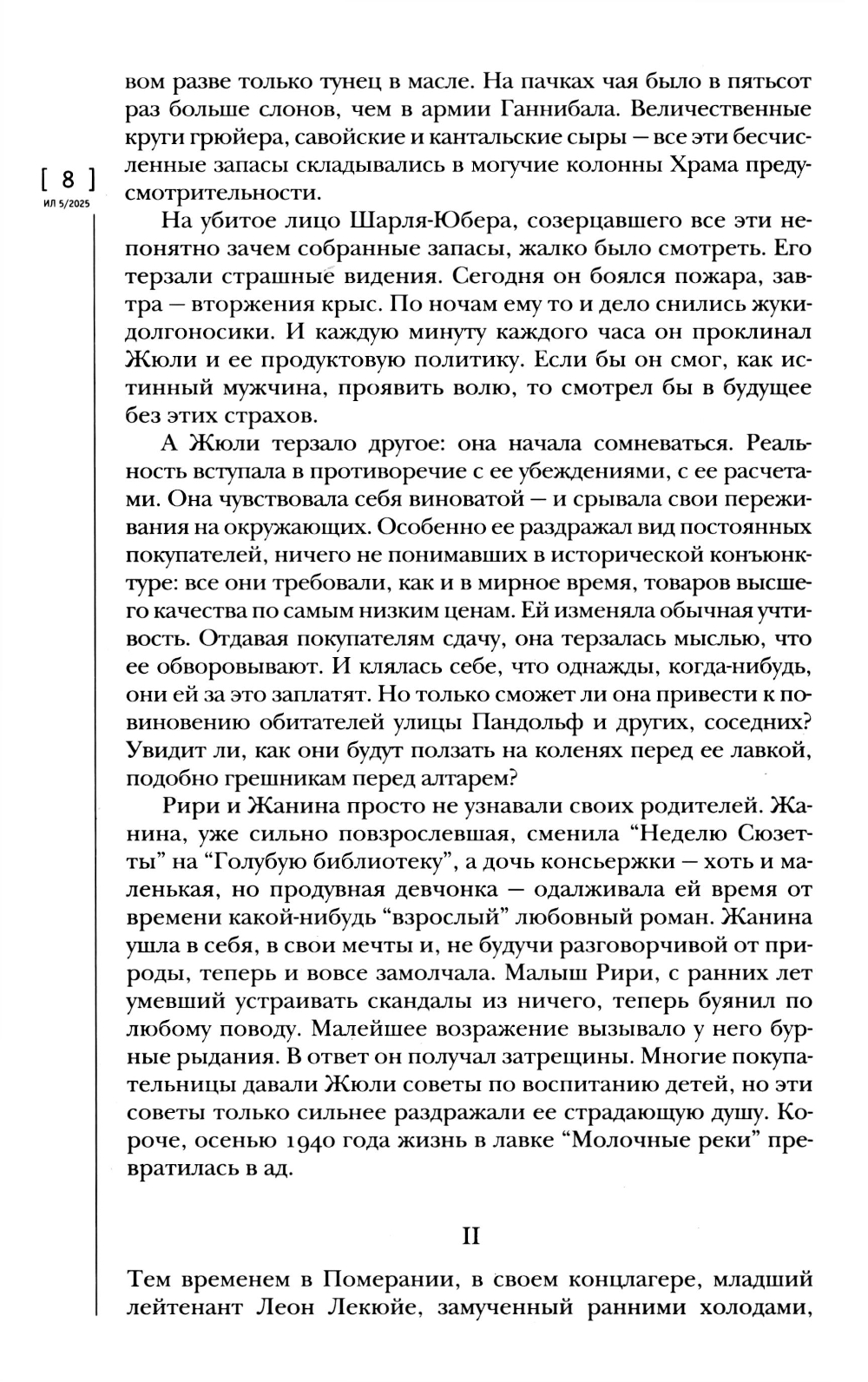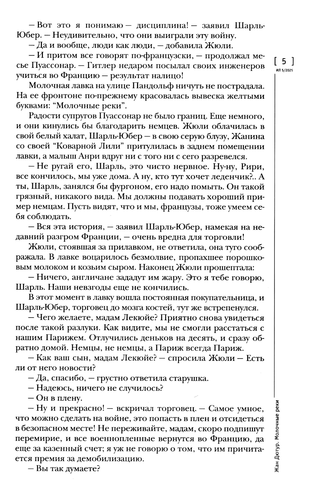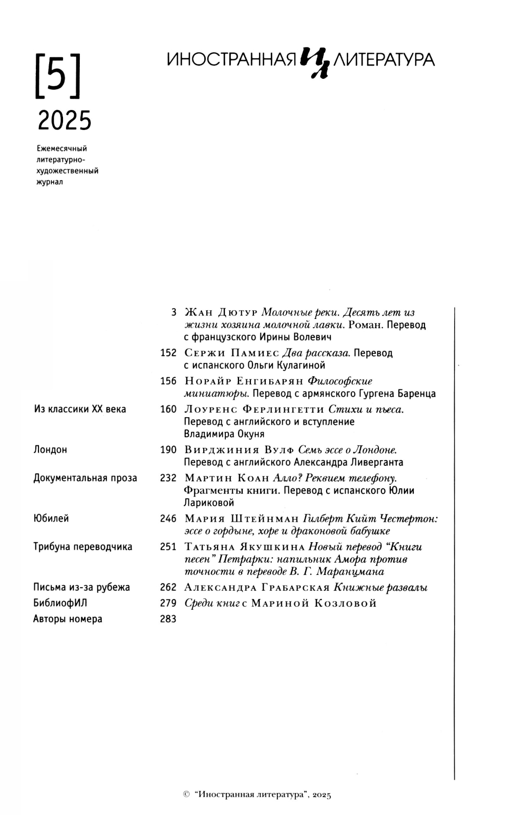 Открывается номер романом французского автора Жана Дютура (1920-2011) «Молочные реки. Десять лет из жизни хозяина молочной лавки» в переводе Ирины Волевич. Оккупированный Париж 1940-1944 годов. Герой романа, молочник, и все его семейство наживаются на войне. Логика конформизма вынуждает его совершить в ряду относительно мелких проступков и одно большое преступление, что не мешает торговцу прослыть антифашистом и сделать успешную карьеру в послевоенное время. Другой герой - положительный, терпит житейское поражение. Мрачная книга. Два рассказа испанца Сержи Памиеса (р. 1960) в переводе Ольги Кулагиной. Трагическая проза жизни. «Философские миниатюры» армянского автора Норайра Енгибаряна (1945-2024) в переводе Гургена Баренца. Рубрика «Из классики ХХ века». Американский автор Лоуренс Ферлингетти (1919-2021). Стихи и пьеса «Солдаты без страны». Перевод и вступление Владимира Окуня. Одна из главных тем Ферлингетти-поэта, говорится во вступлении, «маленький человек во все более враждебном, невыносимом мире... «Я вижу их на каждом углу / На их головах нет котелков они без тросточек / Свернув за угол они подтягивают штаны / и уходят от нас / в великую американскую ночь». «Семь эссе о Лондоне» английской писательницы Вирджинии Вулф (1882-1941) в переводе Александра Ливерганта. Увлекательное краеведение напополам с подлинным глубокомыслием: «Склад идеально продуман как склад, кран - как кран; это и есть красота... Красота - побочный продукт пользы» («Лондонские доки»). «Документальная проза». Фрагменты книги аргентинца Мартина Коана (р. 1967) «Алло? Реквием телефону», перевод с испанского Юлии Лариковой. Краткая история отношений рода людского с, говоря современным языком, - гаджетом. Рубрика «Юбилей». Мария Штейнман «Гилберт Кийт Честертон: эссе о гордыне, хоре и драконовой бабушке». Речь в заметке идет о тридцатилетней деятельности юбиляра в качестве колумниста. «Трибуна переводчика». Филолог Татьяна Якушкина анализирует новый перевод «Книги песен» Петрарки, выполненный В.Г. Маранцманом. Образец профессионального анализа. Рубрика «Письма из-за рубежа». Александра Грабарская «Книжные развалы». Экскурсия по книжным магазинам Стокгольма, Мадрида и Порто. Рубрика «БиблиофИЛ»: «Среди книг» с Мариной Козловой. Отзыв на выход антологии «Итальянская проза нового тысячелетия».| Издательство | Иностранная литература |