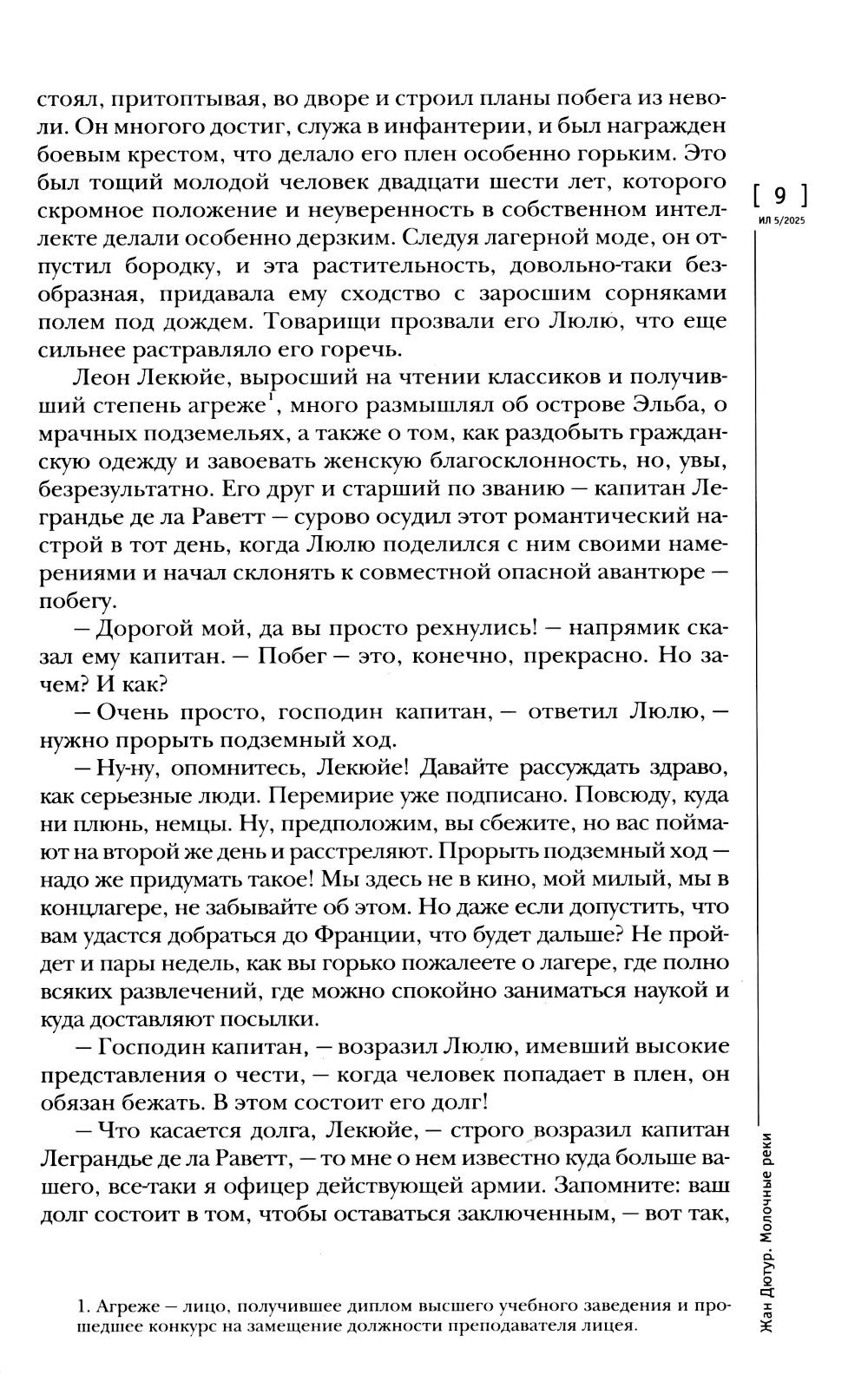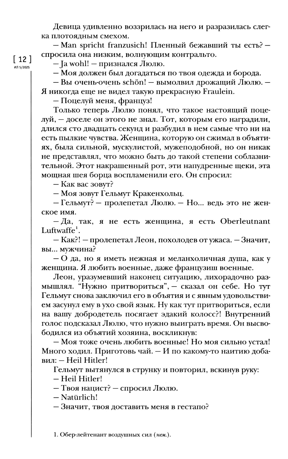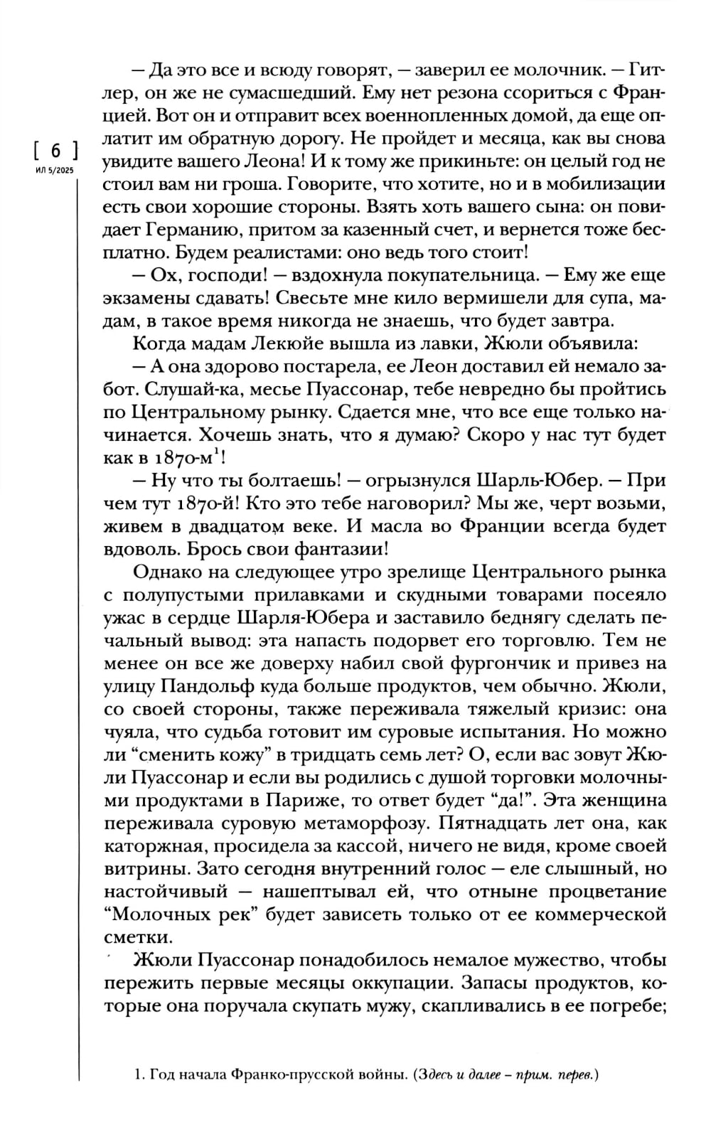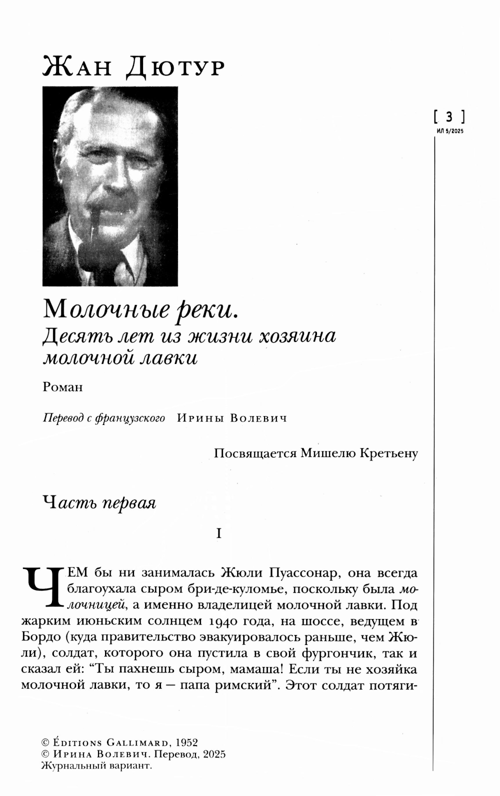 Открывается номер романом французского автора Жана Дютура (1920-2011) «Молочные реки. Десять лет из жизни хозяина молочной лавки» в переводе Ирины Волевич. Оккупированный Париж 1940-1944 годов. Герой романа, молочник, и все его семейство наживаются на войне. Логика конформизма вынуждает его совершить в ряду относительно мелких проступков и одно большое преступление, что не мешает торговцу прослыть антифашистом и сделать успешную карьеру в послевоенное время. Другой герой - положительный, терпит житейское поражение. Мрачная книга. Два рассказа испанца Сержи Памиеса (р. 1960) в переводе Ольги Кулагиной. Трагическая проза жизни. «Философские миниатюры» армянского автора Норайра Енгибаряна (1945-2024) в переводе Гургена Баренца. Рубрика «Из классики ХХ века». Американский автор Лоуренс Ферлингетти (1919-2021). Стихи и пьеса «Солдаты без страны». Перевод и вступление Владимира Окуня. Одна из главных тем Ферлингетти-поэта, говорится во вступлении, «маленький человек во все более враждебном, невыносимом мире... «Я вижу их на каждом углу / На их головах нет котелков они без тросточек / Свернув за угол они подтягивают штаны / и уходят от нас / в великую американскую ночь». «Семь эссе о Лондоне» английской писательницы Вирджинии Вулф (1882-1941) в переводе Александра Ливерганта. Увлекательное краеведение напополам с подлинным глубокомыслием: «Склад идеально продуман как склад, кран - как кран; это и есть красота... Красота - побочный продукт пользы» («Лондонские доки»). «Документальная проза». Фрагменты книги аргентинца Мартина Коана (р. 1967) «Алло? Реквием телефону», перевод с испанского Юлии Лариковой. Краткая история отношений рода людского с, говоря современным языком, - гаджетом. Рубрика «Юбилей». Мария Штейнман «Гилберт Кийт Честертон: эссе о гордыне, хоре и драконовой бабушке». Речь в заметке идет о тридцатилетней деятельности юбиляра в качестве колумниста. «Трибуна переводчика». Филолог Татьяна Якушкина анализирует новый перевод «Книги песен» Петрарки, выполненный В.Г. Маранцманом. Образец профессионального анализа. Рубрика «Письма из-за рубежа». Александра Грабарская «Книжные развалы». Экскурсия по книжным магазинам Стокгольма, Мадрида и Порто. Рубрика «БиблиофИЛ»: «Среди книг» с Мариной Козловой. Отзыв на выход антологии «Итальянская проза нового тысячелетия».| Издательство | Иностранная литература |