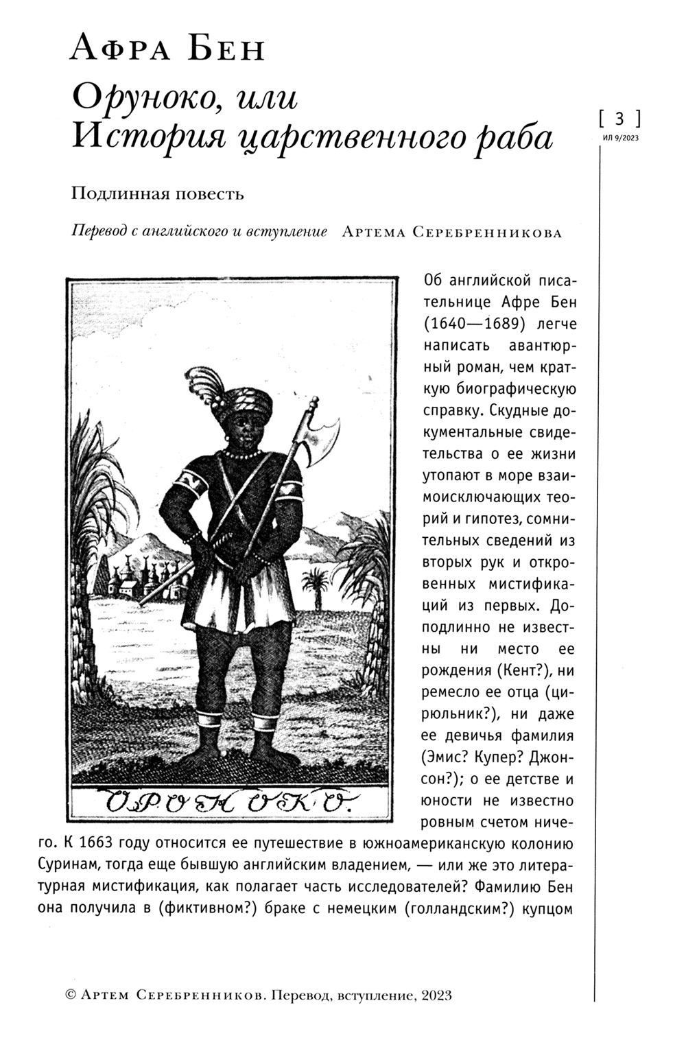Девятый выпуск 2023 года литературно-художественного журнала содержит следующие статьи и произведения: - Афра Бен "Орнуко, или История царственного раба". Подлинная повесть - Ваге Армен "Стихи" - Уильям Фолкнер "Действуйте осторожно и быстро". Рассказ - Дмитрий Афонин "О романе Уильяма Фолкнера "Пилон". Эссе - Фернандо Пессоа "35 английских сонетов" - Стивен Винсент Бене "Плачущие Девы" - Франсуаза Саган "Утро как целая жизнь" - Уильям Гилберт "Мое первое дело" - Джордж Гордон Байрон "Она идет в красе, как ночь..." - Паскаль Киньяр "Тьма и безмолвие. Жорж де Латур" - "Поуп и другие" - Маркиз де Сад "Рим". Из книги "Путешествие по Италии" - Генри Луис Менкен "Размышления о журналистике. Воспоминания" - Фрэнсис Скотт Фицджеральд "Сон и пробуждение" - Джордж Оруэлл "Луна под водой" - Адам Мицкевич "Лозанские стихи" - Георг Гейм "Стихи" - Хосе Антонио Кампос "Две поездки на побережье" - "Болгарская эпиграмма"