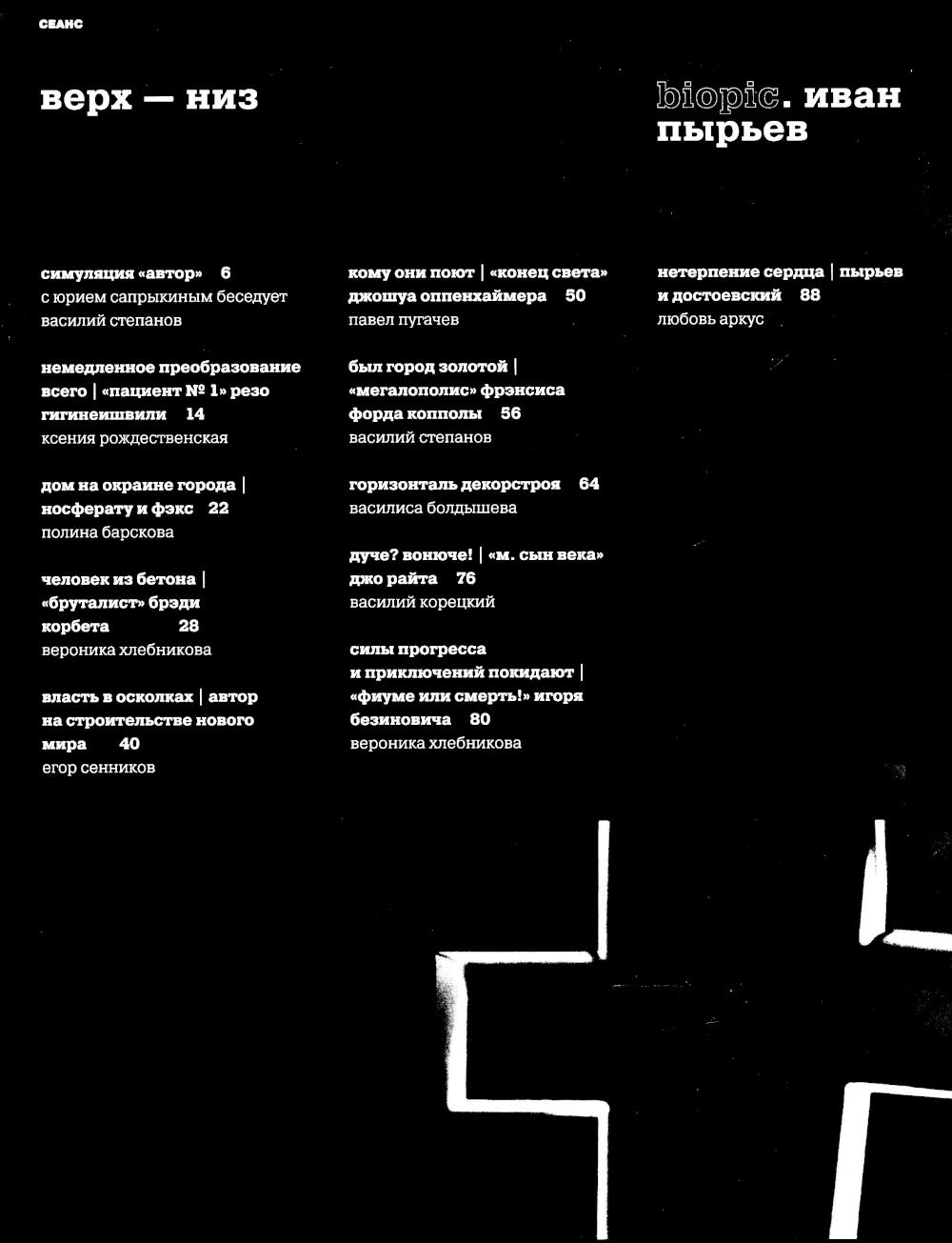 «Анора» стала чем-то вроде тени, отброшенной избыточно большим авторским кино. Оно сегодня старомодно грезит демиургами, масштабами и будущим, смотрит вперед и свысока. Но чем выше вертикаль, тем тень длиннее. В центре этого номера - точка, где тень становится человеком, место встречи массы и лидера, сюжет айн-рэндовского титана, который рвет социальную сеть человеческого, слишком человеческого. Главные слова номера: желание, архитектура, власть, одиночество, смерть, двойник, превращение.| Издательство | Мастерская СЕАНС |