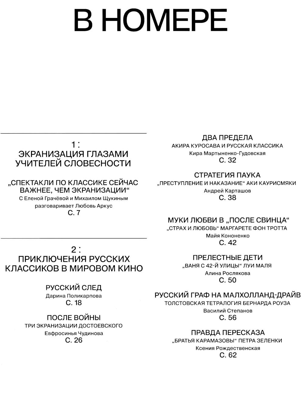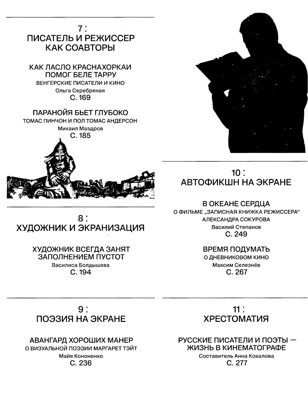 Истории взаимодействия режиссеров-классиков (Куросавы, Маля, Каурисмяки и других) с русским литературным каноном. Разговор с Михаилом Ратгаузом о Райнере Вернере Фасбиндере, его любимых книгах и жизни, построенной по их мотивам. Блок материалов к 250-летию Джейн Остин (несмотря на почтенный возраст юбиляра, рубрику мы назвали «Ретроавангард») - статья Лилии Шитенбург об Остин, тексты об экранизациях ее романов и отдельный - про Колина Фёрта. Интервью с режиссером «Господина оформителя» Олегом Тепцовым о картине по роману Саши Соколова, которую он сейчас готовит. И, наконец, рассказ о новом фильме Александра Сокурова «Записная книжка режиссера» - одновременно монументальном и очень личном.| Издательство | Мастерская СЕАНС |