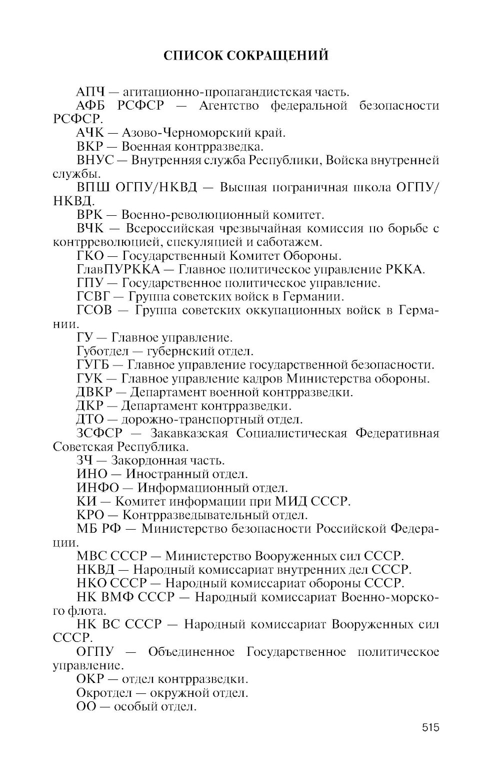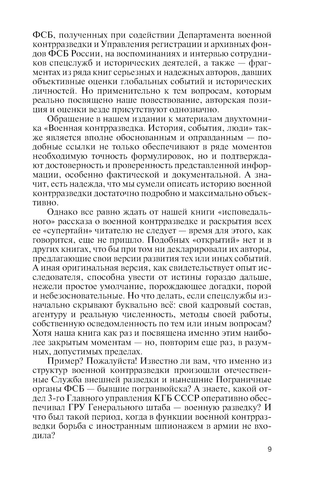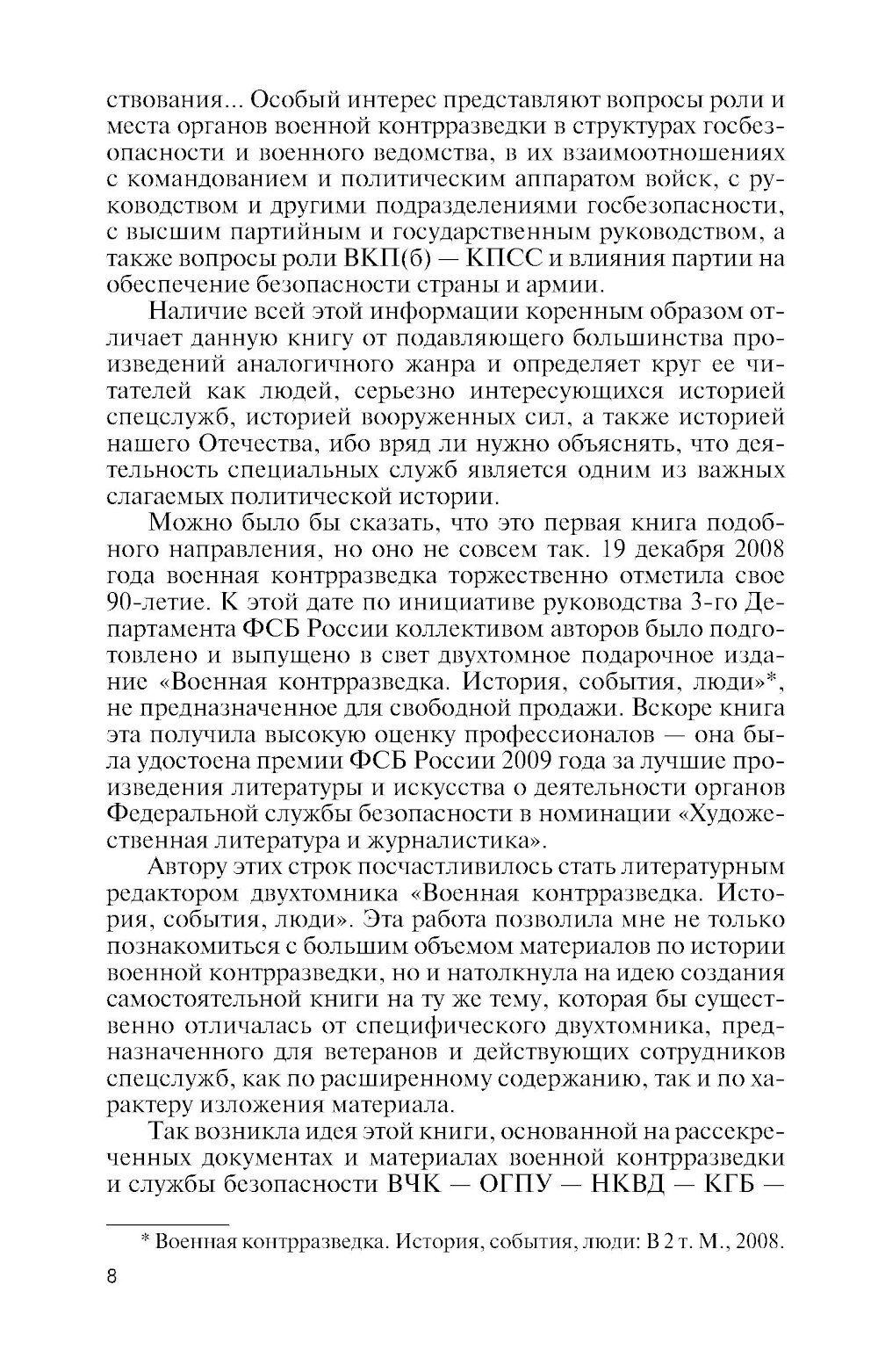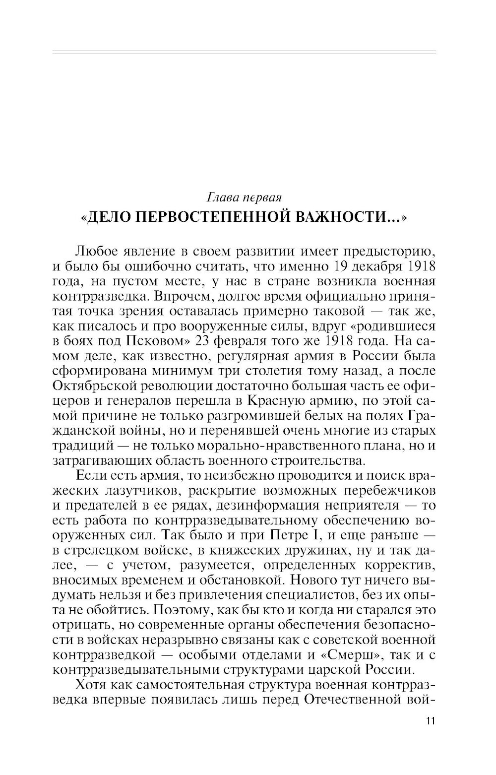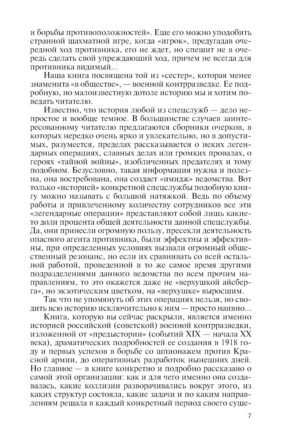Настоящая книга - это рассказ о столетней истории и славных боевых делах военной контрразведки ВЧК - ОГПУ - НКВД - КГБ - ФСБ России, а также - о ее людях. Но это не биография одной конкретной личности и не сборник очерков. Говоря об истории службы, автор постарался рассказать о многих ее сотрудниках, что позволит читателю получить достаточно полное представление о людях, в различное время осуществлявших контрразведывательную деятельность в войсках, и о той работе, которую они выполняли.| Издательство | Молодая гвардия |