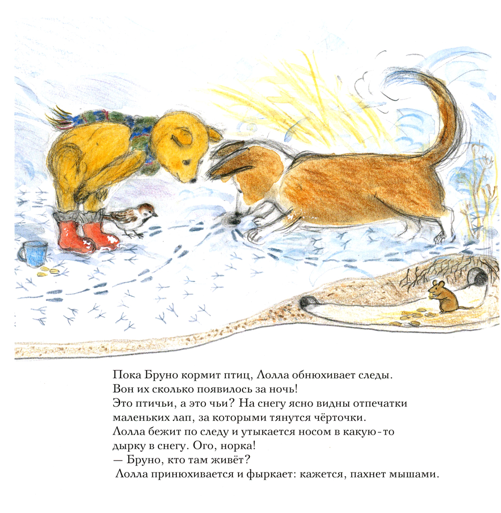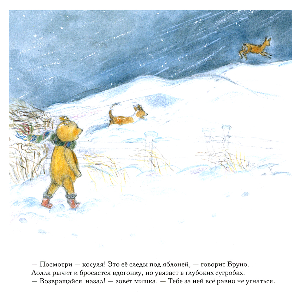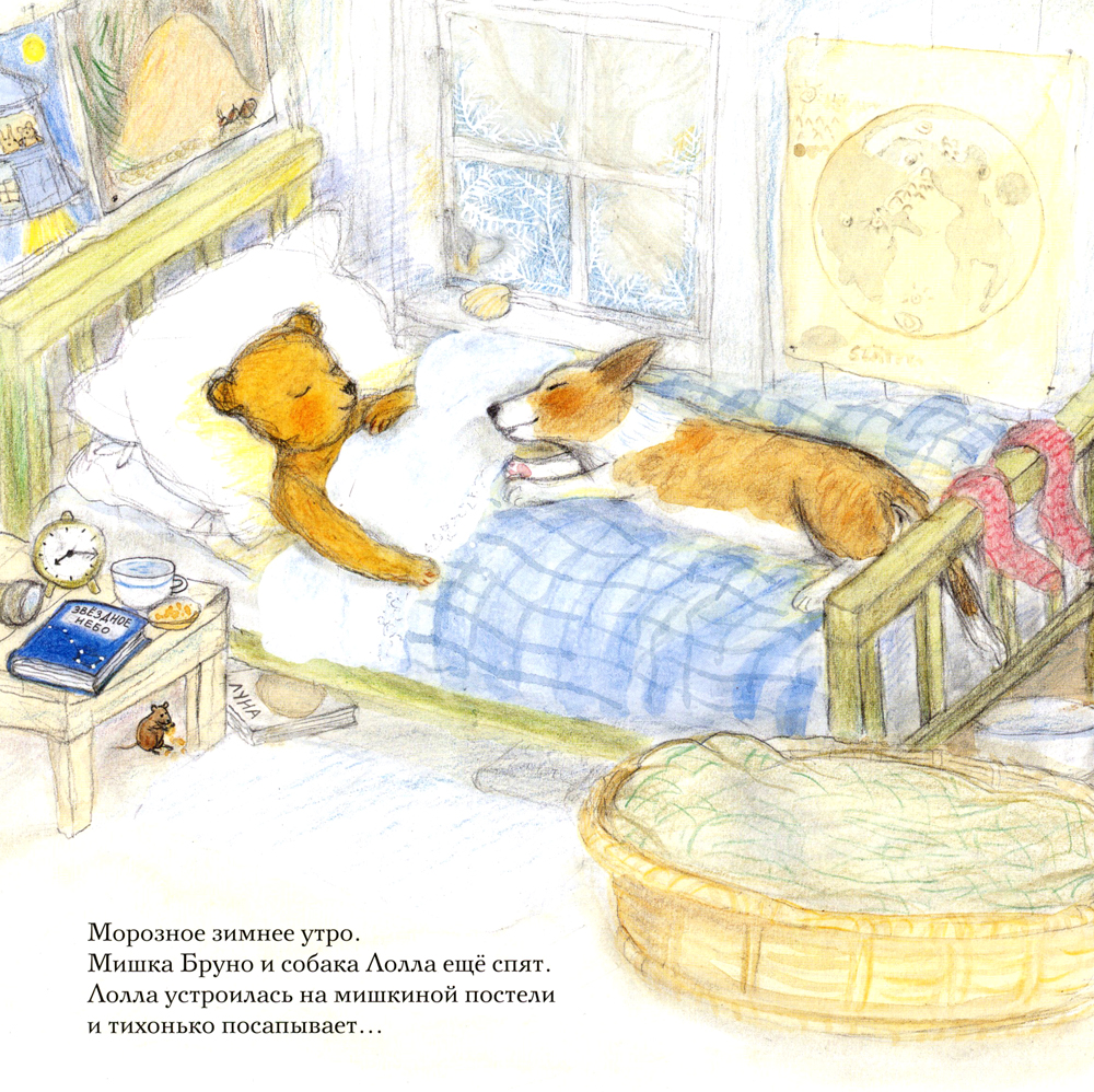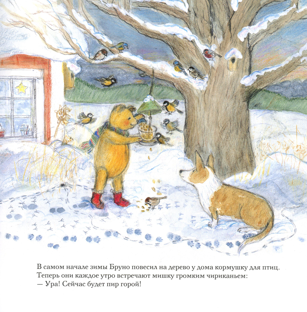 Мишка Бруно и его собака Лолла - герои 4-х книжек-картинок, созданных современной шведской художницей Гуниллой Ингвес. Каждая книга посвящена одному из времен года - зиме, весне, лету и осени - и в ней описывается один день из жизни героев, наполненный занятиями и развлечениями «по сезону». В книге «Зима мишки Бруно» мишка с собакой подкармливают семенами оставшихся на зимовье птиц, учатся различать на снегу следы животных - мыши-полевки, зайца, косули, а еще собачьи и птичьи следы. Бруно с Лоллой попадают в снежную метель, замерзают, отогреваются дома у печки, пекут оладья на обед. А вечером, когда стемнело, небо прояснилось и на нем особенно отчетливо стали видны звезды и луна, Бруно с Лоллой взяли бинокль, карту звездного неба и пошли любоваться созвездиями и луной.| Издательство | Мелик-Пашаев |