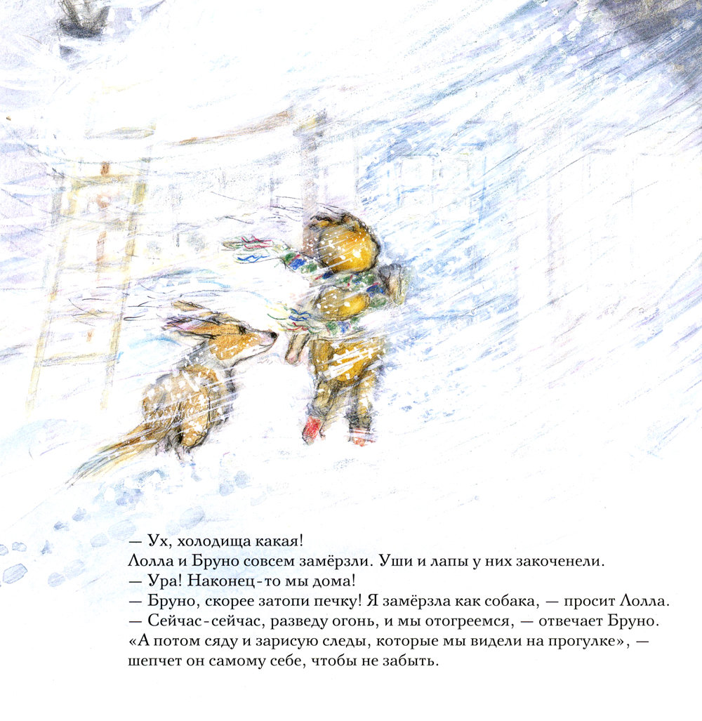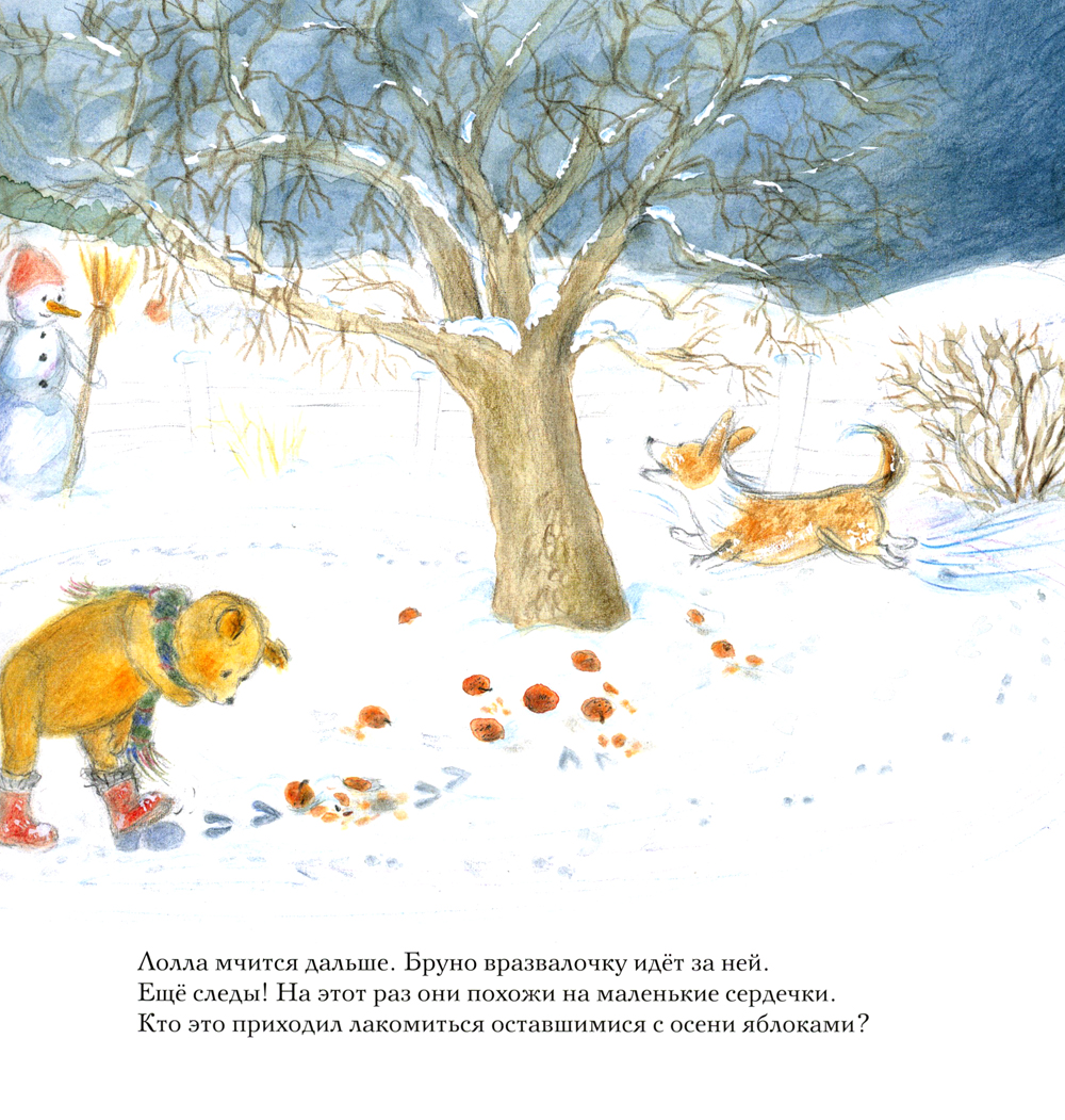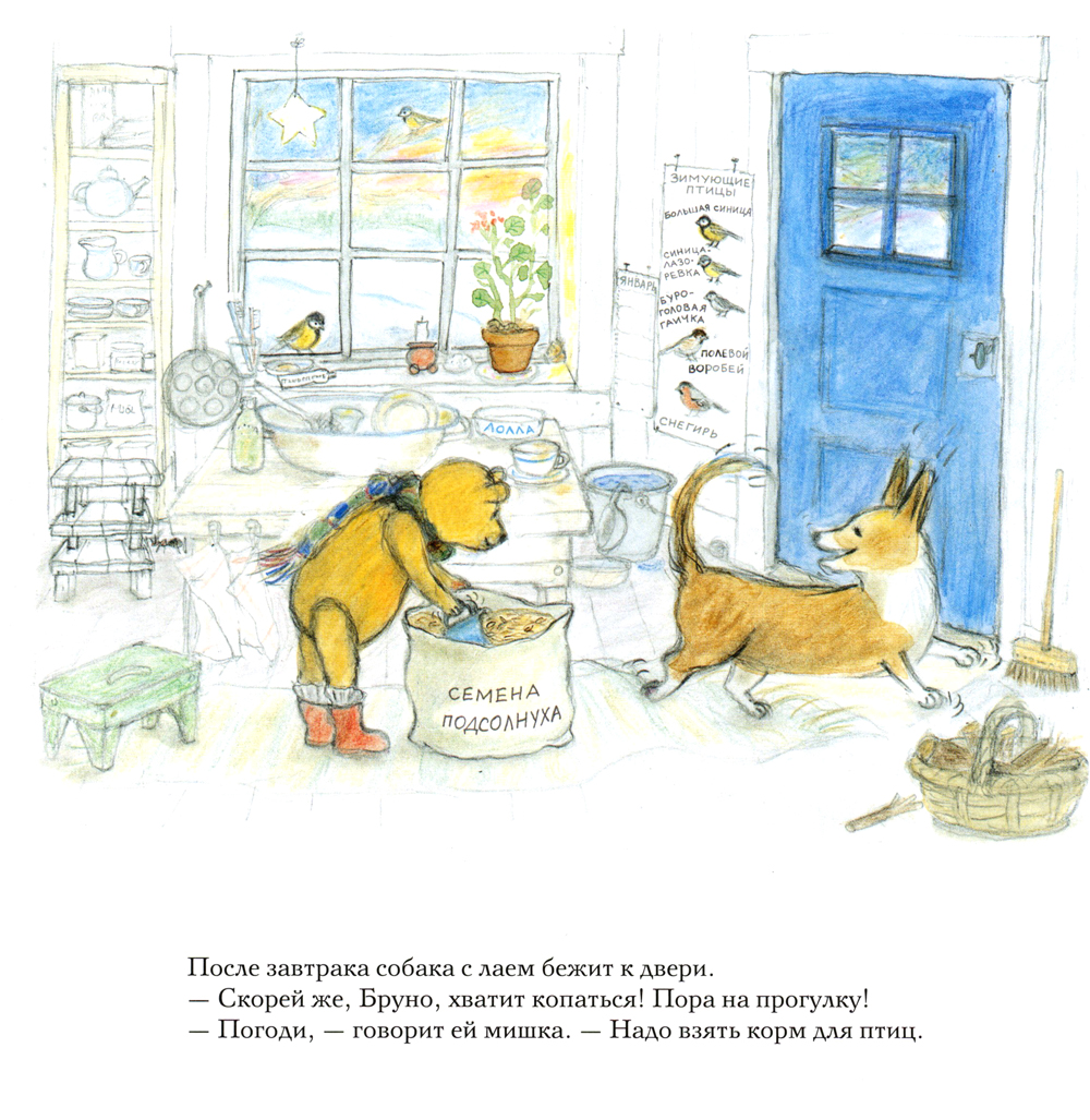 Мишка Бруно и его собака Лолла - герои 4-х книжек-картинок, созданных современной шведской художницей Гуниллой Ингвес. Каждая книга посвящена одному из времен года - зиме, весне, лету и осени - и в ней описывается один день из жизни героев, наполненный занятиями и развлечениями «по сезону». В книге «Зима мишки Бруно» мишка с собакой подкармливают семенами оставшихся на зимовье птиц, учатся различать на снегу следы животных - мыши-полевки, зайца, косули, а еще собачьи и птичьи следы. Бруно с Лоллой попадают в снежную метель, замерзают, отогреваются дома у печки, пекут оладья на обед. А вечером, когда стемнело, небо прояснилось и на нем особенно отчетливо стали видны звезды и луна, Бруно с Лоллой взяли бинокль, карту звездного неба и пошли любоваться созвездиями и луной.| Издательство | Мелик-Пашаев |