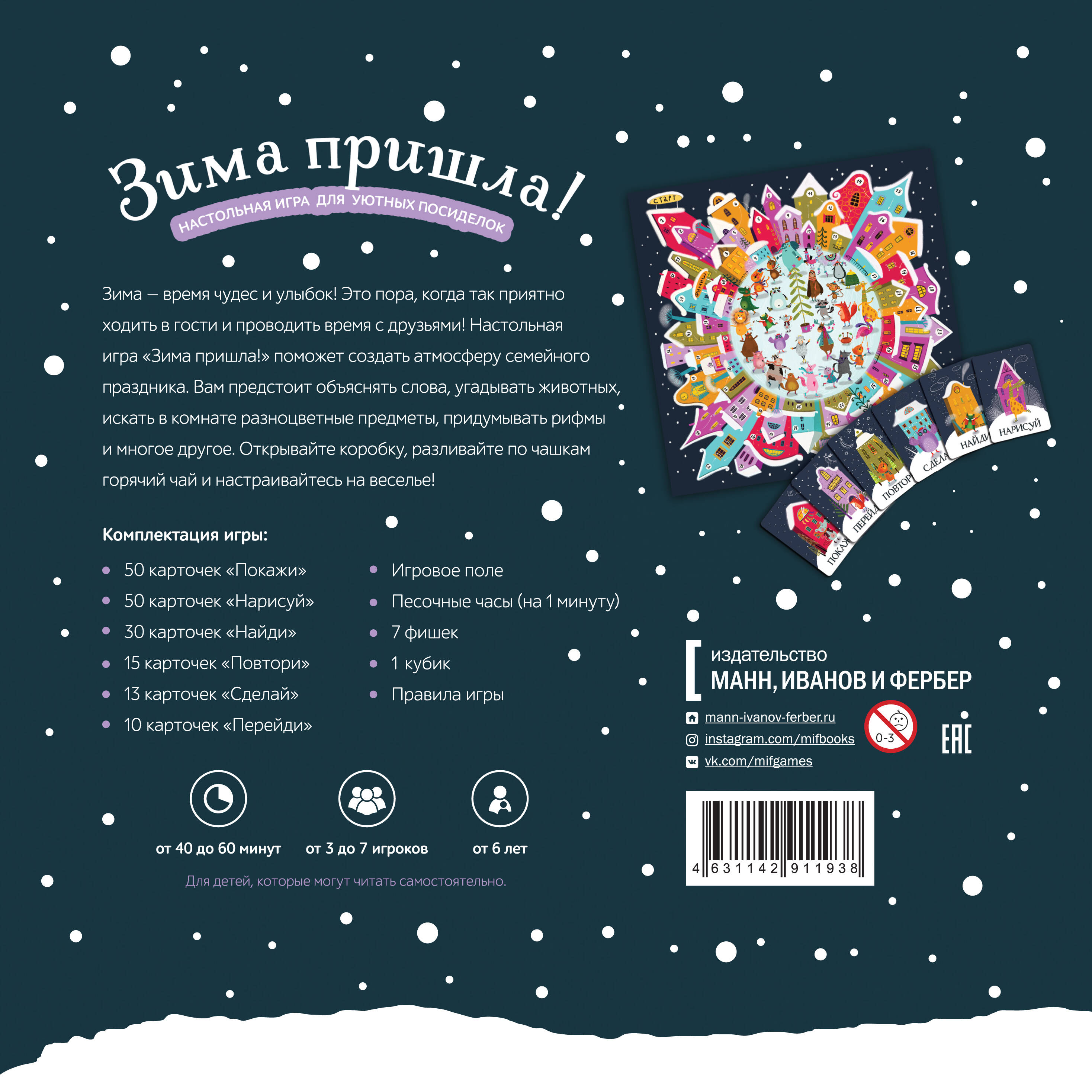 Зима - время чудес и улыбок! Это пора, когда так приятно ходить в гости и проводить время с друзьями. Настольная игра "Зима пришла!" поможет создать атмосферу семейного праздника. Вам предстоит объяснять слова, угадывать животных, искать в комнате предметы, придумывать рифмы и многое другое. Открывайте коробку, разливайте горячий чай и настраивайтесь на веселье!| Издательство | Манн, Иванов и Фербер |