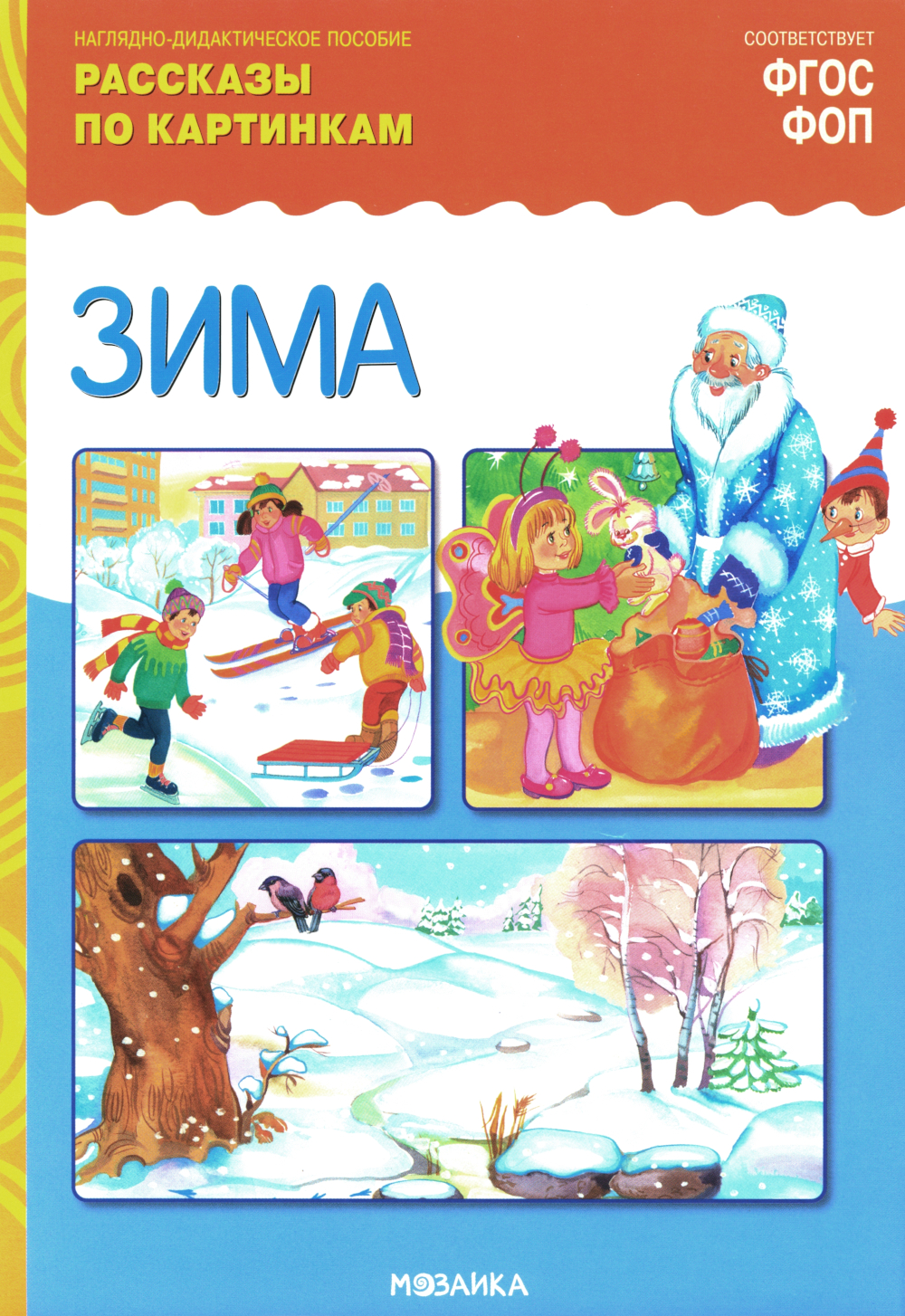 Наглядно-дидактическое пособие «Зима» серии «Рассказы по картинкам» предназначено для развития связной речи у детей 3-7 лет на групповых и индивидуальных занятиях в детском саду и дома. В пособии представлены 8 красочных иллюстраций на тему «Зима» (новогодний праздник, дети заботятся о природе и др.). Данный наглядный материал с успехом может быть использован на занятиях по ознакомлению с окружающим миром, для развития речи и мышления, в логопедических играх, для развития логического мышления.| Издательство | Мозаика-Синтез |