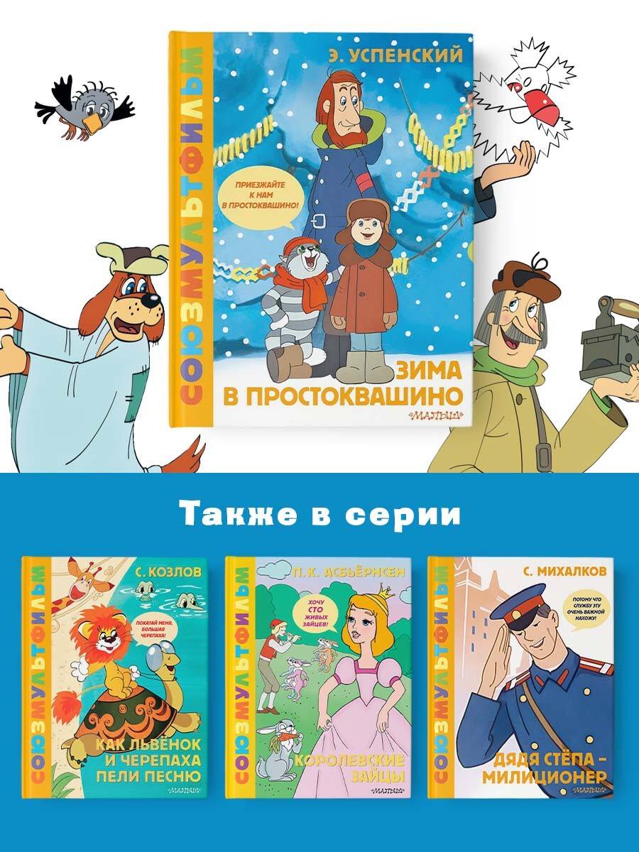 Союзмультфильм представляет: впервые - легендарные мультфильмы в книгах! Серия «Союзмультфильм представляет» - это такие хитрые книги для всех тех, кто страстно любит смотреть мультики. Однако не всем детям разрешают сидеть перед телевизором с утра до вечера. Зато ни один родитель не запретит своему ребёнку читать. Тем более такие яркие, красивые, умные и добрые книги, написанные лучшими детскими писателями и нарисованные великолепными художниками-мультипликаторами. Читайте книгу Э. Успенского «Зима в Простоквашино» со знаменитыми иллюстрациями из мультфильма.| Издательство | Издательство "АСТ" |
