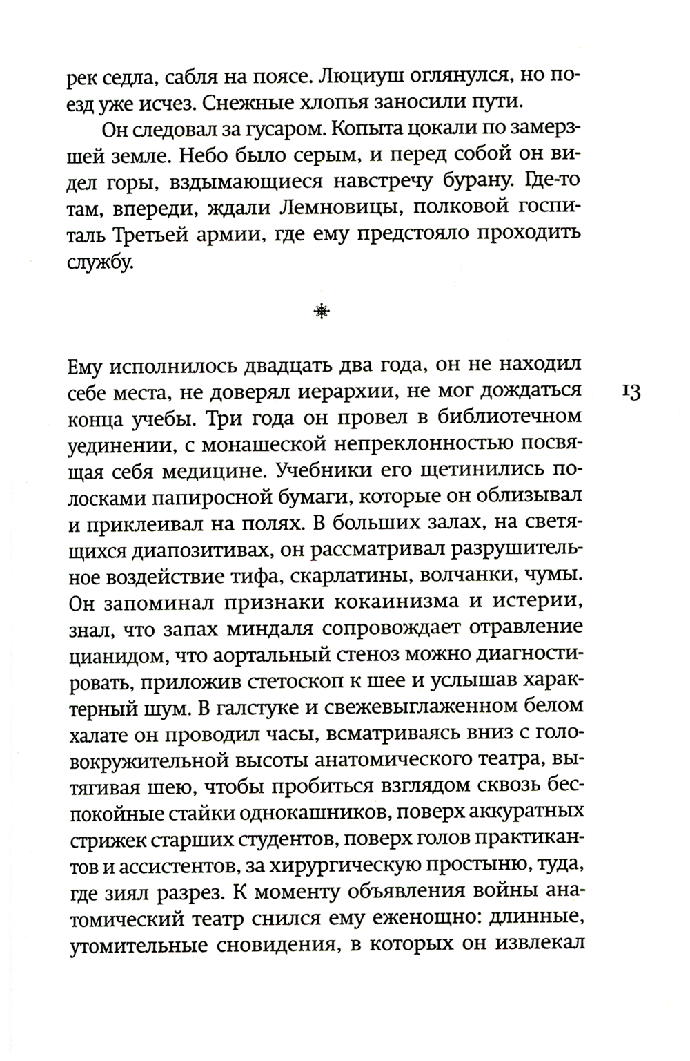 Вена, начало XX века. Люциуш Кшелевский - юноша из аристократической польской семьи. В отличие от братьев, выбравших традиционные для шляхты занятия, он решает стать врачом - однако в разгар его обучения в Европе вспыхивает мировая война. Зачарованный романтическими рассказами о военной хирургии, он записывается в армию, ожидая, что его направят в хорошо организованный полевой госпиталь. Но когда Люциуш прибывает на место службы в Карпатских горах, он обнаруживает, что это не огромный госпиталь, а импровизированная больница, размещенная в старой деревянной церкви, да еще разоренная эпидемией тифа. Выживший медперсонал разбежался, осталась лишь сестра-монахиня, которую окружает странная таинственность. Люциуш оказывается единственным врачом на много верст вокруг, хирургом, хотя он никогда еще никого не оперировал. То, что случится в месте его службы, навсегда изменит жизнь Люциуша и всех близких ему людей. "Зимний солдат" - история войны и медицины, роман о поиске любви в бурных волнах европейской истории, об ошибках, которые совершает каждый, и о драгоценном шансе их искупления.