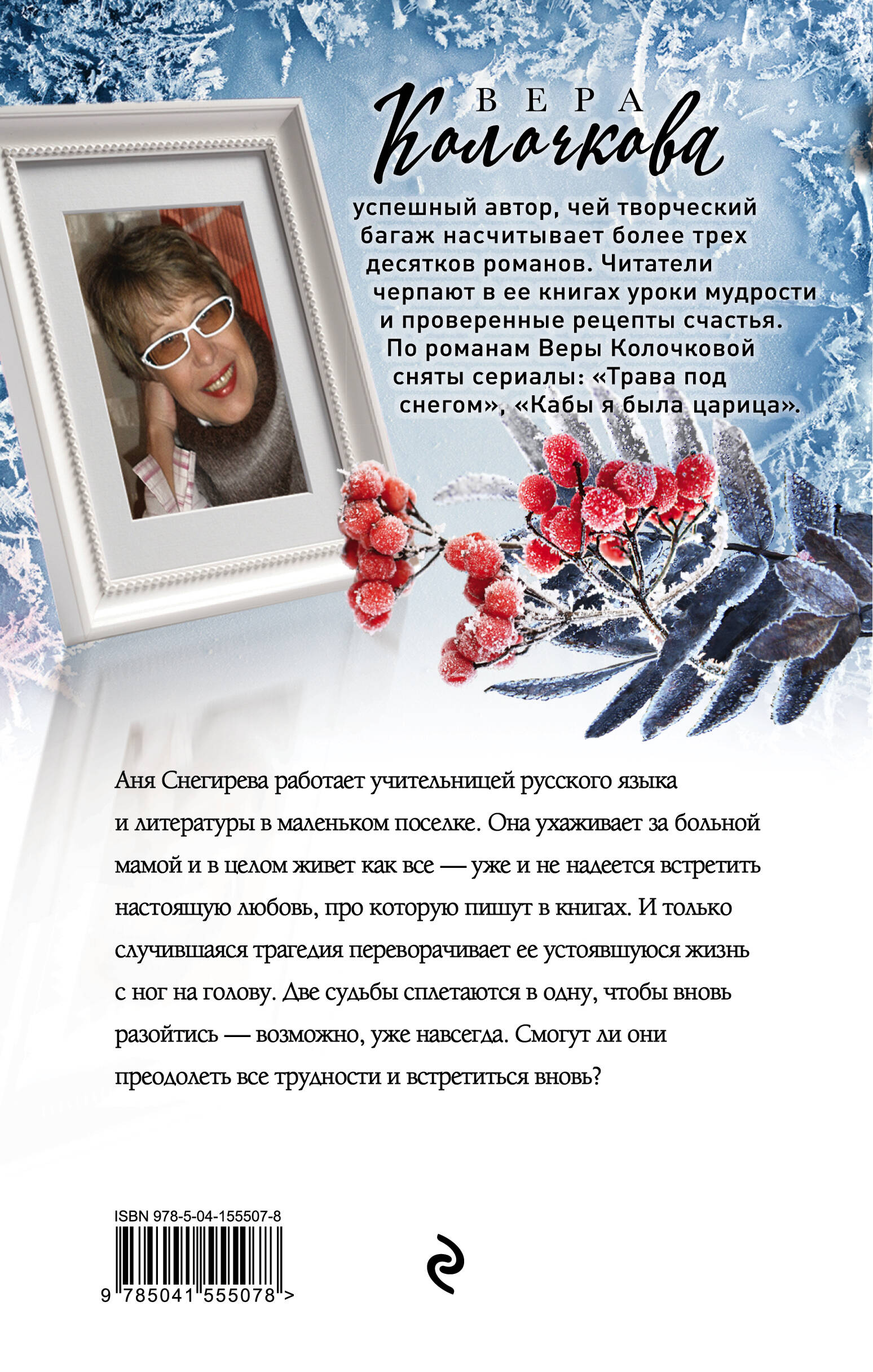 «Зимняя рябина» - это трогательная история о трудности выбора между любовью и долгом, сердцем и обязанностями. Иногда выбор бывает слишком тяжёлым, но именно он меняет нашу жизнь и делает нас по-настоящему счастливыми. Главное - сделать шаг. Роман «Зимняя рябина» как раз и рассказывает нам об этом - сделать шаг трудно, но возможно. В своём романе Вера Колочкова философски рассуждает о жизни. В размышлениях героев мы с лёгкостью можем отыскать и свои мысли. В книге устоявшуюся жизнь героев с ног на голову переворачивает только трагедия. Две судьбы сплетаются в одну, чтобы вновь разойтись - возможно, уже навсегда. Смогут ли они преодолеть все трудности и встретиться вновь?| Издательство | ООО "Издательство "Эксмо" |