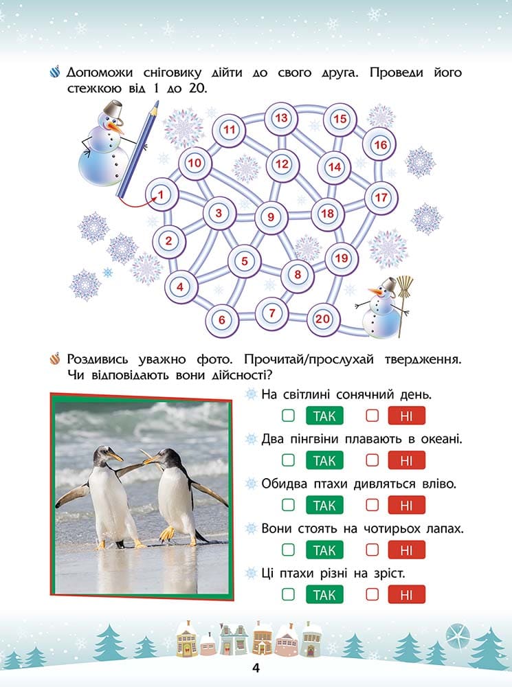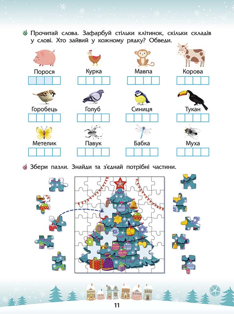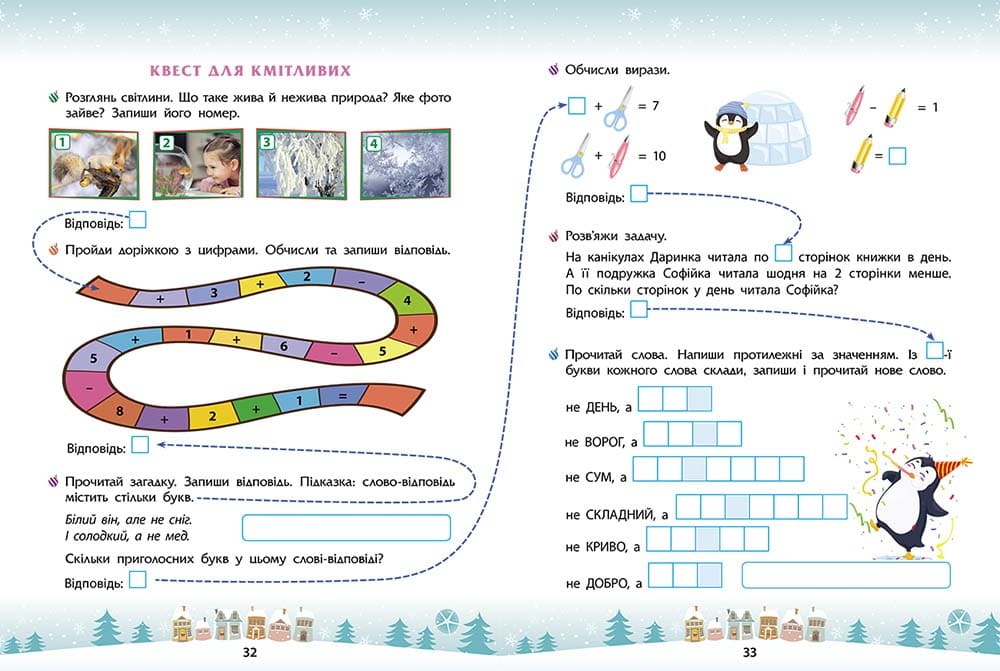 ВІДПОВІДАЄ КОНЦЕПЦІЇ НОВОЇ УКРАЇНСЬКОЇ ШКОЛИ. Зимові свята - радісний та щасливий час, коли ми зустрічаємося в затишному колі рідних та друзів. Проте канікули - це також чудова нагода провести святкові дні із користю для навчання. Як без зайвого примусу повторити із школярем матеріал першого півріччя? Як в ігровій формі перевірити результат його попереднього навчання? Як відвернути увагу дитини від гаджетів і зробити новорічні свята більш насиченими? «Зимові розумашки» - це цікавий мікс практичних і творчих завдань. А яскраві подарунки (наліпки, настільна гра-ходилка та карта мрій) допоможуть зробити ваші інтелектуальні ігри більш різноманітними, а може, і започаткують нові традиції у родині. Чому варто прочитати: Посібник в ігровій формі допомагає учням повторити та закріпити вивчений шкільний матеріал і підготуватися до наступного навчального півріччя. Книга містить: два інтегровані квести; вправи з математики, української та англійської мов; завдання на розвиток логіки та дрібної моторики; зашифровані завдання. Як приємне та корисне доповнення - наліпки для розваг та навчання, а також двосторонній постер, з одного боку якого гра-ходилка, а з іншого - карта мрій на наступний рік.| ISBN | 978-617-8387-45-7 |