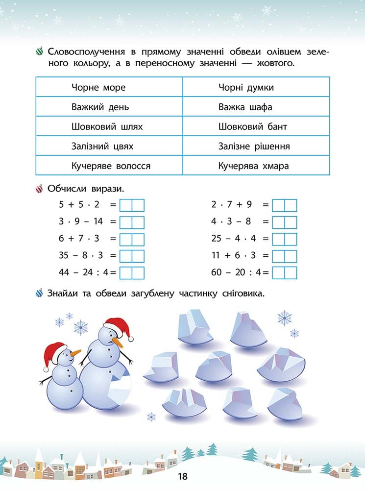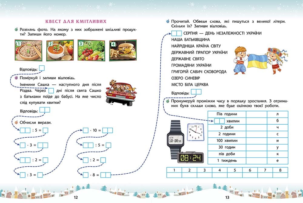 ВІДПОВІДАЄ КОНЦЕПЦІЇ НОВОЇ УКРАЇНСЬКОЇ ШКОЛИ. Зимові свята - радісний та щасливий час, коли ми зустрічаємося в затишному колі рідних та друзів. Проте канікули - це також чудова нагода провести святкові дні із користю для навчання. Як без зайвого примусу повторити із школярем матеріал першого півріччя? Як в ігровій формі перевірити результат його попереднього навчання? Як відвернути увагу дитини від гаджетів і зробити новорічні свята більш насиченими? «Зимові розумашки» - це цікавий мікс практичних і творчих завдань. А яскраві подарунки (наліпки, настільна гра-ходилка та карта мрій) допоможуть зробити ваші інтелектуальні ігри більш різноманітними, а може, і започаткують нові традиції у родині. Чому варто прочитати: Посібник в ігровій формі допомагає учням повторити та закріпити вивчений шкільний матеріал і підготуватися до наступного навчального півріччя. Книга містить: два інтегровані квести; вправи з математики, української та англійської мов; завдання на розвиток логіки та дрібної моторики; зашифровані завдання. Як приємне та корисне доповнення - наліпки для розваг та навчання, а також двосторонній постер, з одного боку якого гра-ходилка, а з іншого - карта мрій на наступний рік.| ISBN | 978-617-8387-47-1 |