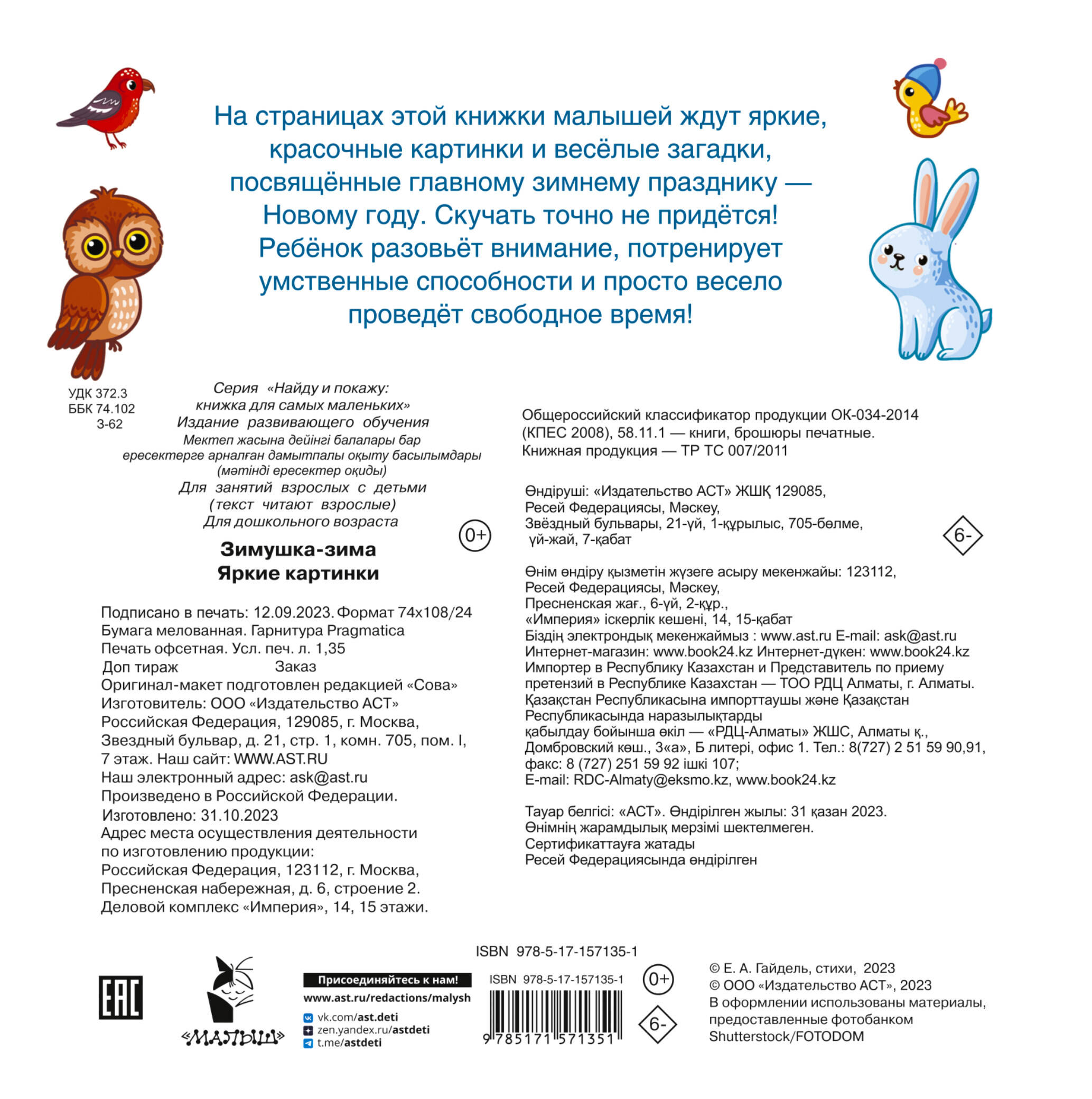 «Зимушка-зима. Яркие картинки» - это прекрасный подарок для малышей. Красивые зимние картинки + полезные задания, которые надолго займут юного читателя. На каждой страничке занимательные задания: найти и показать картинку и разгадать загадку. Занимаясь, малыш развивает внимание и наблюдательность, тренирует зрительную память. Книга небольшого формата с плотными страничками - её удобно хранить на полке или носить в маленьком детском рюкзачке. Будьте уверены - ребёнок проведёт свободное время весело и с пользой!| Издательство | ИЗДАТЕЛЬСТВО "АСТ" |
