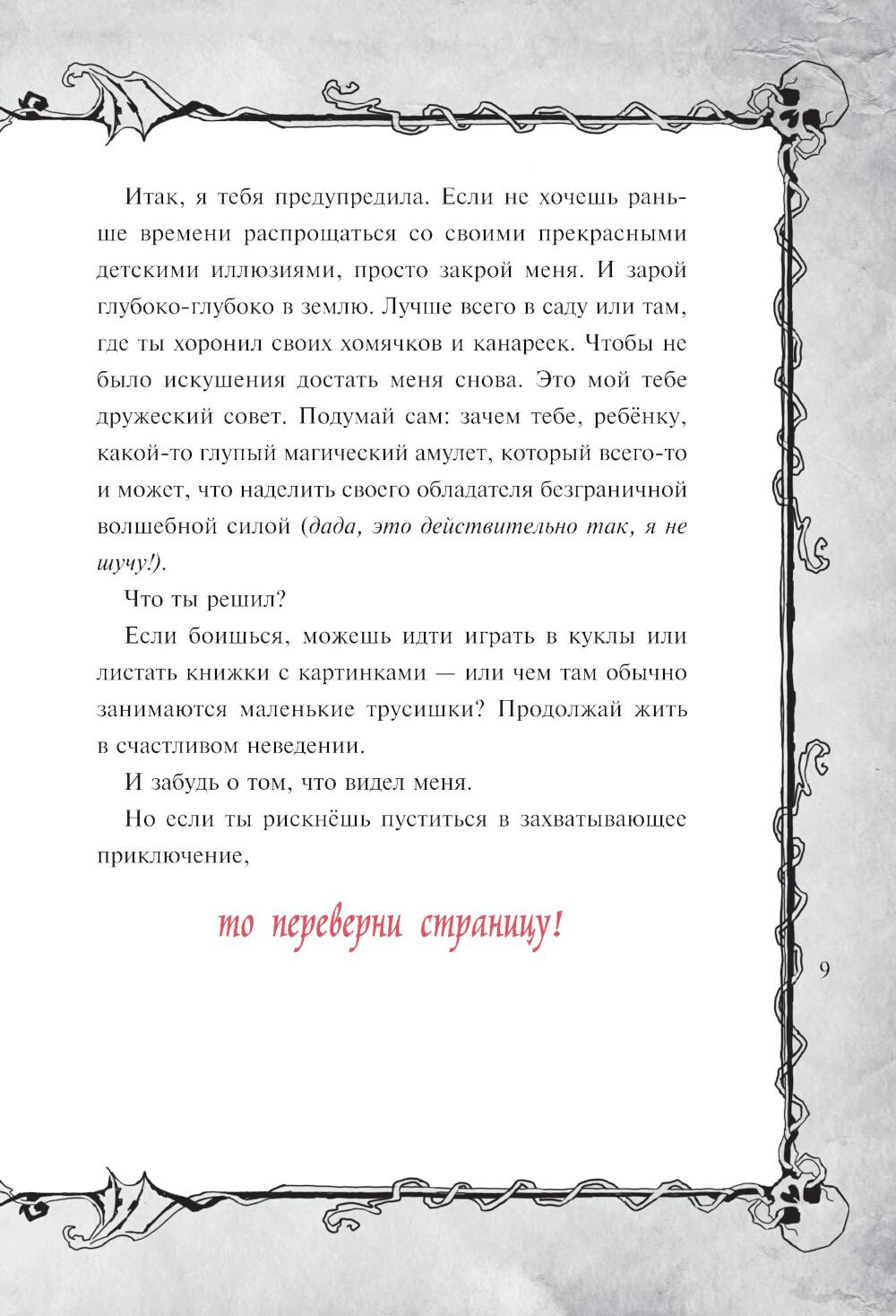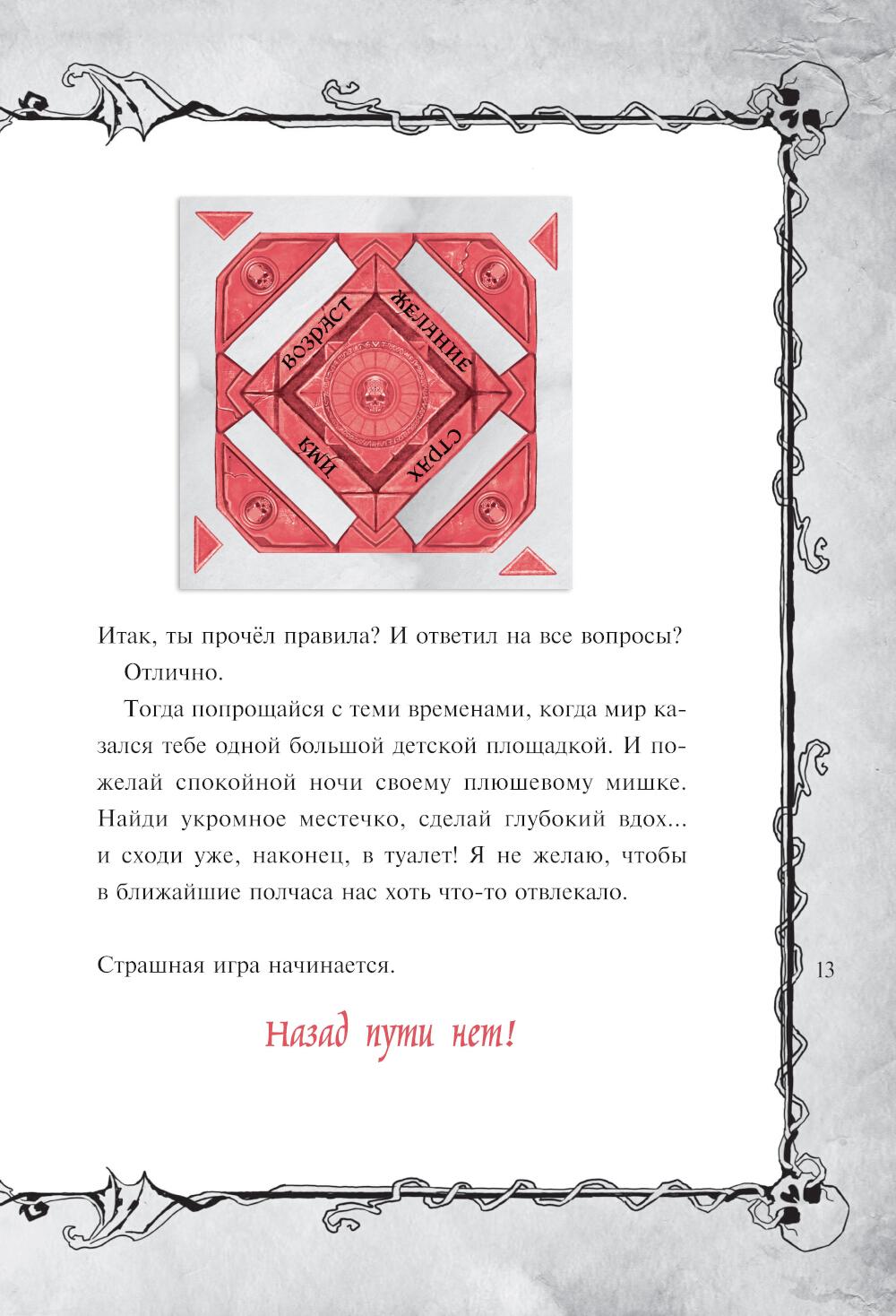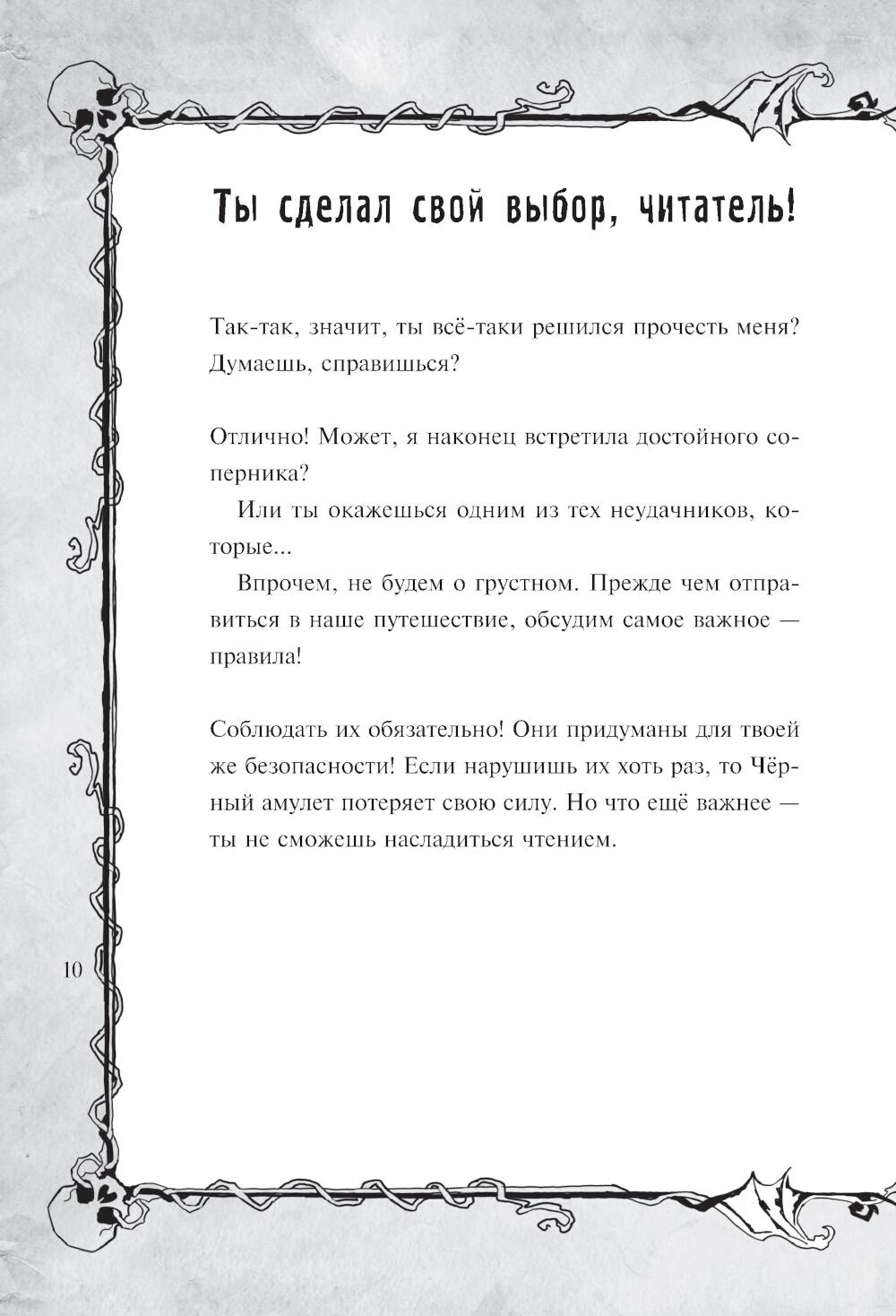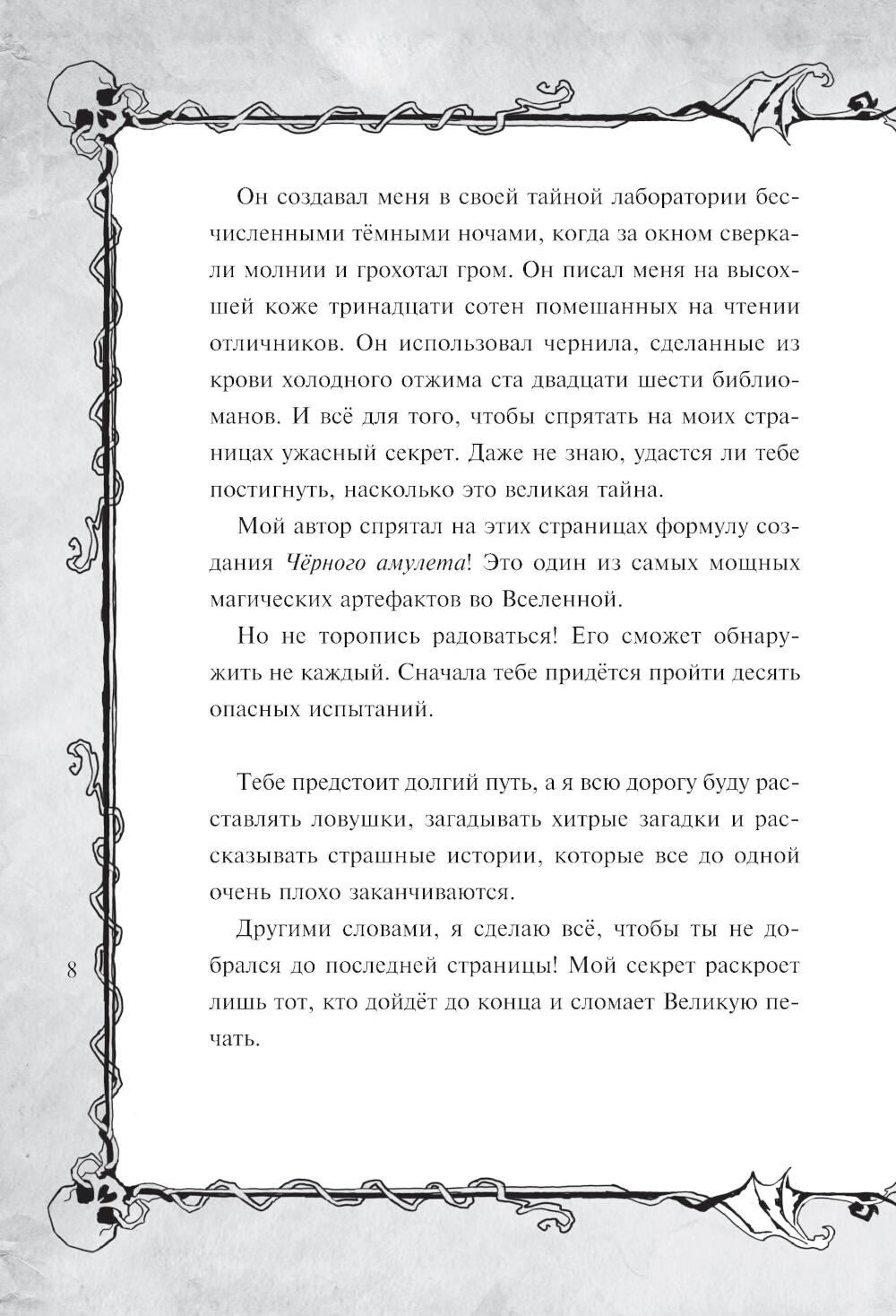 Уникальный формат, сочетающий художественный текст + квест + разнообразные задания для читателей = книга-квест. Это издание для поклонников «Маленькой злой книги», которым уже 10-13 лет: оно такое же увлекательное и необычное, но истории в нем длиннее, читаются дольше, а загадки посложнее. Секрет успеха серии в том, что книга ведет живой диалог с читателем, рассказывает ему страшные истории и приглашает в авантюрное приключение. Чтобы пройти всю книгу до конца, нужно разгадать немало головоломок, которые развивают внимание и мышление. В этой книге помощь читателя необходима, чтобы найти магический артефакт - черный амулет, который сделает своего хозяина всемогущим. Книга-игра содержит множество атмосферных иллюстраций и красивые шрифты. Тома серии можно читать в любой последовательности. Настоятельно рекомендуется противникам скучных книг!