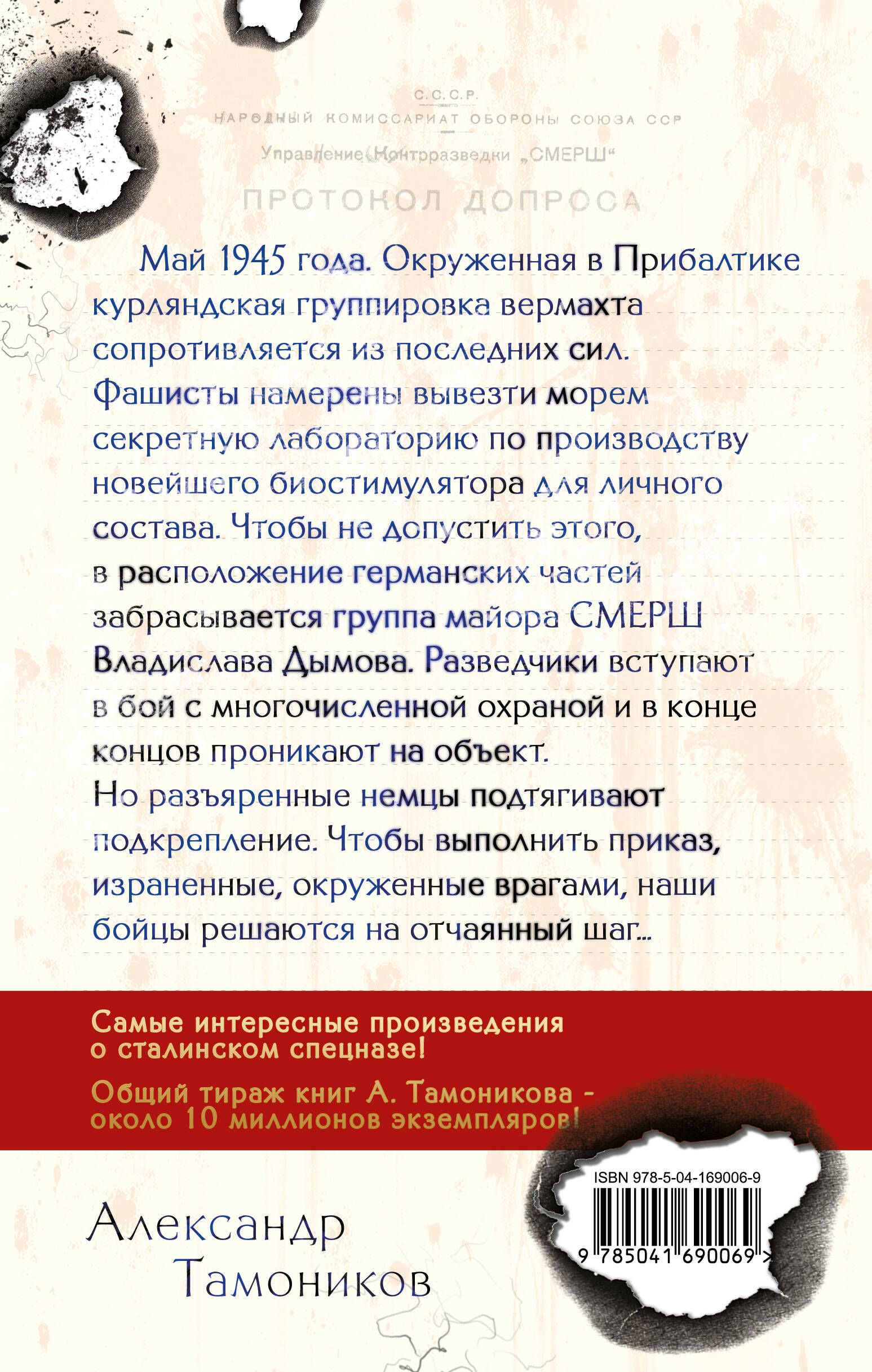 Самые интересные романы о сталинском спецназе - СМЕРШе. Май 1945 года. Окруженная в Прибалтике курляндская группировка вермахта сопротивляется из последних сил. Фашисты намерены вывести морем секретную лабораторию по производству новейшего биостимулятора для личного состава. Чтобы не допустить этого, в расположение германских частей забрасывается группа майора СМЕРШа Владислава Дымова. Разведчики вступают в бой с многочисленной охраной и, в конце концов, проникают на объект. Но разъяренные немцы подтягивают подкрепление. Чтобы выполнить приказ, израненные, окруженные врагами, наши бойцы решаются на отчаянный шаг… «Смерть шпионам!» (СМЕРШ) - это короткое и беспощадное название носило особое подразделение НКВД, подчинявшееся И. Сталину. Созданное в годы войны, оно состояло из проверенных в бою, честных и бесстрашных офицеров Красной Армии. СМЕРШа боялись все - и фашистские лазутчики, готовящие диверсии в наших боевых порядках, и гитлеровские приспешники, действующие в глубоком советском тылу. Враг знал: если на его след напали бойцы сталинского спецназа, справедливого и скорого суда не избежать. Романы серии «СМЕРШ - спецназ Сталина» - это каждый раз увлекательный динамичный сюжет и новые исторические знания, это экшен, написанный простым и понятным языком. Общий тираж книг А. Тамоникова - более 10 миллионов экземпляров!| Издательство | ООО "Издательство "Эксмо" |