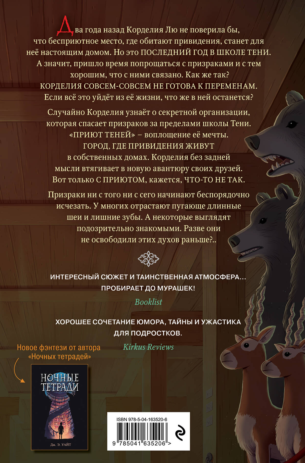 Новая фэнтези-серия от автора бестселлера «НОЧНЫЕ ТЕТРАДИ» Дж. Э. Уайта! «Школа Тени» для поклонников атмосферных и загадочных историй в стиле «Каролины в Стране Кошмаров Нила Геймана, сказок Братьев Гримм и «Дома странных детей». Нетрудно догадаться, что привидения обитают не только в школе Тени. И, кстати, тех, кто их видит, не так-то много - Корделия и Бенджи, например. На экскурсии ребята познакомились с волонтерами из тайной организации, которая занимается спасением призраков, так же, как они. Друзья пришли в настоящий восторг, когда увидели небольшой городок, где все привидения могут жить в своих домах и вести почти обычную жизнь, насколько это возможно, учитывая то, что они… духи. Они о таком и мечтать не могли! И всё это устроил для призраков «Приют Теней». Вот только через какое-то время призраки стали вести себя странно: начали исчезать, светиться, стали злее. Похоже, это место - не райский уголок, и призракам здесь не так сладко, как может показаться на первый взгляд…| Издательство | Эксмо |