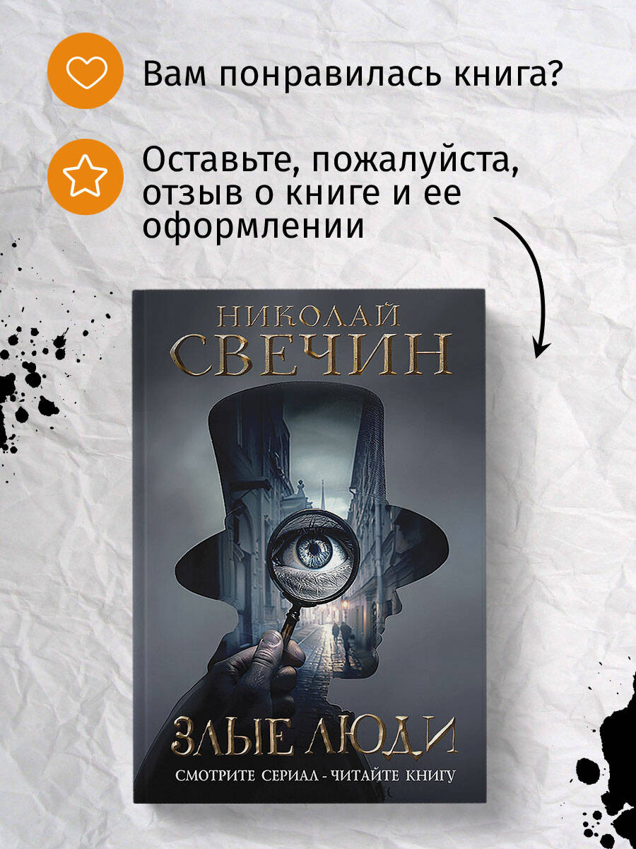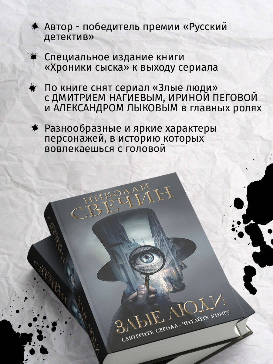 По самой любимой читателями книге Николая Свечина «Хроники сыска» снят сериал «Злые люди». В главных ролях: Пётр Рыков, Александр Лыков, Ян Цапник, Дмитрий Нагиев, Роман Мадянов, Ирина Пегова. На обложке представлен постер сериала. Сборник из семи детективных новелл: - «Вохра» - «Злые люди» - «Дело молитовских отравителей» - «Случай в Окском батальоне» - «Смерть провизора» - «Убийство в губернской гимназии» - «Чиргуши» Бесстрашный сыщик нижегородской полиции Алексей Лыков и его друг и коллега статский советник Павел Благово расследуют дела - одно запутанней другого: о банде конокрадов, о деревне душителей, об убийстве гимназиста, о таинственном кладе Емельяна Пугачева, об отравлении купца ядовитыми перепелами и также - об убийстве аптекаря-наркоторговца. Стильный захватывающий детектив - в лучших традициях ретро-жанра!| Издательство | ООО "Издательство "Эксмо" |