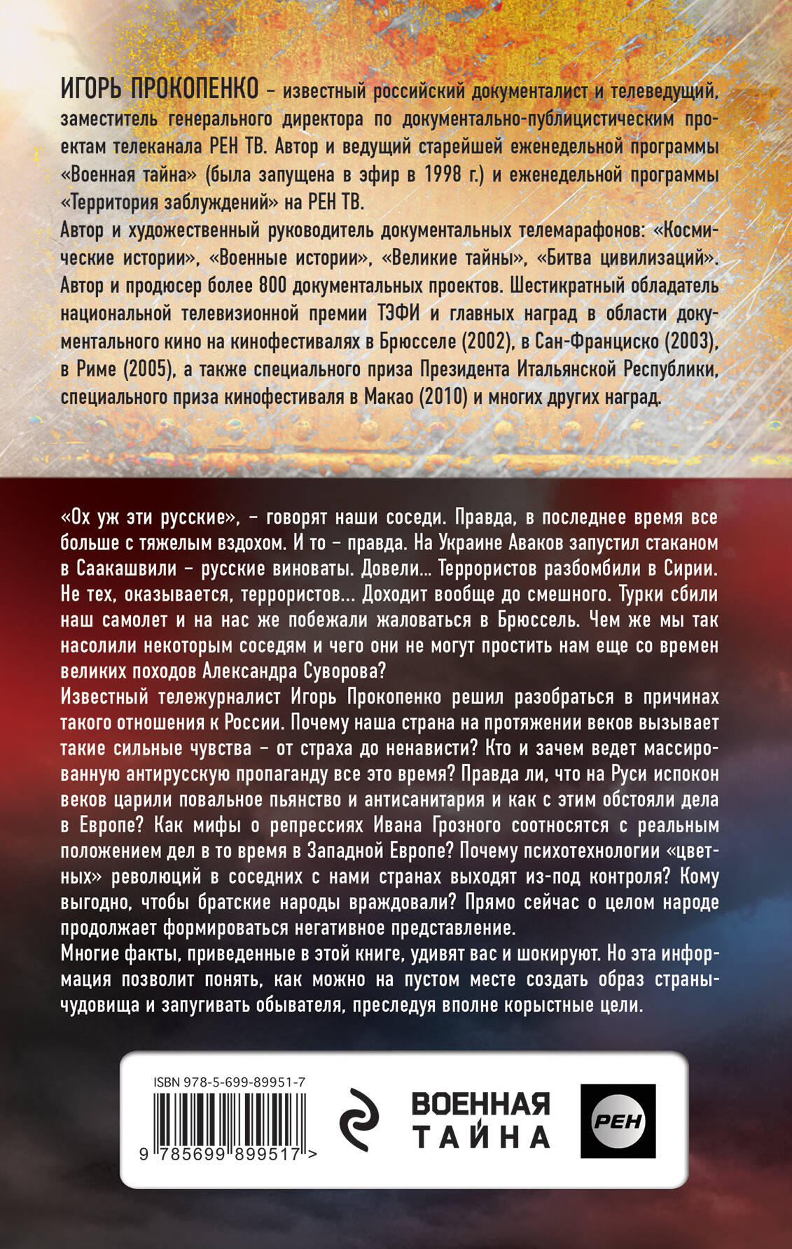 Об авторе Игорь Прокопенко - знаменитый телеведущий, журналист-документалист, историк. Его программы «Военная тайная» и «Теория заблуждений» на РЕН-ТВ пользуются огромной популярностью, ему верят миллионы телезрителей и читателей, свидетельством тому являются высокие рейтинги передач и многотысячные тиражи книг. Автор не обладает каким-то сверхзнанием, он просто умеет сопоставить факты, умело оперирует данными и подробно анализирует общеизвестные истины, делая неожиданные и даже неоднозначные выводы. Жанр Политология. О книге О России ходит множество мифов, тщательно подогреваемых сегодня антироссийской пропагандой. Здесь и пьют с утра до вечера, и медведи по улицам ходят, и не моются, и вообще все русские - варвары. Продолжать можно очень и очень долго. Автор развенчивает самые злые мифы о России, показывая истоки их возникновения, проводя параллели между нашей страной и Западом и предлагая весомые аргументы в пользу как раз обратного. Особенности В своей книге Игорь Прокопенко, как всегда, предлагает интересную информацию, которая позволит понять, как можно на пустом месте создать образ страны-чудовища и запугивать обывателя. Рассматривает актуальные темы: кто ведет антирусскую пропаганду, какие мифы соотносятся с реальным положением дел, кому выгодно, чтобы братские народы враждовали, и многое другое. Дает уникальную пищу для размышлений, которая заставит всерьез задуматься о том, кому нужен образ России-врага.| Издательство | ООО "Издательство "Эксмо" |