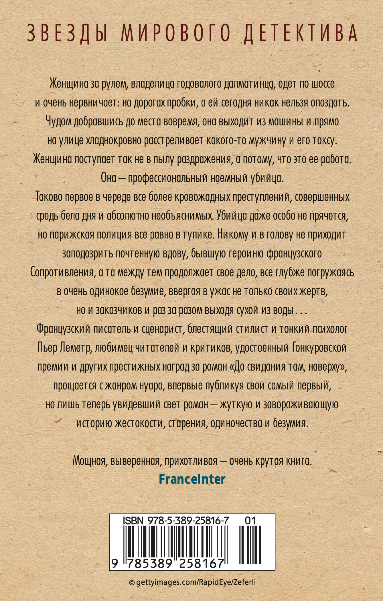 Женщина за рулем, владелица годовалого далматинца, едет по шоссе и очень нервничает: на дорогах пробки, а ей сегодня никак нельзя опоздать. Чудом добравшись до места вовремя, она выходит из машины и прямо на улице хладнокровно расстреливает какого-то мужчину и его таксу. Женщина поступает так не в пылу раздражения, а потому, что это ее работа. Она - профессиональный наемный убийца. Таково первое в череде все более кровожадных преступлений, совершенных средь бела дня и абсолютно необъяснимых. Убийца даже особо не прячется, но парижская полиция все равно в тупике. Никому и в голову не приходит заподозрить почтенную вдову, бывшую героиню французского Сопротивления, а та между тем продолжает свое дело, все глубже погружаясь в очень одинокое безумие, ввергая в ужас не только своих жертв, но и заказчиков и раз за разом выходя сухой из воды... Французский писатель и сценарист, блестящий стилист и тонкий психолог Пьер Леметр, любимец читателей и критиков, удостоенный Гонкуровской премии и других престижных наград за роман "До свидания там, наверху", прощается с жанром нуара, впервые публикуя свой самый первый, но лишь теперь увидевший свет роман - жуткую и завораживающую историю жестокости, старения, одиночества и безумия.