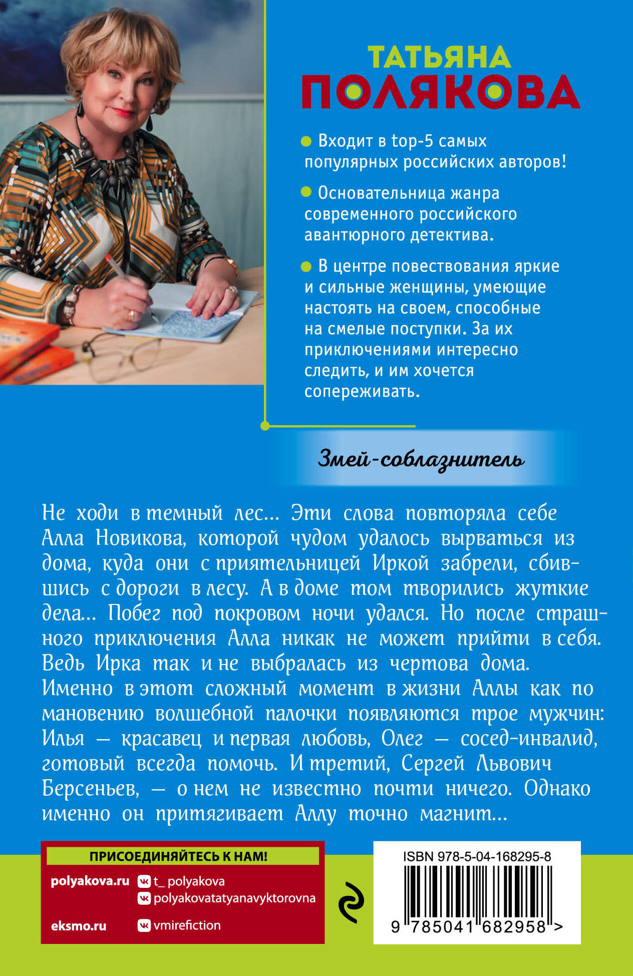 Не ходи в темный лес... Эти слова повторяла себе Алла Новикова, которой чудом удалось вырваться из дома, куда они с приятельницей Иркой забрели, сбившись с дороги в лесу. А в доме том творились жуткие дела.... Побег под покровом ночи удался. Но после страшного приключения Алла никак не может прийти в себя. Ведь Ирка так и не выбралась из чёртова дома. Именно в этот сложный момент в жизни Аллы как по мановению волшебной палочки появляются трое мужчин: Илья - красавец и первая любовь, Олег - сосед-инвалид, готовый всегда помочь. И третий, Сергей Львович Берсеньев, - о нем неизвестно почти ничего. Однако именно он притягивает Аллу точно магнит... Татьяна Полякова - один из самых популярных российских писателей в жанре детектива. За время писательской карьеры из-под ее пера вышло более 85 книг общим тиражом более 36 миллионов экземпляров. По свидетельствам читателей, романы Татьяны Поляковой - это «захватывающий сюжет и непредсказуемая развязка, обаятельные герои и невероятные приключения, легкий стиль и яркие диалоги».| Издательство | Эксмо |