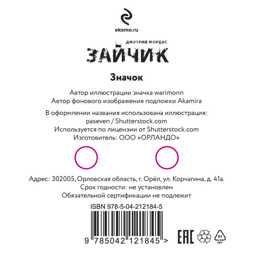 «Зайчик» Дмитрия Мордаса - это не только рассказ, это целая вселенная! Дополни свою фанатскую коллекцию стильным мерчем - эксклюзивным значком с изображением Антона! Хоррор-история «Зайчик» вышла за пределы рассказа и визуальной новеллы. Теперь это еще и комикс, вебтун, мерч! Читай рассказ в классическом варианте или в виде комикса, а может быть, тебе придётся по душе формат вебтуна. Не расставайся с любимыми героями ни на минуту, собери коллекцию мерча с персонажами комикса, состоящую из значков, брелоков, стикерпака и шоппера! И это ещё не всё - список будет пополняться!| Издательство | ООО "Издательство "Эксмо" |