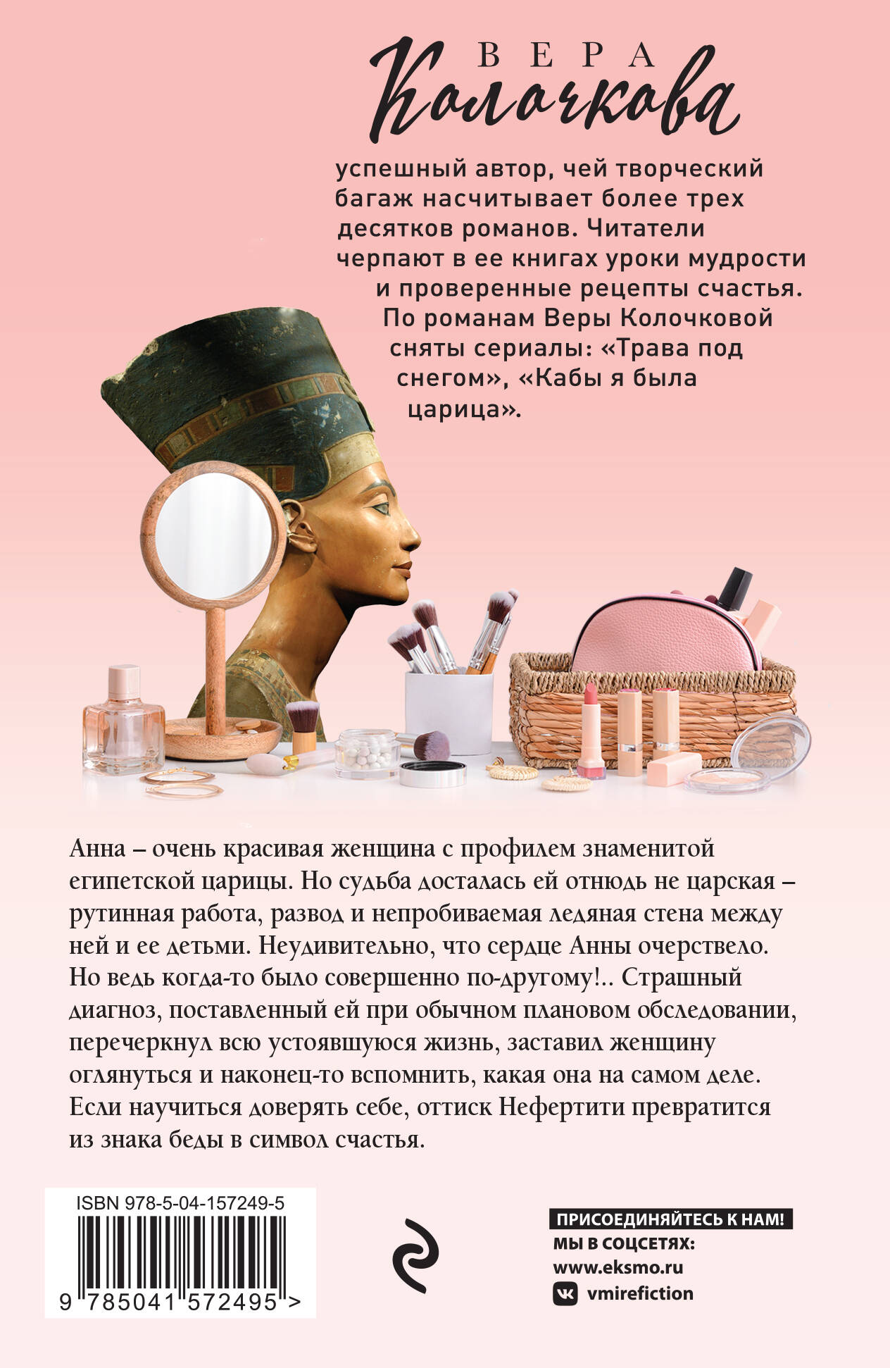 Библиография Веры Колочковой насчитывает более 40 романов, многие из которых уже воплощены на экране. Любовь к автору вполне объяснима, ведь она пишет об обычных людях, которые стремятся к лучшей жизни и борются за собственное счастье. Простые и чувственные, увлекательные и романтичные, романы Колочковой задевают за живое, заставляя сопереживать и радоваться героям как своим знакомым. Анна - очень красивая женщина с профилем знаменитой египетской царицы. Но судьба досталась ей отнюдь не царская - рутинная работа, развод и непробиваемая ледяная стена между ней и ее детьми. Не удивительно, что сердце Анны очерствело. Но ведь когда-то было совершенно по-другому!.. Страшный диагноз, поставленный ей при обычном плановом обследовании, перечеркнул всю устоявшуюся жизнь, заставил женщину оглянуться и наконец-то вспомнить, какая она на самом деле. Если научиться доверять себе, оттиск Нефертити превратится из знака беды в символ счастья.| Издательство | Эксмо |