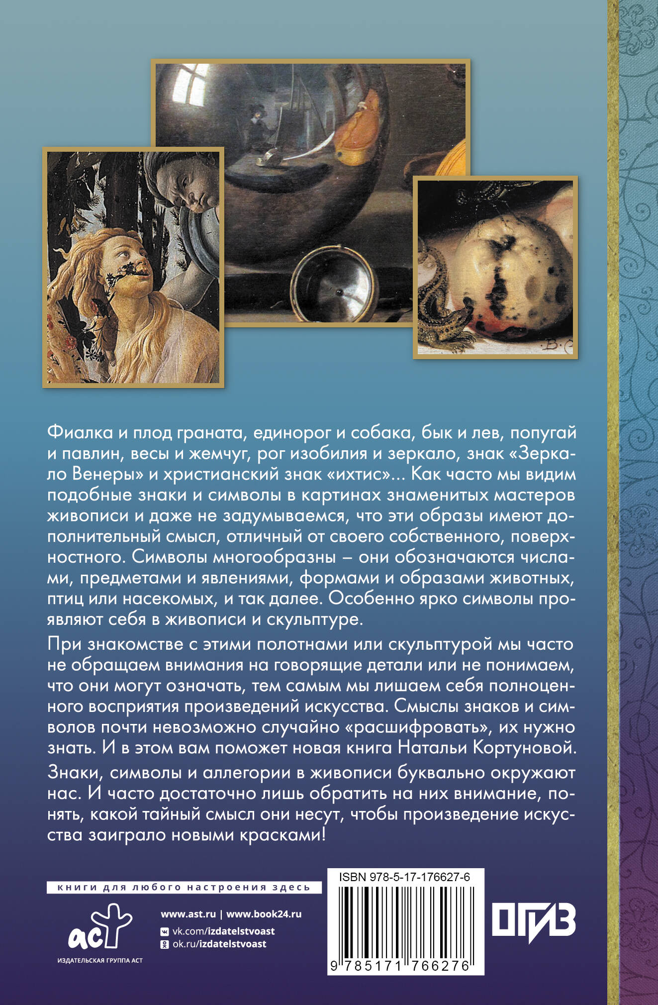Фиалка и плод граната, лев и собака, обезьяна и кошка, попугай и павлин, весы и жемчуг, рог изобилия и зеркало, знак "Зеркало Венеры" и христианский знак "ихтис"… Как часто мы видим эти и другие знаки и символы в картинах известных мастеров и даже не задумываемся, что эти образы имеют дополнительный смысл, отличный от своего собственного, поверхностного. Знаки эти, придающие работам глубины, таинственности и многослойности, существуют не только в области разума, но и в области чувств. Символы многообразны - они обозначаются числами, предметами и явлениями, формами и образами животных, птиц или насекомых, и так далее. Особенно ярко символы проявляют себя в живописи и скульптуре. От создателей этих известных ныне произведений изобразительного искусства нас отделяют сотни лет, а порой и целые тысячелетия. Эти люди существовали в иной системе жизненных координат и верили в иных богов. Сохранившиеся с тех давних времен памятники призваны были не только радовать глаз и удивлять тонкостью исполнения, но и несли в себе зачастую определенную идею, которую современники считывали без особого труда. Мы же, получая при знакомстве с данными памятниками сугубо эстетическое удовольствие, нередко упускаем из виду их смысловое значение, не обращая внимания на говорящие детали или не понимая, что они могут подразумевать, и тем самым мы лишаем себя полноценного восприятия произведений искусства. Смыслы знаков и символов почти невозможно случайно "расшифровать", их нужно знать. И в этом вам поможет новая книга Натальи Кортуновой - известного искусствоведа, старшего научного сотрудника ГМИИ им. А.С. Пушкина, куратора ряда выставок в ГМИИ. Знаки, символы и аллегории в живописи буквально окружают нас. И часто достаточно лишь обратить на них внимание, понять, какой тайный смысл они несут, чтобы произведение искусства заиграло новыми красками!| Издательство | Издательство "АСТ" |