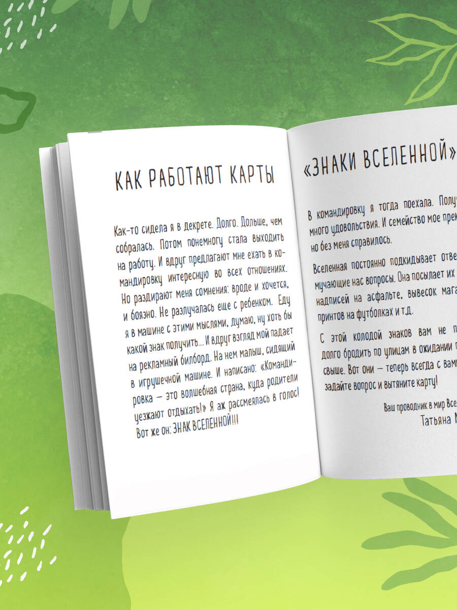 Если задать вопрос Вселенной, она обязательно ответит. Даст знак. Это может быть граффити на стене, рекламный плакат или надпись на футболке прохожего. С авторской колодой знаков Татьяны Мужицкой и Антона Нефедова вам не придется долго бродить по улицам в ожидании послания свыше. Карты в этой колоде - не просто изображения, это история одного из нас, одного знака, одной рожденной мысли, одного принятия и многих реальных шагов, которые меняют нашу жизнь к лучшему. Авторы собирали эти знаки по всей стране, чтобы сейчас вы смогли расслабиться и поговорить со Вселенной. Как пользоваться колодой: • Подумайте о том, что на данный момент является для вас очень важным, и задайте вопрос Вселенной. • Перемешайте колоду и вытяните одну карту. • Взгляните на карту и прислушайтесь к своим самым первым ощущениям. • Свяжите воедино ваши мысли и чувства и дайте ответ самому себе.
