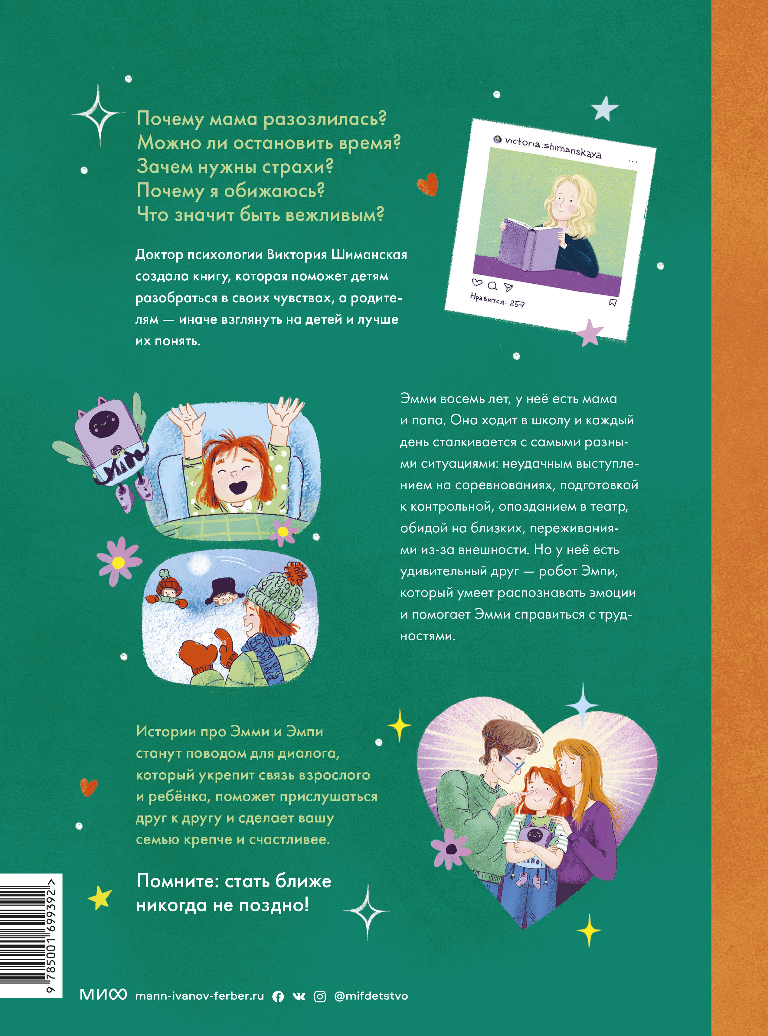 Есть много книг для развития эмоционального интеллекта, но они практически не охватывают возраст младшей школы. Эта книга от эксперта Виктории Шиманской закрывает этот пробел. Откровенно и в доверительной форме вы сможете обсудить с ребенком такие темы, как эмпатия, принятие себя, личные границы, страхи, обиды. После 7 лет - особенный период. Ребенок пошел в школу: нужно освоиться в коллективе, привыкнуть к ежедневным занятиям, делать уроки, ходить на кружки и секции. Появляются новые страхи, новые переживания. Половину дня ребенок проводит в школе, и вот уже кажется, что он отдаляется, становится непонятным, а еще кричит, обижается и топает ногами. Что с ним происходит? Как ему помочь? Как наладить контакт и не потерять доверие? Виктория Шиманская - доктор психологии и эксперт по развитию эмоционального интеллекта - подготовила книгу, которая станет мостиком между вами и вашим взрослеющим ребенком. В ней вы найдете истории про девочку Эмми и удивительного робота Эмпи, который умеет читать эмоции. Вместе они попадают в понятные и знакомые каждому ситуации: неудачное выступление на соревнованиях, подготовка к контрольной, опоздание в театр, обида на близких, переживания из-за внешности. Эмпи помогает Эмми разобраться в себе, понять родителей и окружающих людей. Герои этих историй не идеальны, они так же, как все мы, ошибаются и что-то делают не так, но непременно находят выход из всех сложных ситуаций. Мы предлагаем вам читать истории вместе с ребенком и обсуждать. Главы короткие - на чтение и разговоры будет уходить буквально 15 минут в день. Это поможет вам лучше настроиться друг на друга и стать ближе. Для кого эта книга: Для родителей детей от 7 лет. Для родителей, которые хотят быть ближе со своим ребенком. От автора: Будет здорово, если вы попробуете читать эту книгу вашим детям вслух, даже если они сами умеют читать. Наверняка после каждой главы вам будет о чем подумать, захочется что-то обсудить, с чем-то поспорить. И это хорошо! Непременно обсуждайте с ребенком ситуации из книги, поведение героев, говорите, что вас смущает, спрашивайте, что удивило ребенка. Если же вы захотите "поиграть в Эмпи", послушать себя и свои эмоции, придумать новую ситуацию и разыграть ее, объяснить, что вы чувствуете, найти новое решение в сложной ситуации - это будет вообще замечательно. А чтобы вам было удобнее читать книгу, мы снабдили ее специальным навигатором по эмоциональному интеллекту. В нем очень коротко - скорее для вдохновения - раскрываются темы, связанные с развитием эмоционального интеллекта у детей, и даются подсказки, какую историю из книги прочитать на интересующую тему. Навигатор вы можете использовать как оглавление: выбрать и прочитать ребенку историю на ту тему, которая сегодня вас занимает больше всего, найти истории, связанные с каким-то событием, которое поразило вас сегодня и которое хочется обсудить с ребенком. А можно заглядывать в навигатор как в справочник: если после прочитанной истории у вас появились вопросы или что-то вызвало недоумение.| Издательство | МАНН, ИВАНОВ И ФЕРБЕР ООО |