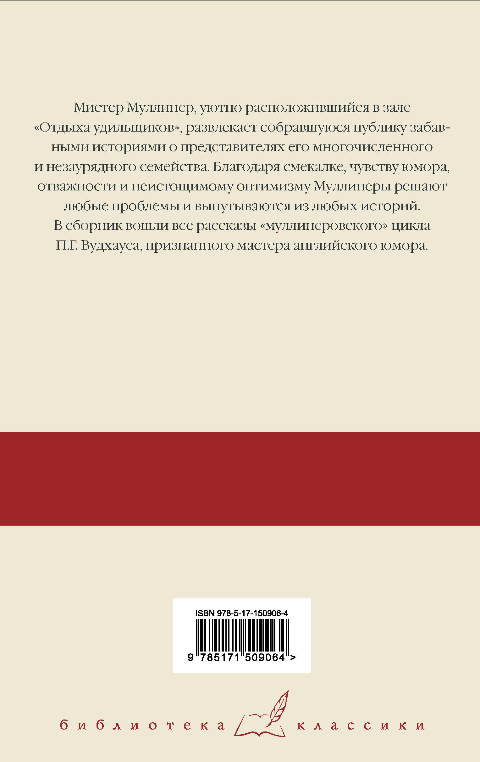 Мистер Муллинер, уютно расположившийся в зале "Отдыха удильщиков", развлекает собравшуюся публику забавными историями о представителях его многочисленного и незаурядного семейства. Благодаря смекалке, чувству юмора, отважности и неистощимому оптимизму Муллинеры решают любые проблемы и выпутываются из любых историй. В сборник вошли все рассказы "муллинеровского" цикла П.Г. Вудхауса, признанного мастера английского юмора.| Издательство | ИЗДАТЕЛЬСТВО "АСТ" |