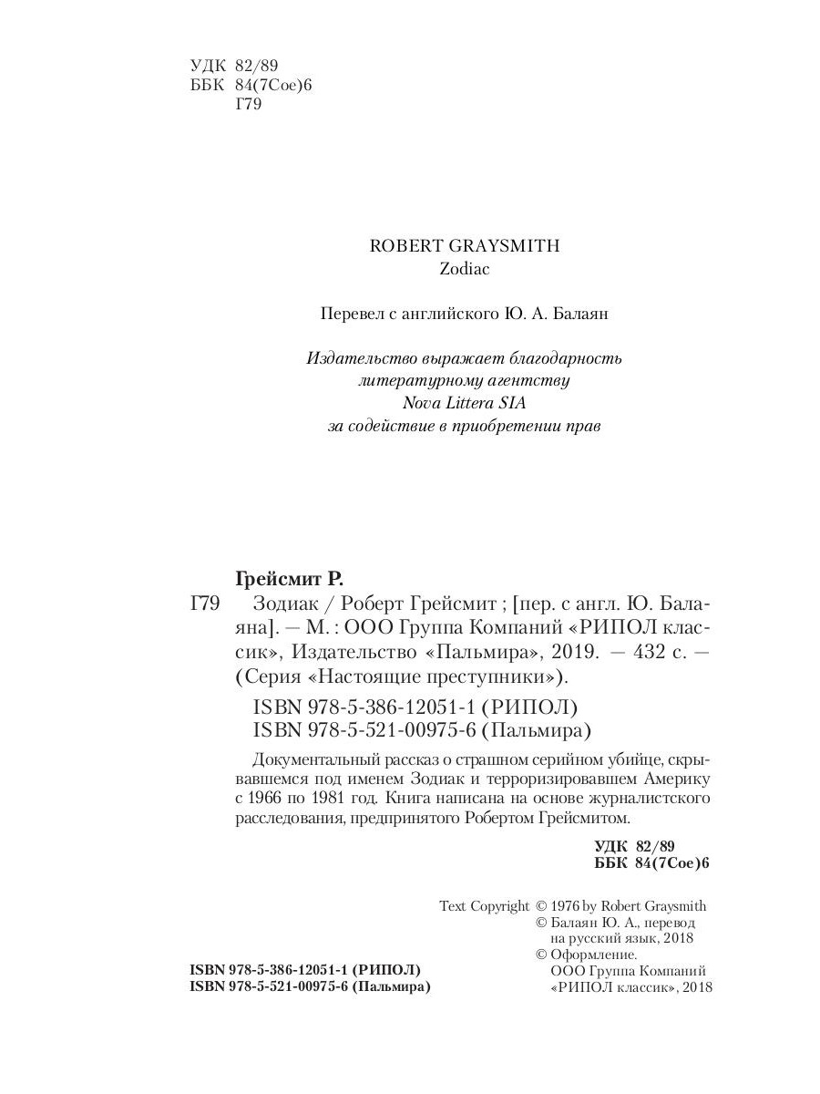 Документальный рассказ о страшном серийном убийце, скрывавшемся под именем Зодиак и терроризировавшем Америку с 1966 по 1981 год. Книга написана на основе журналистского расследования, предпринятого Робертом Грейсмитом.| Издательство | Рипол Классик |