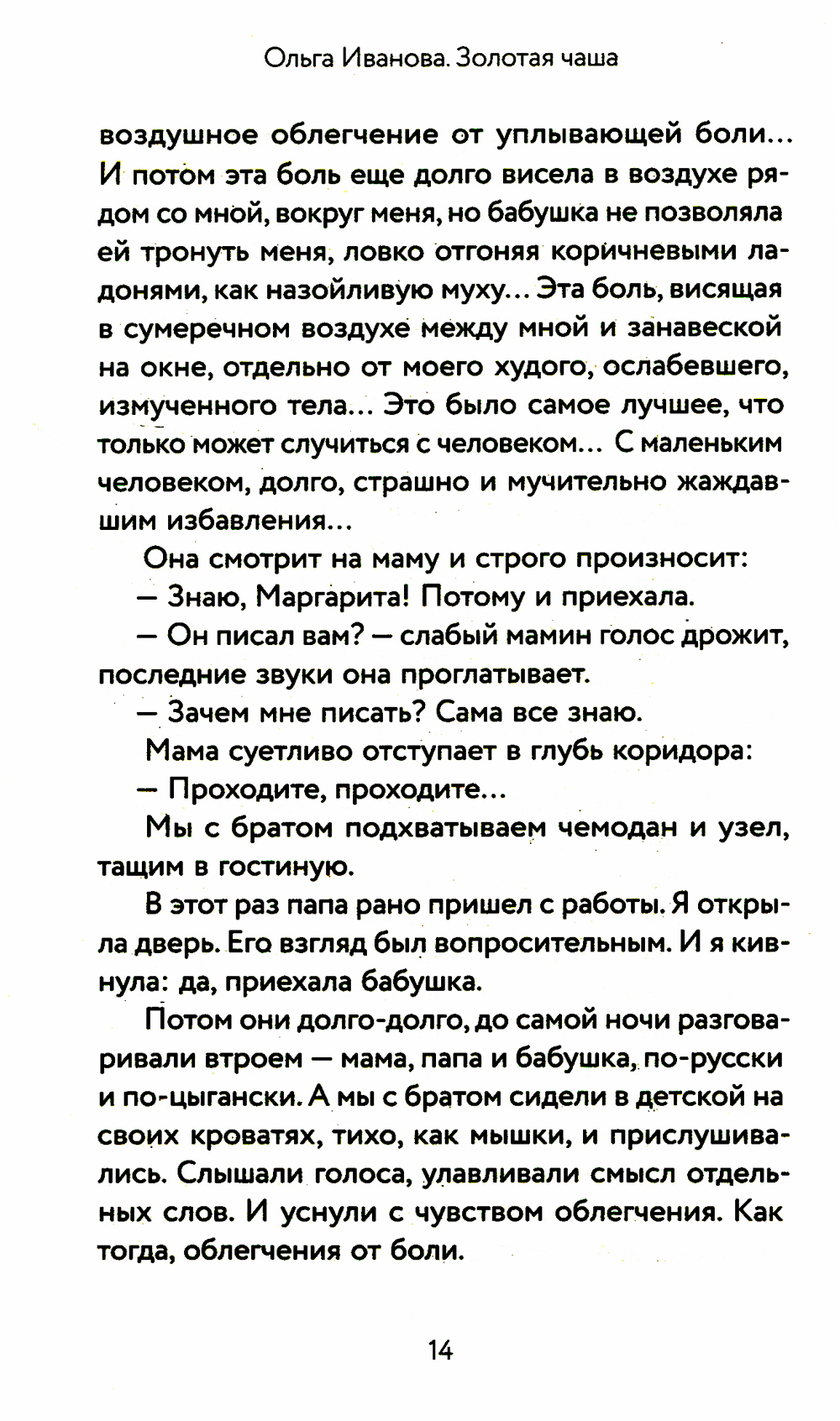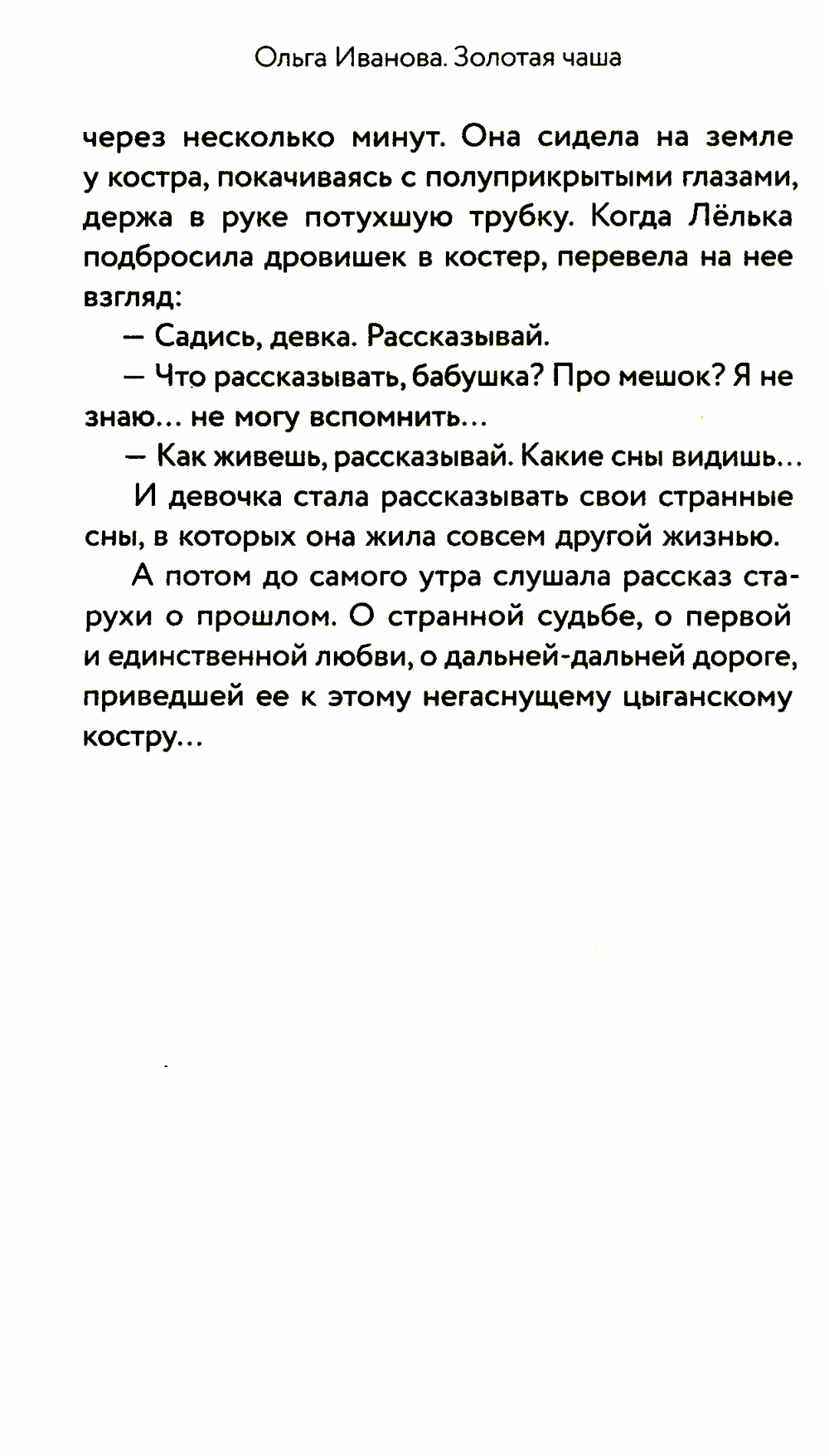 Потерявшийся человек может обрести дом в любящем сердце. В коммунальной квартире обыденную серость дней советской семьи скрашивает бабушка - загадочная старая цыганка. Благодаря ей в жизнь семьи приходят яркие эмоции - любовь, радость и восхищение. Магия золотой чаши погружает нас в жизнь табора. Мы греемся у огромного костра, а затем танцуем вокруг с непоседливыми детьми. Порой мы плачем, а иногда замолкаем на полуслове и скорбим. Герои историй напоминают нам об истине, которую легко забыть в рутине: все мы одинаковые и все мы хотим любви. Несмотря на разные взгляды, обычаи и традиции, сердцем всё равно желаем одного и того же.| Издательство | ИД Мещерякова |