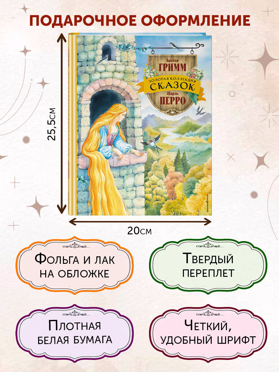 Издание подарочного формата. Твёрдый переплёт с тиснением фольгой и частичным лаком. Плотная белая бумага. Чёткий, удобный для чтения шрифт. Полноцветные иллюстрации. Классические переводы Григория Петникова и Ивана Тургенева. Шестнадцать самых известных европейских сказок, собранных великими мастерами Братьями Гримм и Шарлем Перро, составляют поистине бесценную коллекцию народной мудрости. В увлекательных сюжетах среди волшебных миров и фантастических героев скрываются сокровища вечных ценностей: преданная любовь, искренняя дружба, верность данному слову, отвага и решительность. Современная московская художница Елена Шафранская создала вдохновенные и выразительные образы золотоволосой Рапунцель, хитроумного Кота в сапогах, трудолюбивой Золушки, очаровательных Беляночки и Розочки и ещё многих любимых героев. Эта прекрасная книга станет прекрасным подарком мальчикам и девочкам к любому празднику: к Рождеству и Новому году, ко дню рождения или к окончанию учебного года. Юные читатели с удовольствием откроют её и в долгие зимние вечера, и в дни школьных каникул.| Издательство | ООО "Издательство "Эксмо" |