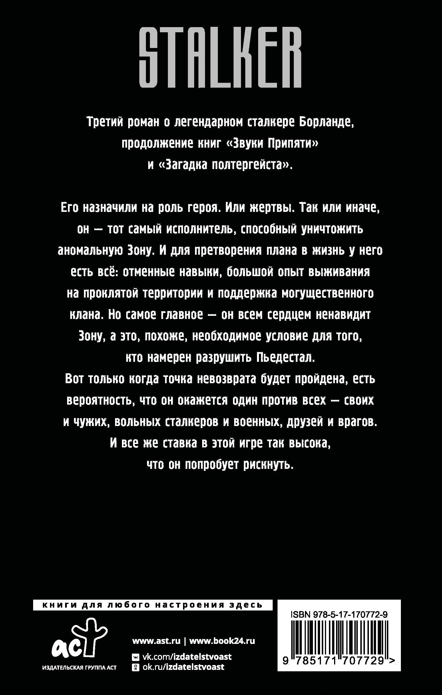- Фантастический роман, навеянный повестью «Пикник на обочине» Стругацких и последующими событиями в Чернобыле. - Третья книга о легендарном сталкере Борланде. Долгожданное продолжение романов «Звуки Припяти» и «Загадка полтергейста». - Сергей Недоруб - талантливый писатель-фантаст, корифей культового проекта «S.T.A.L.K.E.R.», вдохновленного одноименной серией игр. Автор серии «Версиана», романов «Метро 2035. Красный вариант», «Севастопольский дозор» и др. Мастер нетривиальных сюжетов и инженер интересных локаций. - Серия Stalker - приключения исследователей аномальных зон в разных мирах и охота за опасными артефактами.| Издательство | Издательство "АСТ" |