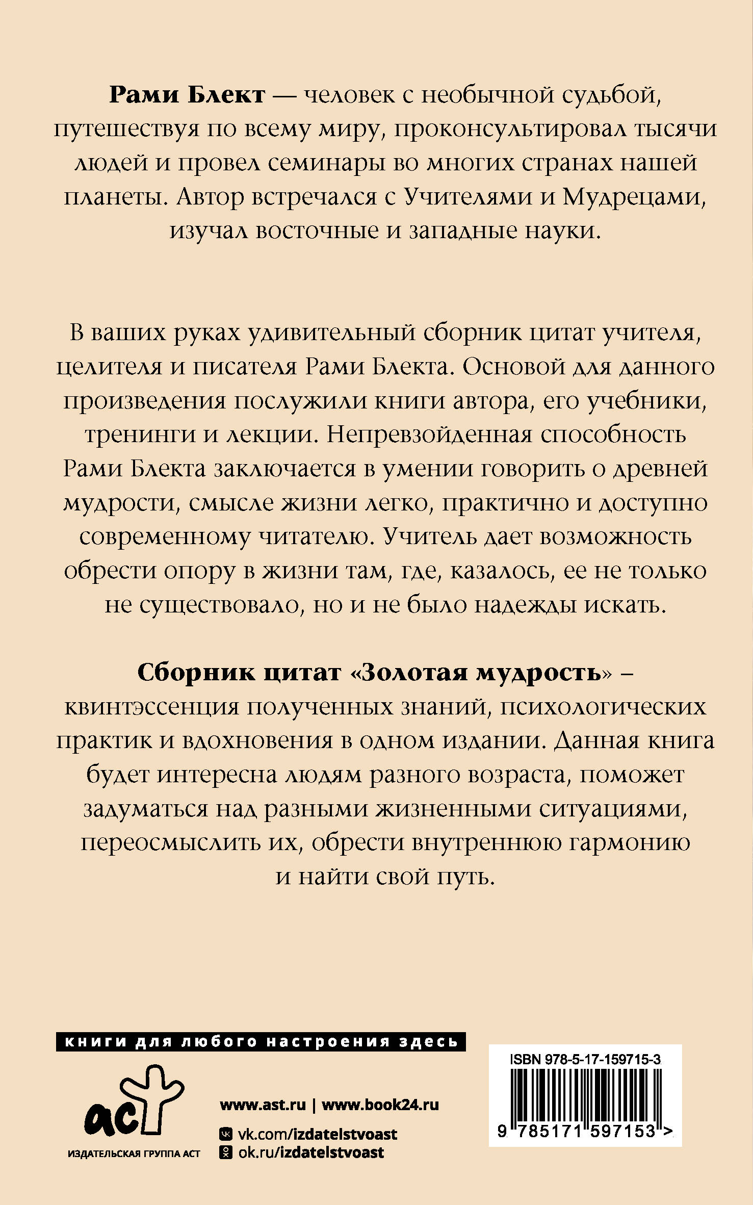 Рами Блект - учитель, целитель, писатель. Путешествуя практически по всему миру, проконсультировал тысячи людей и провёл семинары во многих странах нашей планеты. Автор встречался с Учителями и Мудрецами, изучал восточную и западную мудрость. На протяжении нескольких лет в рейтинге 100 самых известных учителей современности был признан лучшим за вклад в развитие людей. Также признан лучшим психологом-тренером на Международном фестивале звёзд психологии. В ваших руках удивительный сборник цитат Рами Блекта. Основой для данного произведения послужили книги автора, его учебники, тренинги и лекции. Непревзойдённая способность Рами Блекта заключается в умении говорить о древней мудрости, смысле жизни, коротко, легко, практично и доступными словами. Учитель даёт возможность обрести опору в жизни там, где казалось её не только не существовало, но и не было надежды искать. Сборник цитат "Золотая мудрость" - квинтэссенция полученных знаний, психологических практик и вдохновения в одном издании. Данная книга будет интересна людям разного возраста, поможет задуматься над разными жизненными ситуациями, переосмыслить их, обрести внутреннюю гармонию и найти свой путь.| Издательство | Издательство "АСТ" |