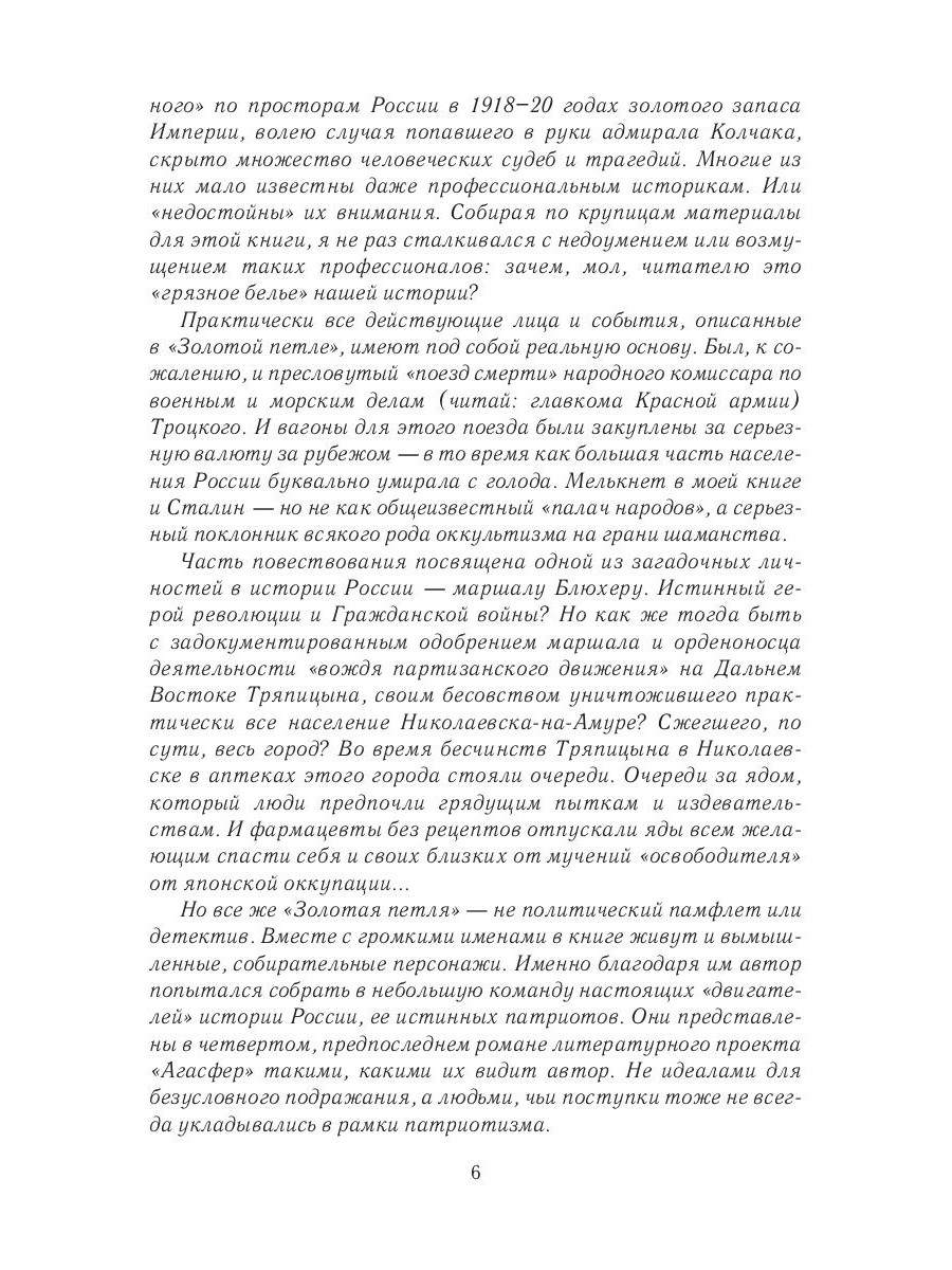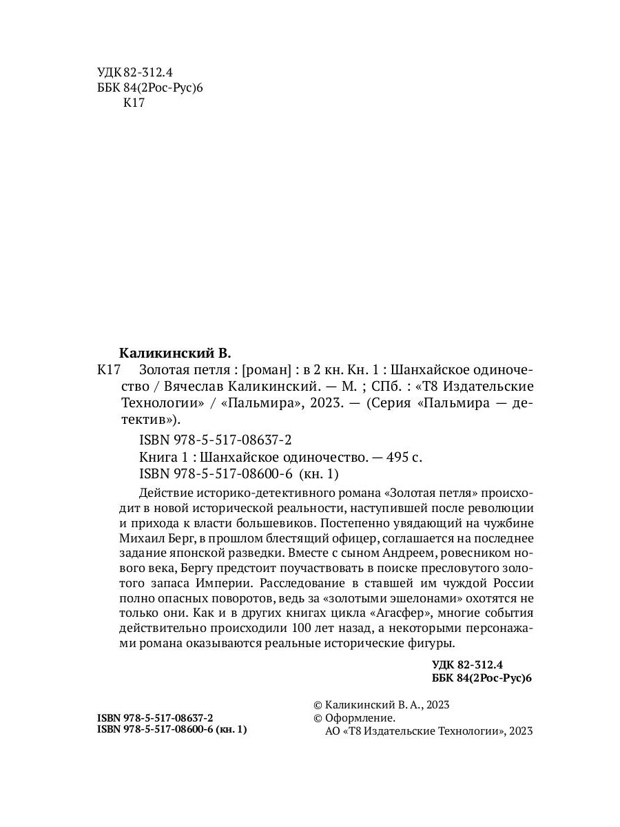 Вячеслав Александрович Каликинский (р. 1951) - прозаик, журналист, член Союза писателей России, лауреат ряда журналистских премий, в том числе премии имени А. П. Чехова. Живет и работает в Южно-Сахалинске. Серия книг "Агасфер" - это цикл шпионских ретродетективов, посвященных работе контрразведки России в конце XIX - начале XX века. Действие историко-детективного романа "Золотая петля" происходит в новой исторической реальности, наступившей после революции и прихода к власти большевиков. Постепенно увядающий на чужбине Михаил Берг, в прошлом блестящий офицер, соглашается на последнее задание японской разведки. Вместе с сыном Андреем, ровесником нового века, Бергу предстоит поучаствовать в поиске пресловутого золотого запаса Империи. Расследование в ставшей им чуждой России полно опасных поворотов, ведь за "золотыми эшелонами" охотятся не только они. Как и в других книгах цикла "Агасфер" многие события происходили в действительности 100 лет назад, а некоторыми персонажами романа оказываются реальные исторические фигуры.| Издательство | Т8 RUGRAM |