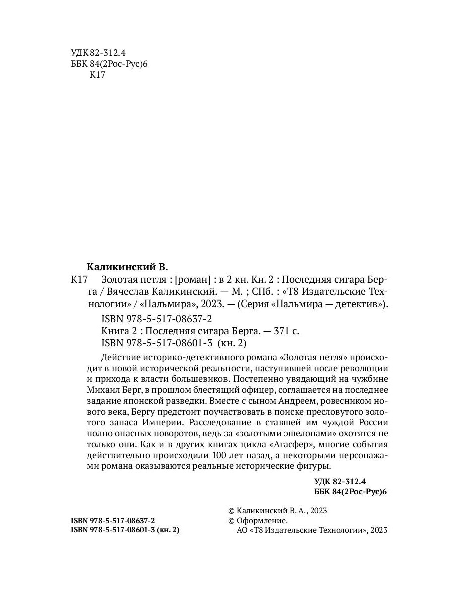 Вячеслав Александрович Каликинский (р. 1951) - прозаик, журналист, член Союза писателей России, лауреат ряда журналистских премий, в том числе премии имени А. П. Чехова. Живет и работает в Южно-Сахалинске. Серия книг "Агасфер" - это цикл шпионских ретродетективов, посвященных работе контрразведки России в конце XIX - начале XX века. Действие историко-детективного романа "Золотая петля" происходит в новой исторической реальности, наступившей после революции и прихода к власти большевиков. Постепенно увядающий на чужбине Михаил Берг, в прошлом блестящий офицер, соглашается на последнее задание японской разведки. Вместе с сыном Андреем, ровесником нового века, Бергу предстоит поучаствовать в поиске пресловутого золотого запаса Империи. Расследование в ставшей им чуждой России полно опасных поворотов, ведь за "золотыми эшелонами" охотятся не только они. Как и в других книгах цикла "Агасфер" многие события происходили в действительности 100 лет назад, а некоторыми персонажами романа оказываются реальные исторические фигуры.