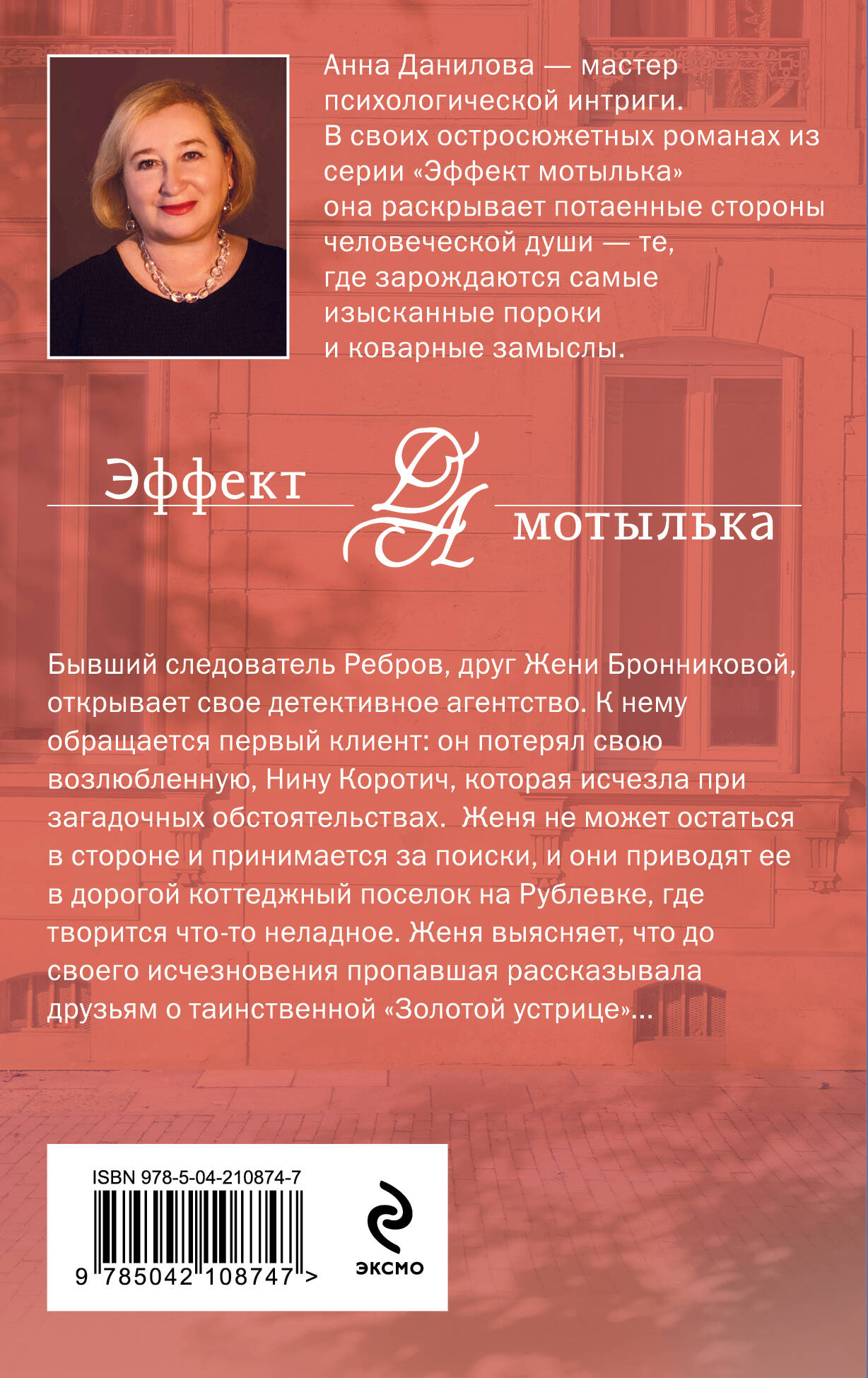 Остросюжетные романы Анны Даниловой - это увлекательные детективы, в которых автор при помощи психологических головоломок и сложных хитросплетений чувств раскрывает глубинные мотивы, толкнувшие героев на преступления. Бывший следователь Ребров, друг Жени Бронниковой, открывает свое детективное агентство. К нему обращается первый клиент: он потерял свою возлюбленную, Нину Коротич, которая исчезла при загадочных обстоятельствах. Женя не может остаться в стороне и принимается за поиски, и они приводят ее в дорогой коттеджный поселок на Рублевке, где творится что-то неладное. Женя выясняет, что до своего исчезновения пропавшая рассказывала друзьям о таинственной «Золотой устрице»...