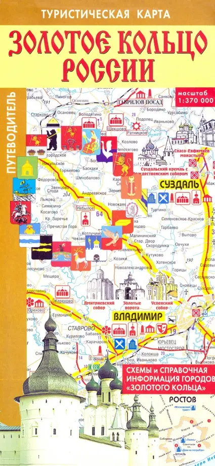Складная туристическая карта "Золотое кольцо России" посвящена уникальному региону нашей страны, расположенному в междуречье Волги и Оки, где сосредоточены древние русские города, без которых немыслима история России. Масштаб карты 1:370 000 (в 1 см 3,7 км) и специально разработанная система условных обозначений позволили во всем многообразии представить имеющиеся в городах Золотого кольца исторические, архитектурные, религиозные и культурные памятники, многие из которых входят в список объектов Всемирного наследия ЮНЕСКО. На карте также подробно показана сеть автомобильных и железных дорог, обеспечивающих доступ к каждому из городов. Оборот карты представляет собой путеводитель по городам Золотого кольца, содержание которого составляют описания автомобильных маршрутов, исторические справки о каждом городе, адреса и месторасположение гостиниц, схемы городов Золотого кольца, их главные достопримечательности и музеи.