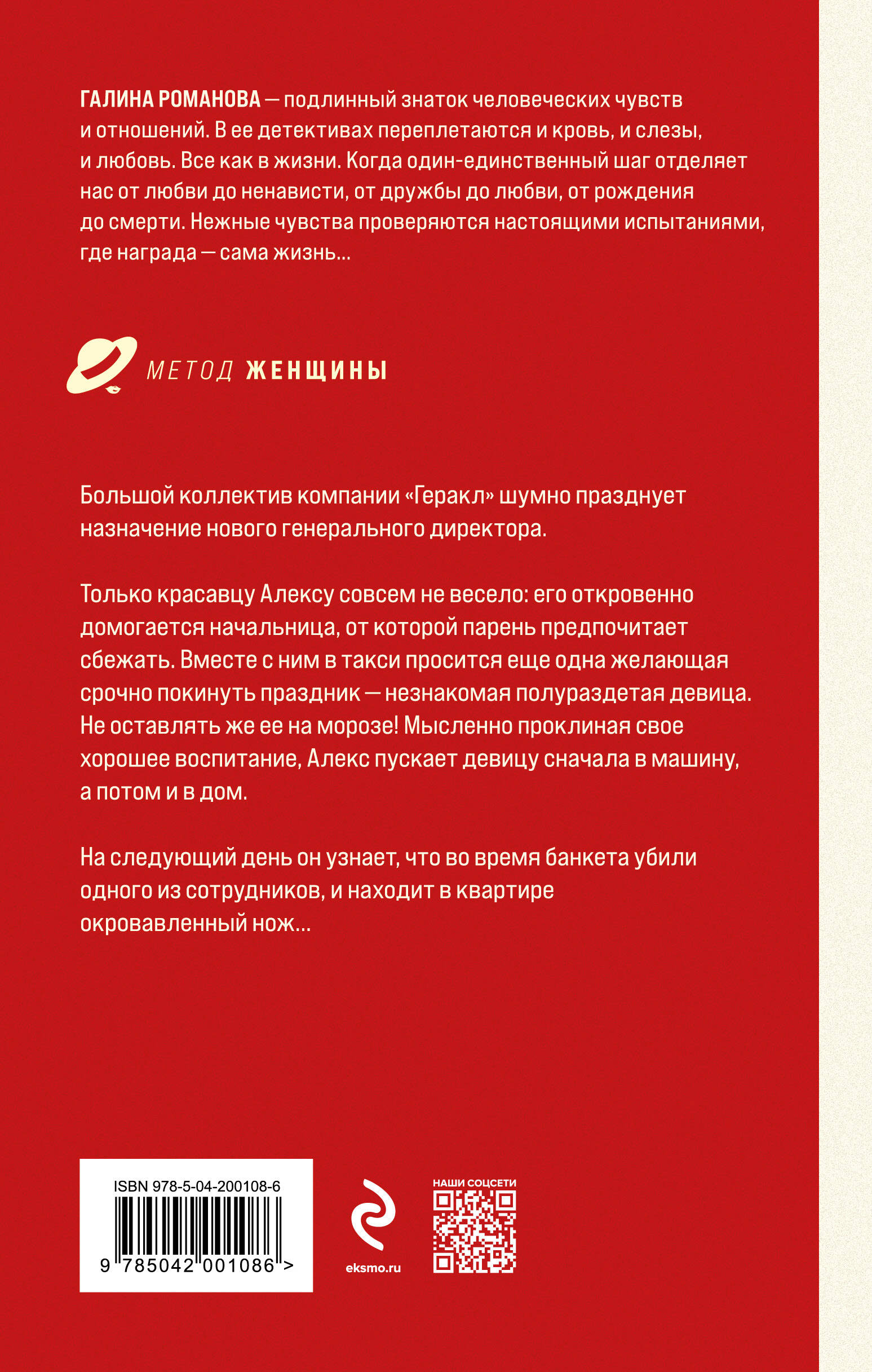 Большой коллектив компании «Геракл» шумно празднует назначение нового генерального директора. Только красавцу Алексу совсем не весело: его откровенно домогается начальница, от которой парень предпочитает сбежать. Вместе с ним в такси просится еще одна желающая срочно покинуть праздник - незнакомая полураздетая девица. Не оставлять же ее на морозе! Мысленно проклиная свое хорошее воспитание, Алекс пускает девицу сначала в машину, а потом и в дом. На следующий день он узнает, что во время банкета убили одного из сотрудников, и находит в квартире окровавленный нож… Галина Романова - подлинный знаток человеческих чувств и отношений. В ее детективных мелодрамах из серии «Метод женщины» переплетаются и кровь, и слезы, и любовь. Все, как в реальности, когда один-единственный шаг отделяет нас от любви до ненависти, от дружбы до любви, от рождения до смерти. Нежные чувства проверяются настоящими испытаниями, где награда - сама жизнь.| Издательство | ООО "Издательство "Эксмо" |