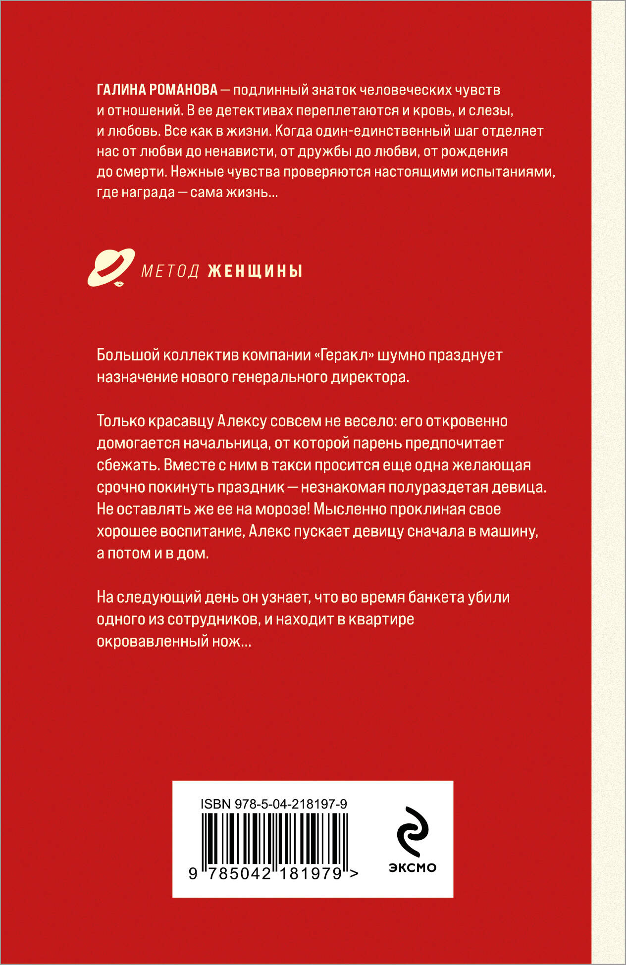 Большой коллектив компании «Геракл» шумно празднует назначение нового генерального директора. Только красавцу Алексу совсем не весело: его откровенно домогается начальница, от которой парень предпочитает сбежать. Вместе с ним в такси просится еще одна желающая срочно покинуть праздник - незнакомая полураздетая девица. Не оставлять же ее на морозе! Мысленно проклиная свое хорошее воспитание, Алекс пускает девицу сначала в машину, а потом и в дом. На следующий день он узнает, что во время банкета убили одного из сотрудников, и находит в квартире окровавленный нож… Новая книга Галины Романовой - очень интригующая и трогательная история о том, насколько мы ответственны за то, что делаем со своей собственной жизнью. Несколько увлекательных сюжетных линий, повествующих о судьбах разных людей, развиваются параллельно, чтобы в финале сплестись в тугой узел, когда все тайны будут раскрыты, а злодеи выведены на чистую воду.| Издательство | ООО "Издательство "Эксмо" |