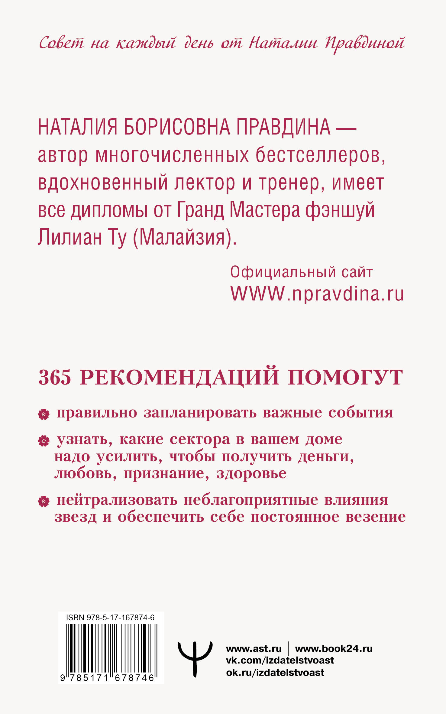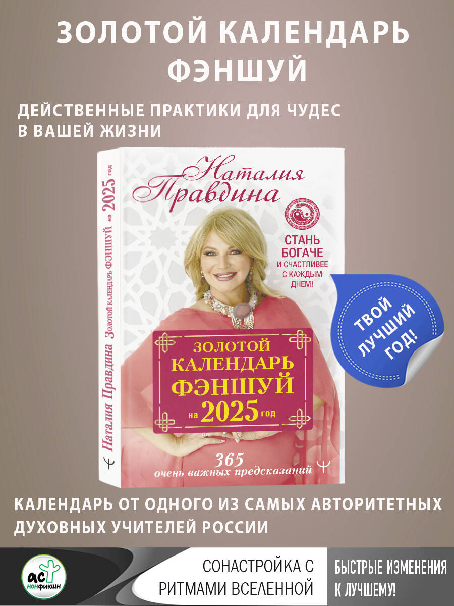 Древняя китайская пословица гласит: "На первом месте - судьба, на втором месте - удача, на третьем - фэншуй". Очень хорошо иметь счастливую судьбу, но это только часть вашего успеха - вам понадобится еще фэншуй! В "Золотом календаре фэншуй на 2025 год. 365 очень важных предсказаний. Стань богаче и счастливее с каждым днем!" Наталии Правдиной вы найдете подробные рекомендации на каждый день предстоящего года, чтобы все шло как по маслу. Практики и ритуалы фэншуй позволят направить течение событий в нужное русло и быть во всеоружии перед важными моментами. Вы сможете: • правильно запланировать значимые для вас события; • узнать, какие сектора в вашем доме надо усилить, чтобы получить деньги, любовь, признание, здоровье; • нейтрализовать неблагоприятные влияния звезд и обеспечить себе постоянное везение.| Издательство | Издательство "АСТ" |