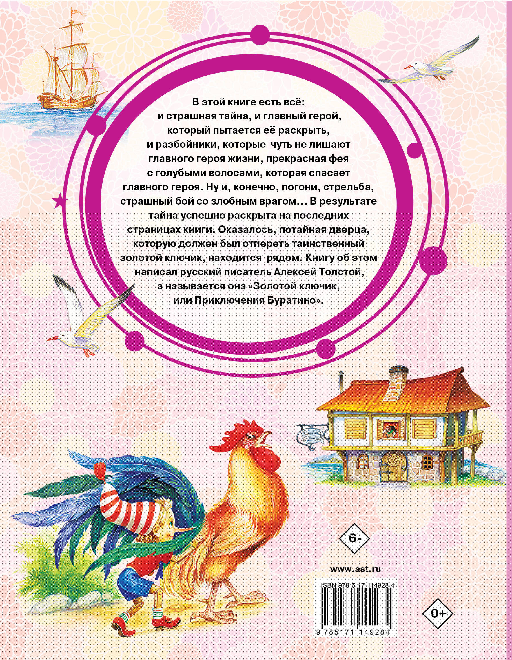 В этой книге есть всё: и страшная тайна, и главный герой, который пытается её раскрыть, и разбойники, которые чуть не лишают главного героя жизни, прекрасная фея с голубыми волосами, которая спасает главного героя. Ну и конечно погони, стрельба, страшный бой со злобным врагом… В результате тайна успешно раскрыта на последних страницах книги. Оказалось, потайная дверца, которую должен был отпереть таинственный золотой ключик, находится рядом. Книгу об этом написал русский писатель Алексей Толстой, а называется она «Золотой ключик, или Приключения Буратино».| Издательство | Издательство "АСТ" |