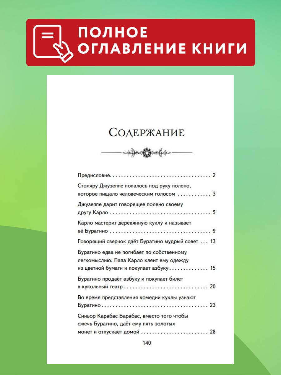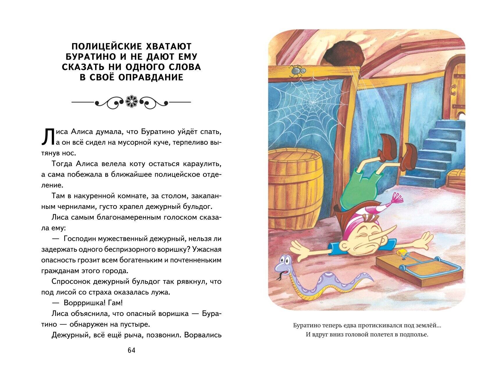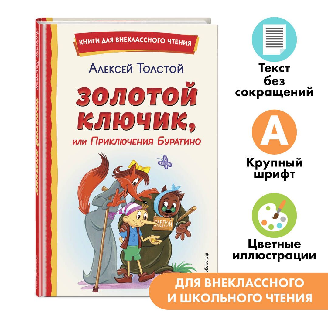 Серия «Книги для внеклассного чтения» - это подборка главных произведений русских и зарубежных авторов, входящих в школьную программу. Лучшие произведения детской литературы с цветными иллюстрациями помогут привить ребёнку любовь к чтению. С самого появления на свет жизнь деревянного мальчика Буратино наполнена приключениями! Он посещает кукольный театр, где находит новых друзей, едва не погибает от рук коварного Карабаса Барабаса и попадает в лапы жуликов. Но жизнь маленького человечка меняется, когда он узнаёт тайну, спрятанную на дне пруда. Теперь Буратино предстоит разгадать секрет, а верные друзья помогут преодолеть любые препятствия!| Издательство | Эксмо |