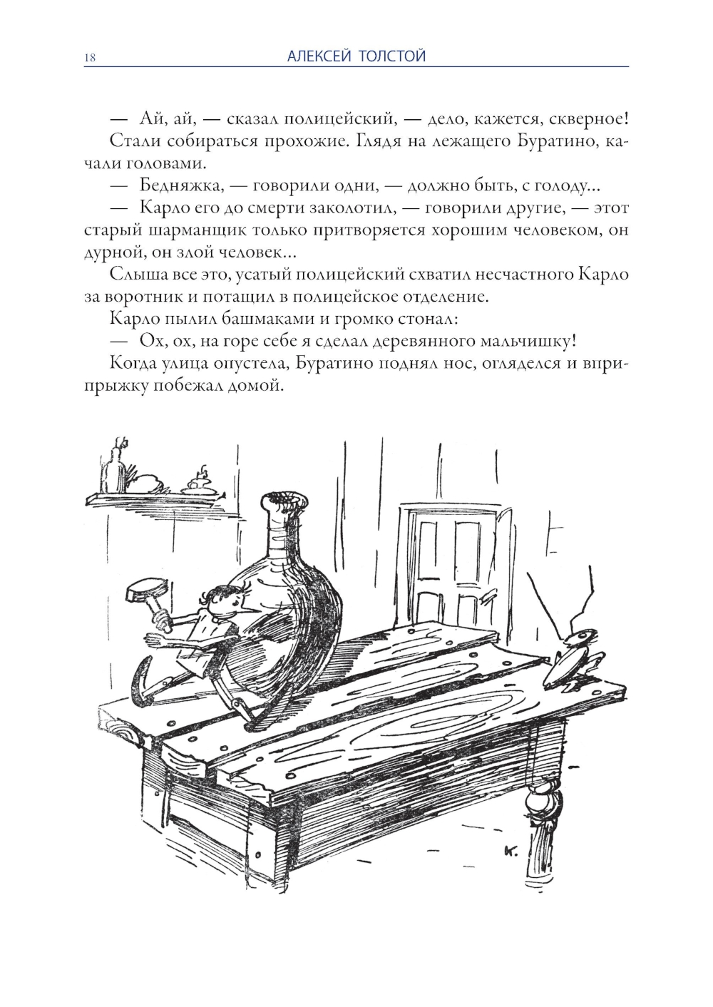 Впервые Алексей Николаевич Толстой (1883-1945) познакомился с историей о Пиноккио итальянского писателя Карло Коллоди, когда в 1923 г. засел за редактуру перевода этой сказки, выполненного известной в конце XIX в. писательницей Н. И. Петровской. Сказка ему понравилась, и в 1933 г. Толстой взялся за собственное изложение приключений ожившей деревянной куклы. Однако ему не нравились нравоучения Коллоди, который то и дело наставлял своих читателей, показывая, как ошибки Пиноккио приносят всевозможные беды и несчастья. Тогда Толстой решил переделать сказку Коллоди на свой манер, и в результате на свет появился настоящий бриллиант - «Приключения Буратино» (от итал. Burattino - «кукла», «марионетка»). Фея из сказки Коллоди превратилась в Мальвину, добрый хозяин кукольного театра Манжафоко - в злобного Карабаса-Барабаса, а сам Буратино стал озорным весельчаком и неисправимым оптимистом. Вся история о его приключениях обрела необычайный динамизм.| Издательство | СЗКЭО |