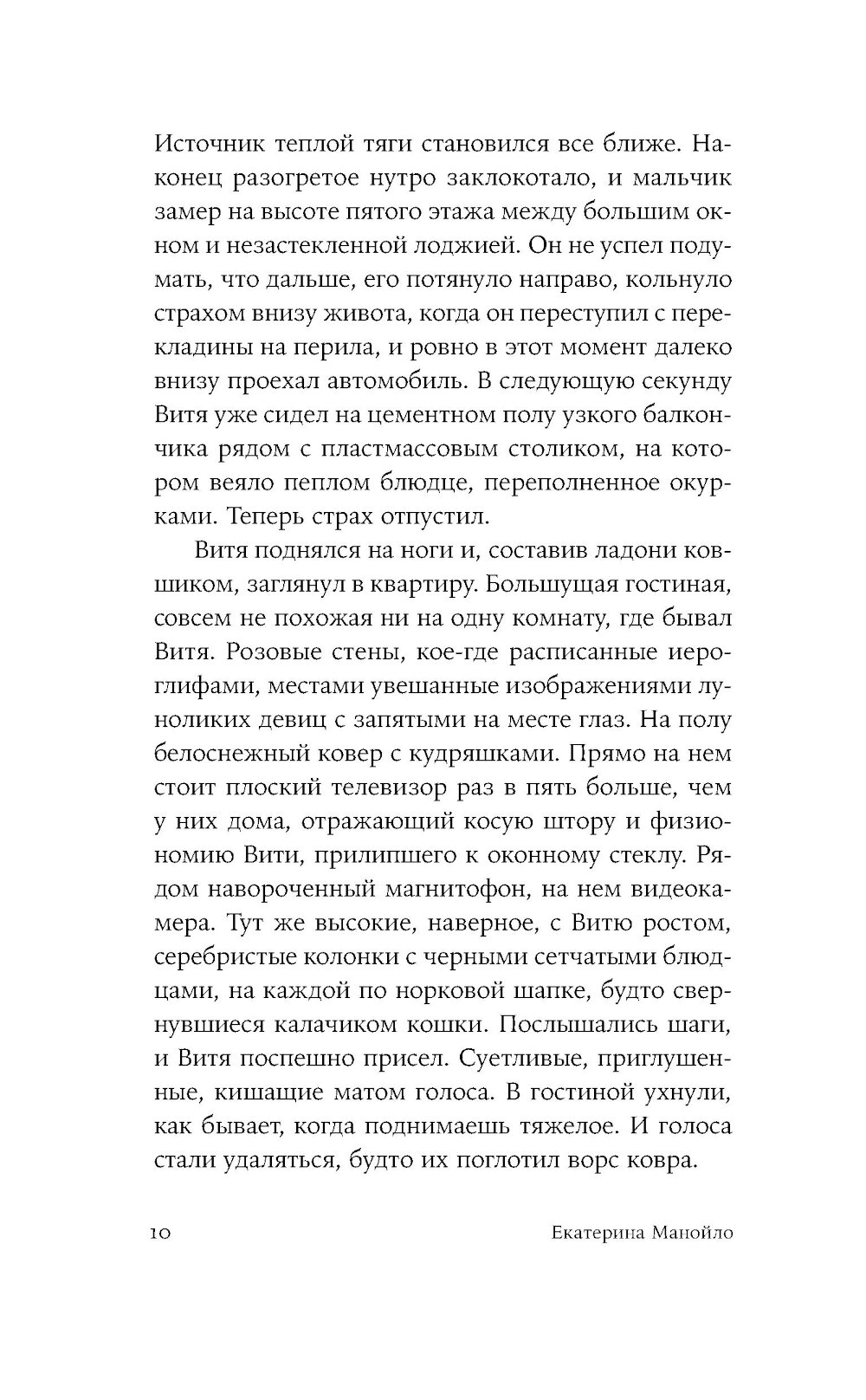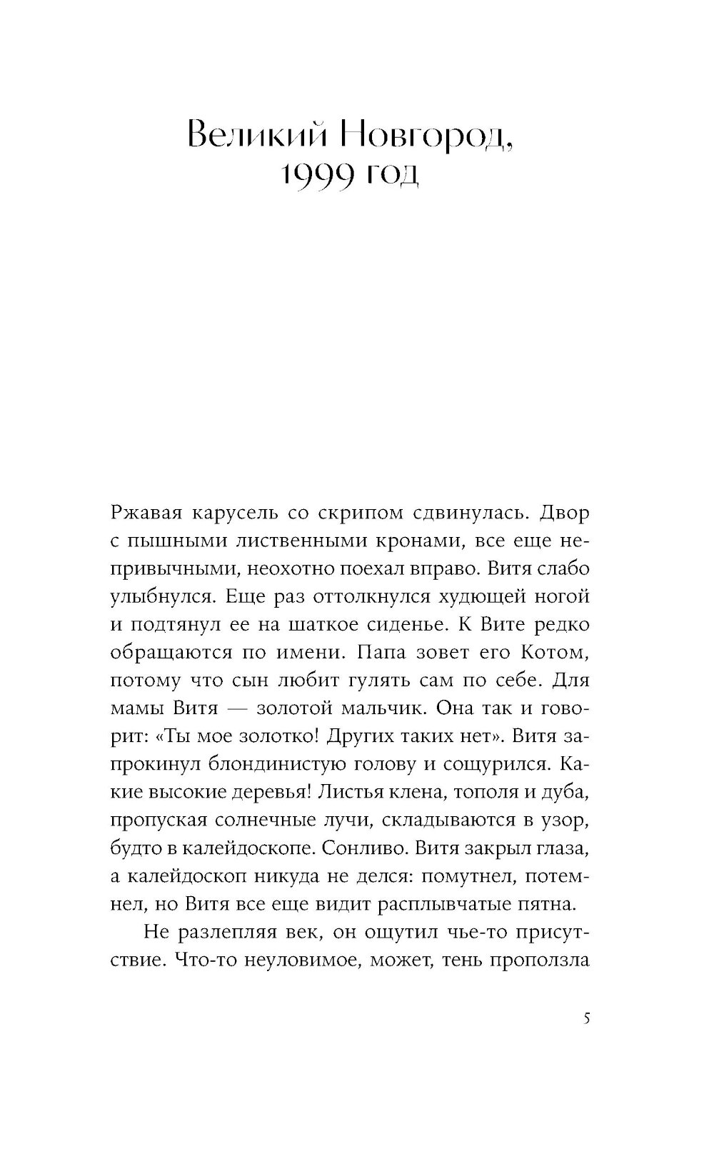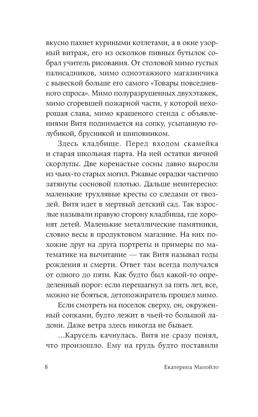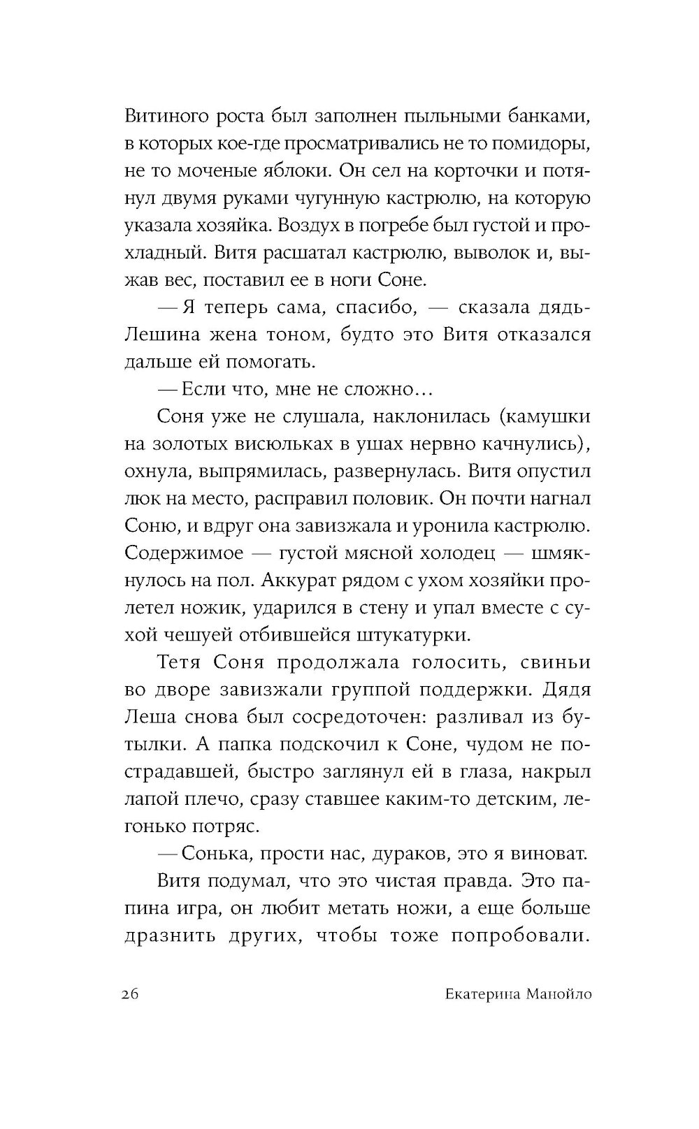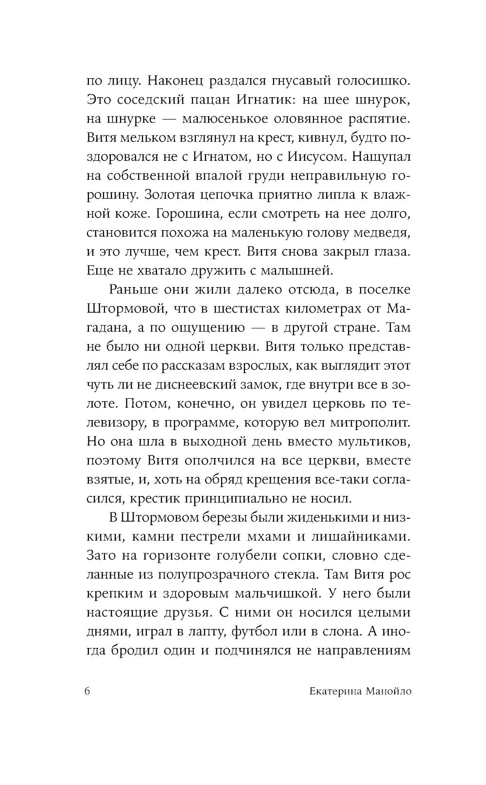 Герой нового романа Екатерины Манойло - мальчик Витя, обладающий необычным даром: он способен чувствовать золото под землей и в воде, отзываясь на его тепло трепетным эхом. Витя родился в посёлке Штормовом под Магаданом, среди золотоносных жил, где местные зарабатывают контрабандой драгоценного металла. Уникальное умение мальчика не может остаться в секрете - им начинают интересоваться злые люди, демоны этих мест. Чтобы спасти ребёнка, его родители решаются на опасное путешествие в поисках другой судьбы. Теперь, за многие тысячи километров от прииска, золото, бывшее в прошлой жизни постоянным спутником и источником силы Вити, становится магическим проводником в необъятном и чуждом мире.| Издательство | Альпина нон-фикшн |