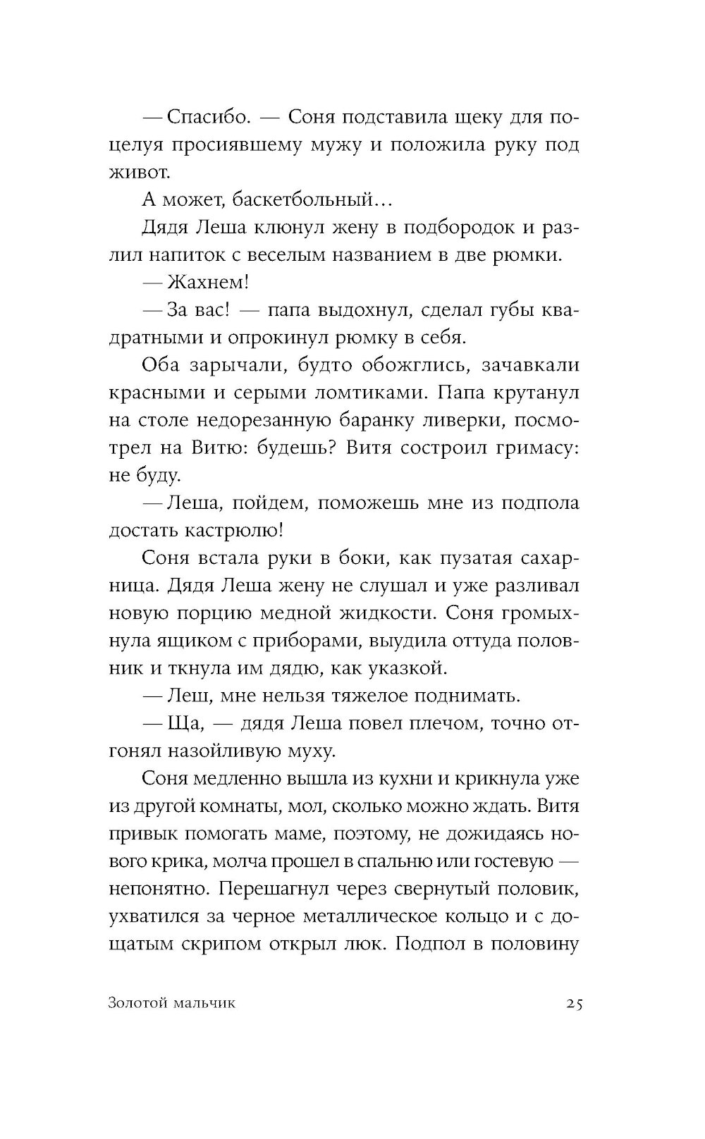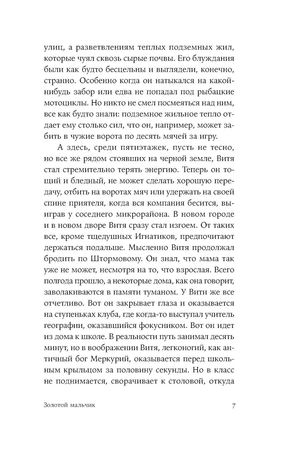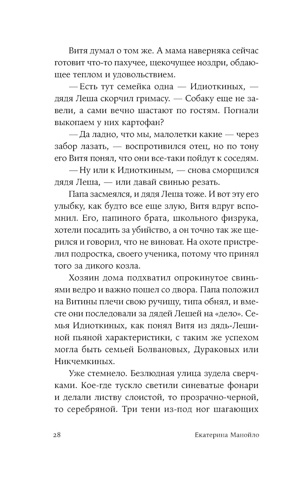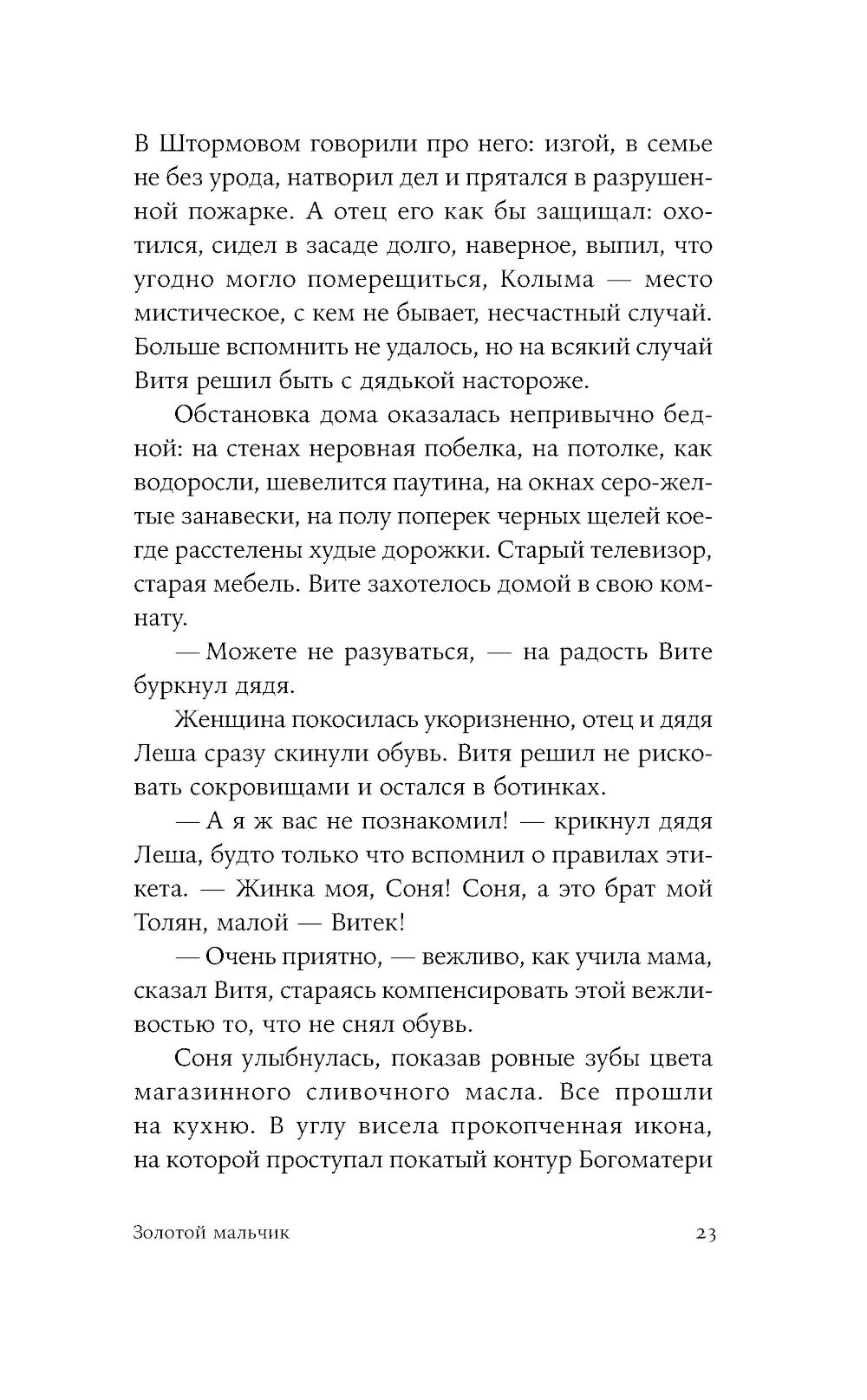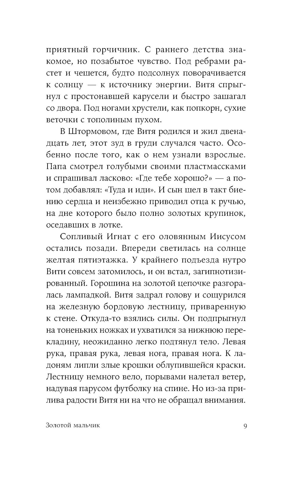 Герой нового романа Екатерины Манойло - мальчик Витя, обладающий необычным даром: он способен чувствовать золото под землей и в воде, отзываясь на его тепло трепетным эхом. Витя родился в посёлке Штормовом под Магаданом, среди золотоносных жил, где местные зарабатывают контрабандой драгоценного металла. Уникальное умение мальчика не может остаться в секрете - им начинают интересоваться злые люди, демоны этих мест. Чтобы спасти ребёнка, его родители решаются на опасное путешествие в поисках другой судьбы. Теперь, за многие тысячи километров от прииска, золото, бывшее в прошлой жизни постоянным спутником и источником силы Вити, становится магическим проводником в необъятном и чуждом мире.| Издательство | Альпина нон-фикшн |