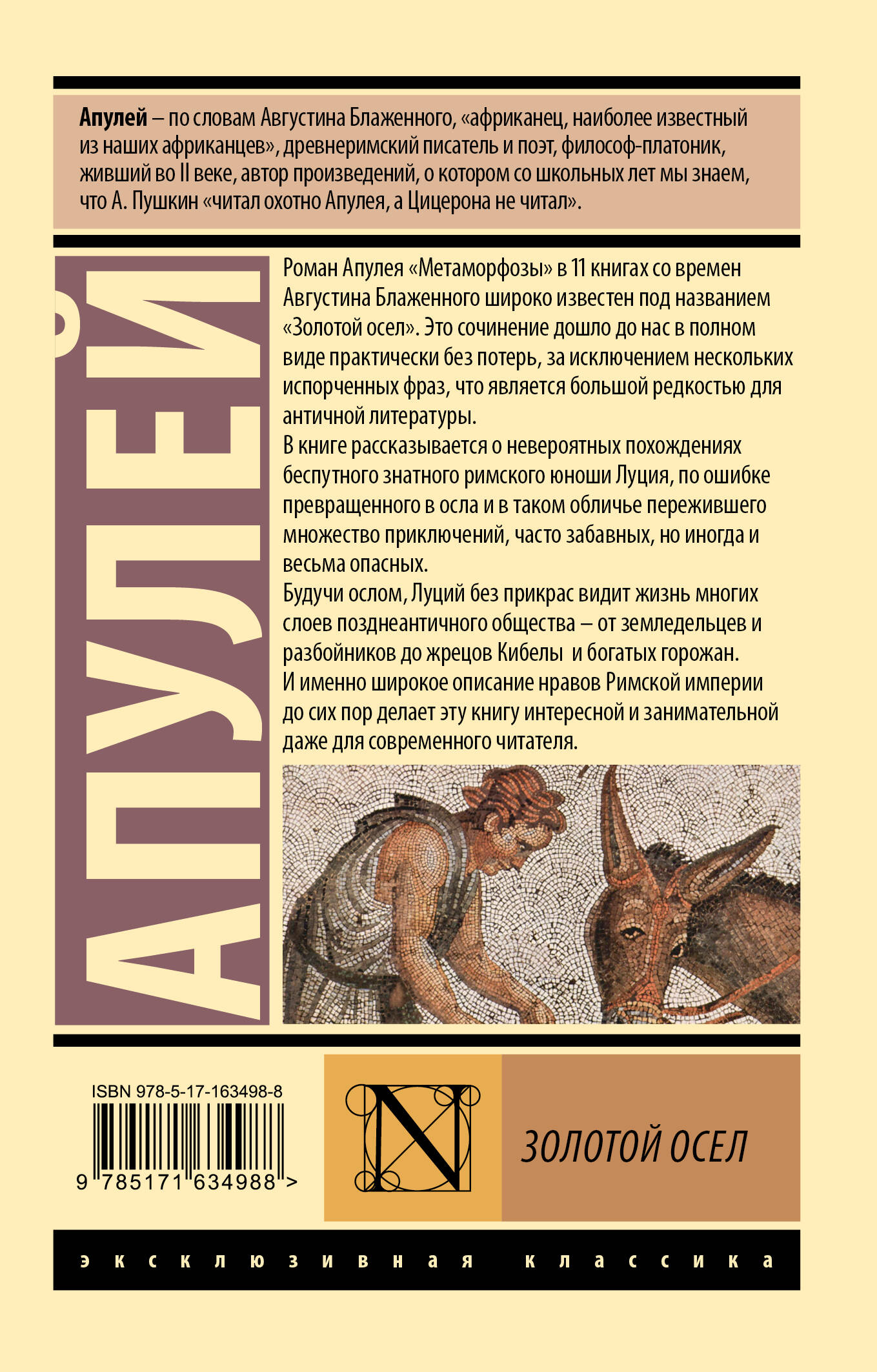 Апулей - по словам Августина Блаженного, "африканец, наиболее известный из наших африканцев", древнеримский писатель и поэт, философ-платоник, живший во II веке, автор произведений, о котором со школьных лет мы знаем, что Пушкин "читал охотно Апулея, а Цицерона не читал". Роман Апулея "Метаморфозы" в 11 книгах, со времен Августина Блаженного широко известен под названием "Золотой осел". Это сочинение дошло до нас в полном виде практически без потерь, за исключением нескольких испорченных фраз, что является большой редкостью для античной литературы. В книге рассказывается о невероятных похождениях беспутного знатного римского юноши Луция, по ошибке превращенного в осла и в таком обличии пережившего множество приключений, часто забавных, но иногда и весьма опасных. Будучи ослом, Луций без прикрас видит жизнь многих слоев позднеантичного общества - от земледельцев и разбойников до жрецов Кибелы и богатых горожан. И именно широкое описание нравов Римской империи до сих пор делает эту книгу интересной и занимательной даже для современного читателя.| Издательство | Издательство "АСТ" |